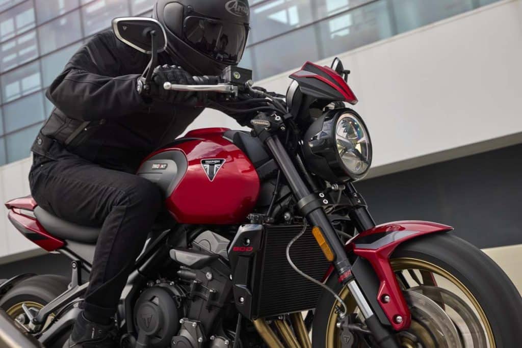 De Trident 800 ziet eruit alsof hij snelheid ademt. Een gespierde naked look met scherpe lijnen, korte kont, opwaarts gebogen uitlaat en een tank die smoelt. Goudkleurige velgen, luxe afwerking en kleurcombinaties als Ash Grey/Diablo Red, Carnival Red/Graphite en Jet Black maken het geheel af.