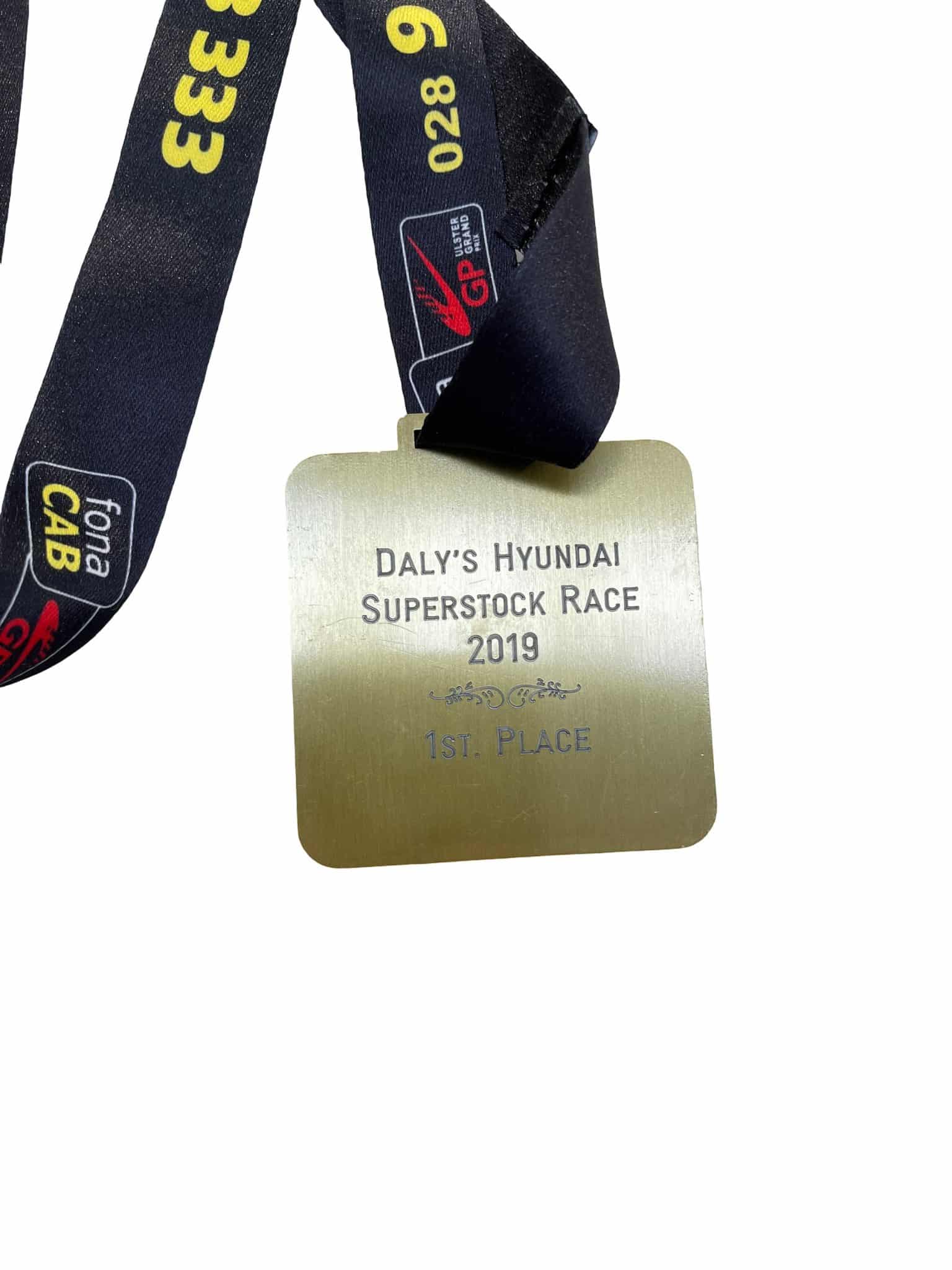 Wie de veiling wint, krijgt meer dan alleen de motorfiets. Bij de BMW horen een ‘1st Dunlop’ finisher’s cap en een medaille van de Ulster Grand Prix ‘Daly’s Hyundai Superstock Race 2019′ — zeldzame objecten die de beleving voor een verzamelaar compleet maken.
