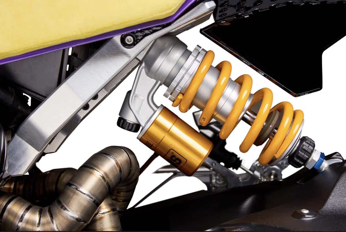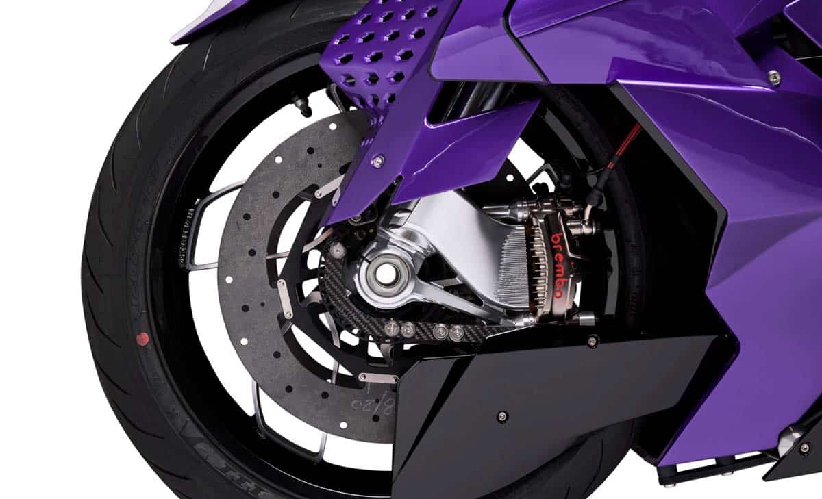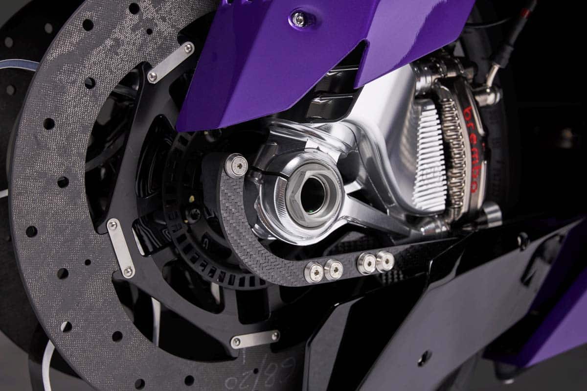 Onder dat futuristische pantser schuilt pure racehardware. Brembo GP4-MS-klauwen grijpen in op keramisch-carbon schijven, rechtstreeks geleend uit de MotoGP-wereld. Zoveel power op een straatlegale machine is bijna onfatsoenlijk.