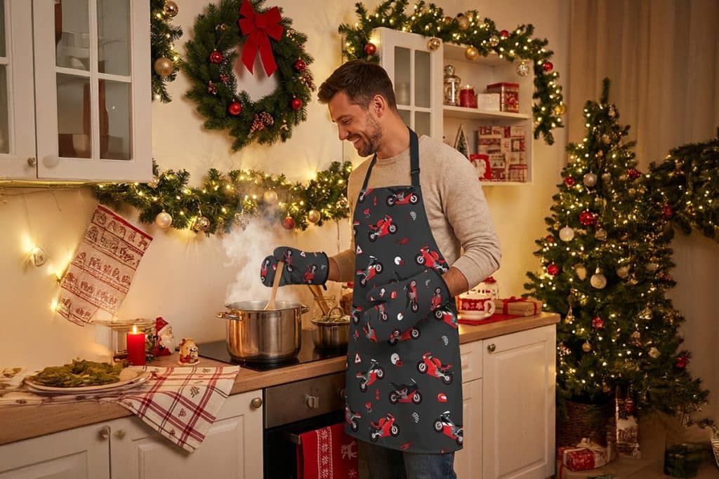 Maak het kerstdiner extra uniek met dit kookschort en bijbehorende ovenwanten met motormotief. Perfect voor de motorrijdende chef die zijn passie ook in de keuken wil laten zien. Het praktische schort en de stijlvolle wanten maken koken leuk en helemaal in stijl. Een origineel cadeau om de feestdagen net dat beetje extra te geven!