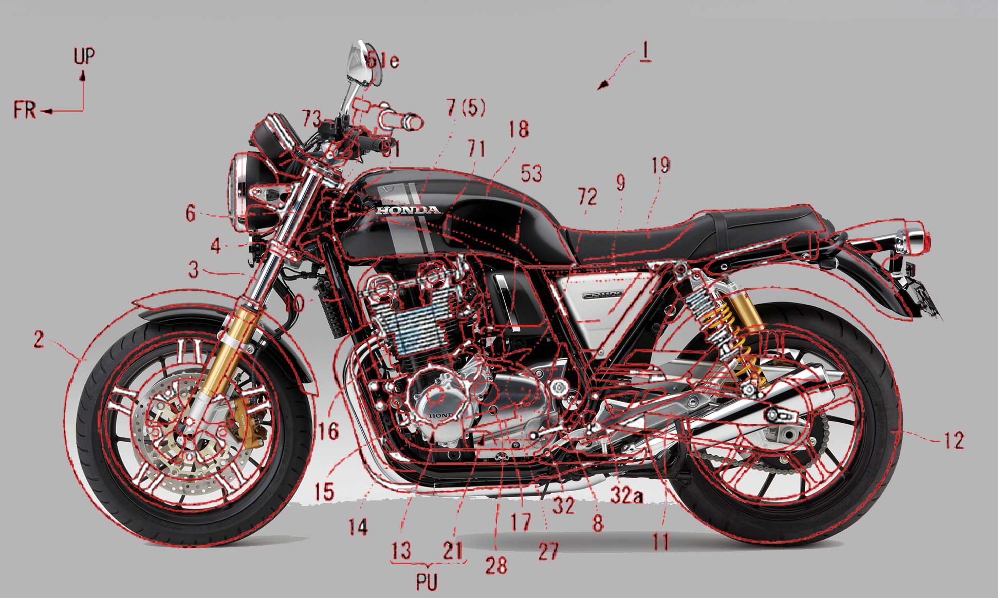 Het door Honda ingediende octrooi, dat geïllustreerd wordt in een CB1100, biedt een interessant alternatief voor de traditionele versnellingsbak. Het vereenvoudigt het schakelen en het heeft niet de complexiteit (en eerlijkheidshalve ook niet de functionaliteit) van het DCT-systeem. In principe gaat het om een traditionele versnellingsbak, die je gewoon met het schakelpedaal kunt schakelen, maar waarvan de koppeling automatisch wordt bediend, Een koppelingshendel ontbreekt dan ook op het stuur.