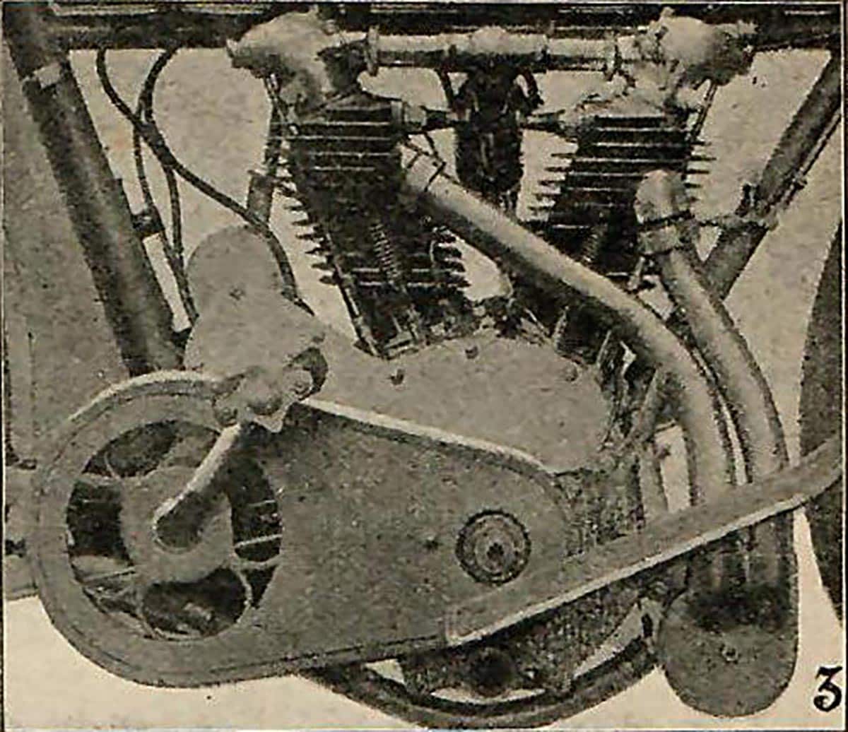 III. De motor van de Yale, eene machine, gelijk aan de Indian, Harley-Davidson en Pope, die te Amsterdam geïmporteerd zal worden. De speciaal korte uitlaatpijpen volgen beiden eene voorwaartsche richting, waar zich de vrij groote knalpot bevindt, op dezelfde plaats, waar men dien gewoonlijk bij Engelsche één-cylinder machines aantreft. Verder stepstarter, als ook ingesloten kleppenmechanisme.