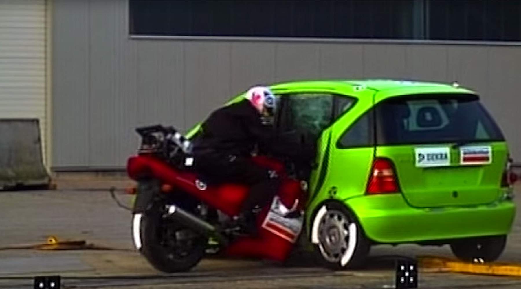 Onderstaande video laat goed zien wat er gebeurt wanneer een motor in de flank van een auto rijdt: