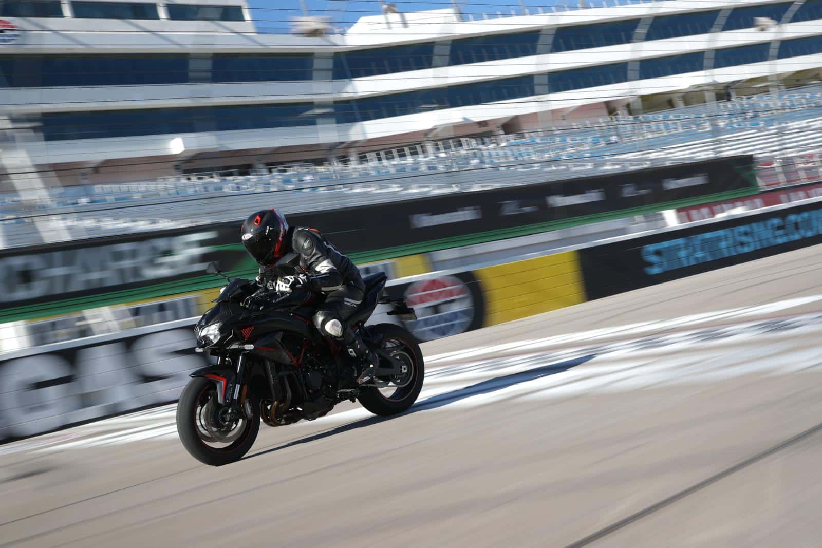 Kawasaki laat ons in de Verenigde Staten kennismaken met de Z H2. Gokwalhalla Las Vegas en de hypernaked zijn voor elkaar geschapen. Beide zijn extravagant, vet, overdadig en over the top. Vegas heeft wel een serieus nadeel voor een introductie van een überpotente naked: de Amerikaanse politie schiet je af als je iets harder rijdt dan de dodelijk saaie maximumsnelheid. Kawasaki lost dat op door naast de nodige straatkilometers ook circuitsessies in te lassen. Om het feest af te ronden gaan we los op de oval van de Las Vegas Motor Speedway. Klinkt dat onbekend in de oren? Deze kombaan van 2,4 kilometer lengte heeft bochten die tot twintig graden zijn verkant. Tijdens Nascar-races razen de wagens hier met 350 km/u overheen. Alsof een Z H2 van zichzelf al niet spannend genoeg is…
