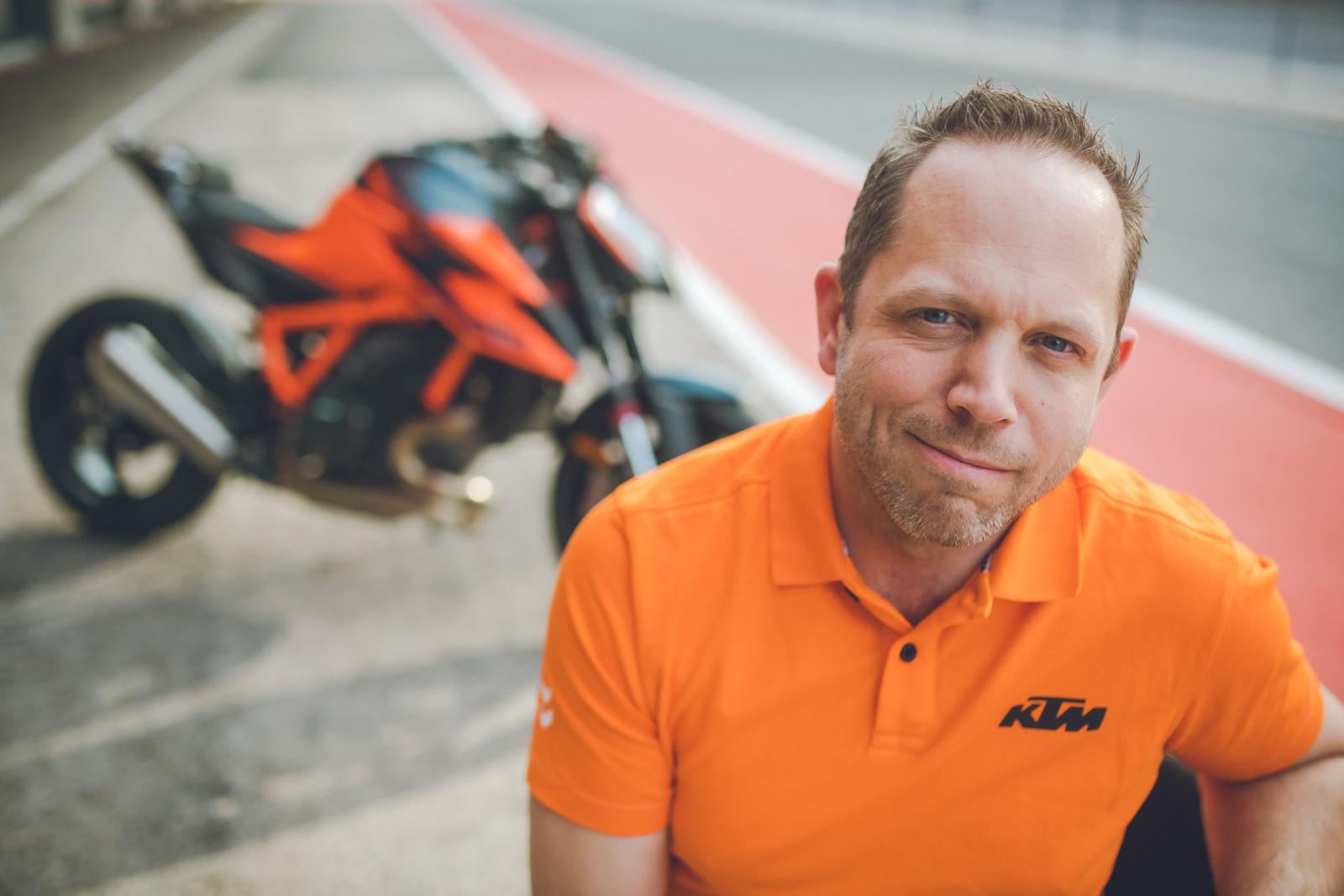 Hij is al jaren een vertrouwd gezicht bij introducties van nieuwe Oostenrijkse modellen. Motoren dan, wel te verstaan. De Nederlander Adriaan Sinke (43) woont met zijn gezin in de buurt van Mattighofen en bekleedt de functie van product marketing manager bij KTM.