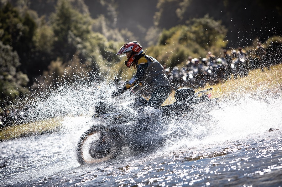 Dat het erg verschillend rijdt voor wat in de basis toch echt dezelfde motorfiets is. De GT is zoals geschreven echt de machine die je wilt mocht je niet van plan zijn ooit verder dan het grasveld van de camping offroad te rijden. Met zijn smallere Marzocchi-voorpoten en progressieve achtervering (enkel op het Pro-model) is de wegligging à la minute aan te passen naar jouw wensen. Hoewel we het niet hebben geprobeerd voelt hij krachtig genoeg om ook een passagier en bepakking met gemak mee te nemen zonder dat het de rijervaring teveel zal beïnvloeden. De Brembo Stylema-remmen doen hun werk zoals te verwachten naar behoren, al grijpt het ABS aan de achterzijde misschien iets te rap aan voor mijn smaak. De Rally heeft na een stukje rijden een paar draaien aan de veervoorspanning nodig om met die enorme veerwegen stabiel op een bocht aan te remmen en uit te accelereren. Maar heb je dat eenmaal op orde dan rijdt hij absoluut goed. Toch is de GT zeker weten de betere als je je op asfalt begeeft. Offroad valt met de Rally op dat het gewicht erg makkelijk te hanteren is. Dat is natuurlijk te danken aan het motorblok dat lager en verder naar voren is komen te hangen. Het zwaartepunt is daardoor verlaagd en doordat het gewicht ook iets afgenomen is maakt dat hij zich hierdoor met minder moeite laat berijden.