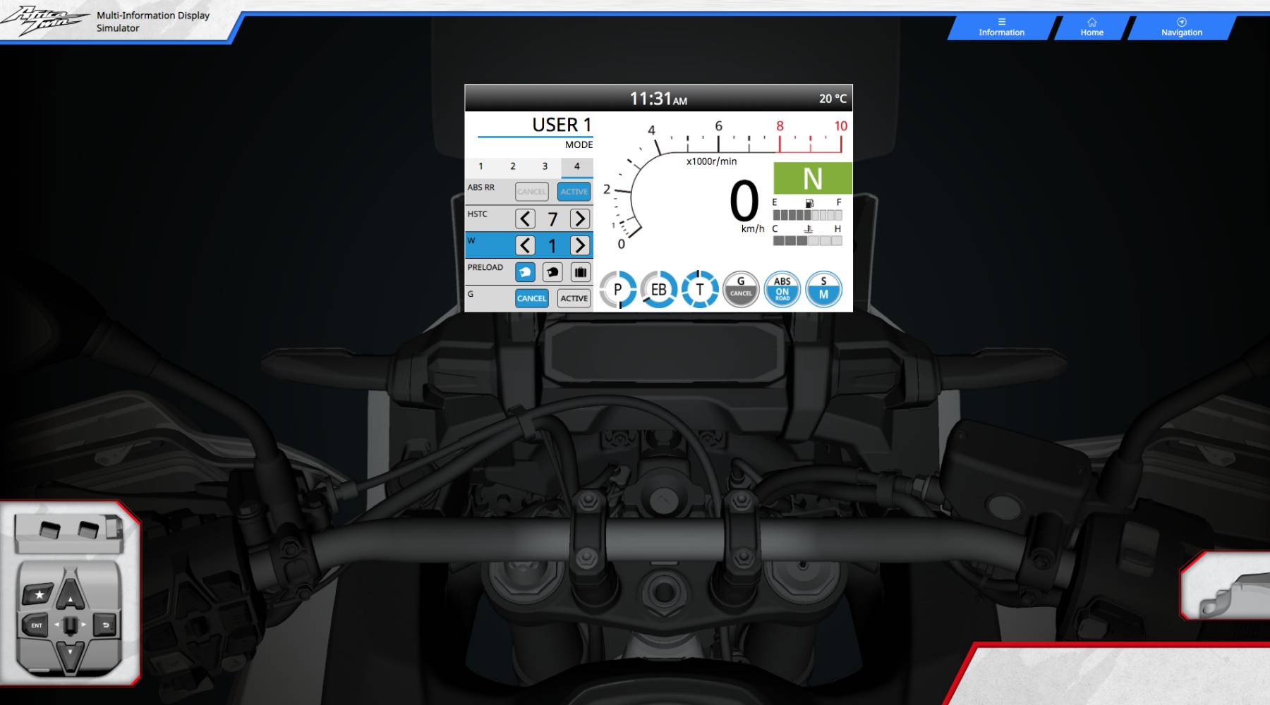 De Technology Simulator is te vinden door naar beneden te scrollen op de Africa Twin pagina van Honda USA. Klik vervolgens op ‘Check it out’, kies een taal en selecteer Kilometer/Celsius of Mijl/Fahrenheit en klik op ‘Start’. Om vertrouwd te raken met de simulator word je eerst aangemoedigd de secties ‘Informatie’ en ‘Navigatie’ te verkennen. Die zijn toegankelijk via knoppen in de rechterbovenhoek van het scherm.