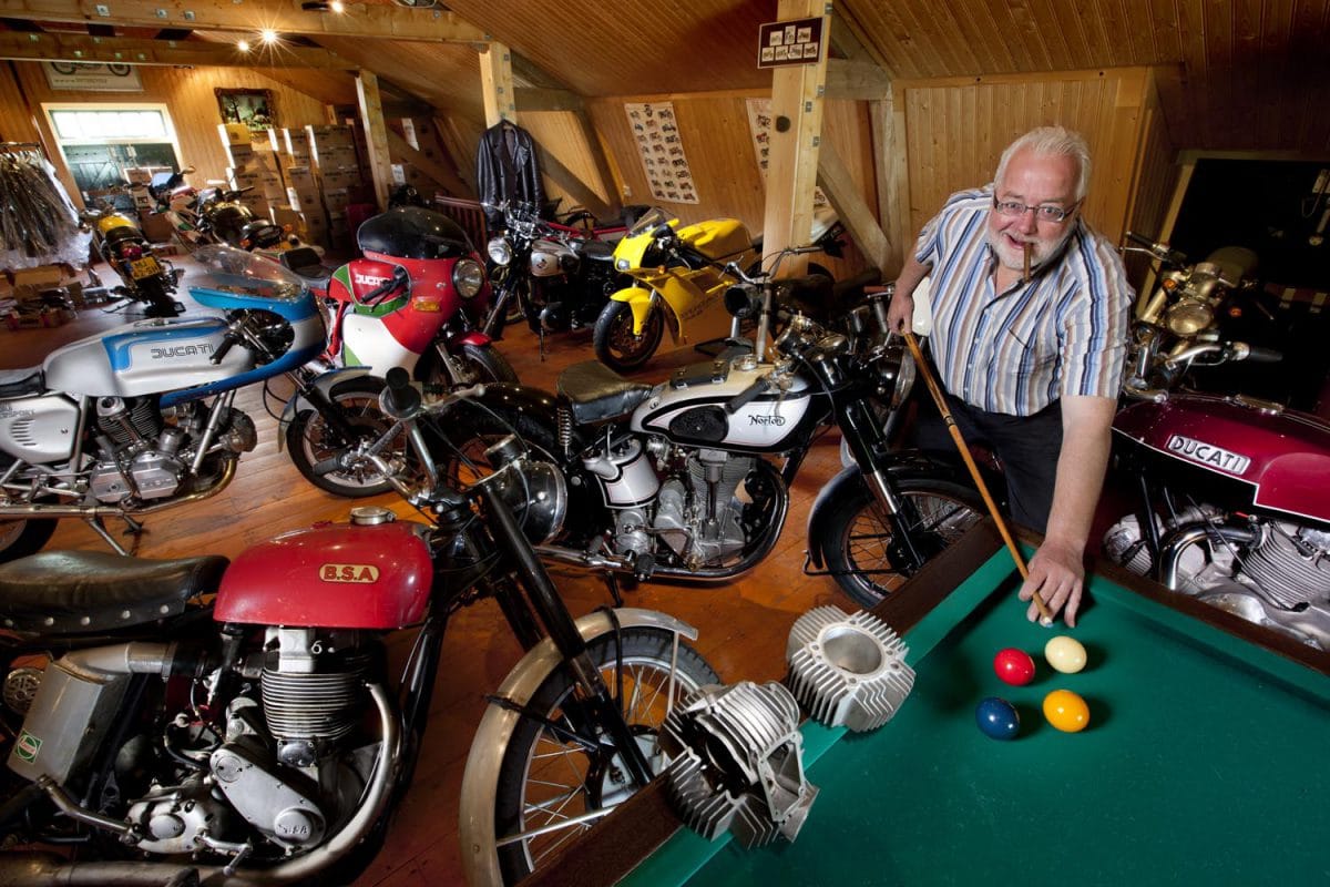 Harm bestiert zijn motorcollectie weliswaar ook zakelijk – soms gaat er een motor van de hand en hij verkoopt wat onderdelen – maar de collective laat wel zien dat passie hier met een hoofdletter wordt geschreven. Een BSA Goldstar crosser – ‘op mijn zestiende gewonnen met een potje kaarten’ – een Ducati GT, en paar Ducati Scramblers en een stel bloedjes van klassieke Nortons, verraden zijn bandeloze passie voor klassiekers. Bij elk merk heeft Harm een verhaal, hartstochtelijk, maar met mate. ‘Je zult bij mij geen tranen zien als ik afscheid neem van een motor. Ooit had ik er veertig. Ik geniet meer van de herinneringen aan alle plezier dat ik eraan heb beleefd, dan dat ik treur om het afscheid. Te veel hechten geeft verdriet.’