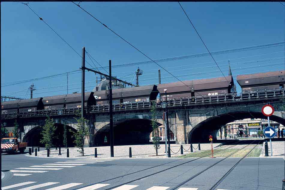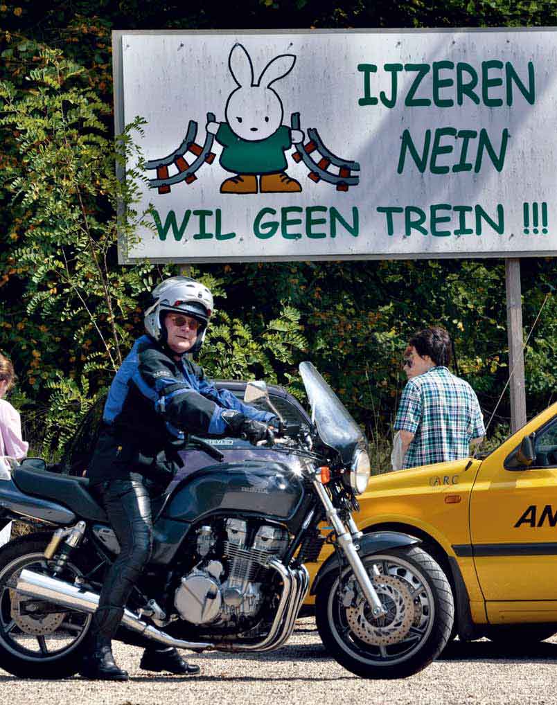 Even later worden de 750 cc’s weer aangesproken en snor ik langs de spoorrails door de plaatsen Kessel en Nijlen. Dit laatste oord wordt zowat in tweeën gesplitst door de IJzeren Rijn. Ik denk dan ook dat de bewoners nu niet bepaald staan te juichen als hier binnenkort dagelijks weer tientallen goederentreinen doorheen denderen. Achter Nijlen gaat de rit voorwaar door wat dichter loof. Maar pure natuur is ver te zoeken of je moet doelen op de vele relaxclubs en sekspaleizen die de weg naar Herentals een speciale appeal geven. Hoewel Herentals een fraai stadhuis met belfort (een civiele toren met luidklokken) en een begijnhof bezit – het was ooit de hoofdstad van de Kempen – heeft het in baksteen gebouwde spoorwegstation duidelijk minder allure dan dat van Lier. Vervolgens toer ik door de dorpjes Sint-Jozef-Olen, Onze-Lieve-Vrouw-Olen en Larum de spoorlijn Antwerpen – Mönchengladbach achterna. Bij dit eerste plaatsje ligt ingeklemd tussen de spoorrails en het Herentals-Bocholtkanaal het industriecomplex van Union Minière, een fabriek van non-ferrometalen dat zijn ertsen nog steeds uit Zaïre, het vroegere Belgisch-Kongo, betrekt.