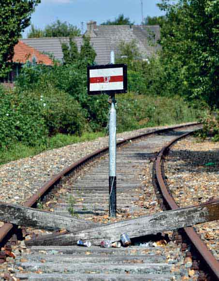 De ontdekkingstocht naar de IJzeren Rijn gaat verder over de Lozerheide en de zandvlakten van de Budeler Bergen. In Weert gaat de rit langs het in 1913 gebouwde NS-station, een vreemd gebouw waarbij de perrons op een hoger gelegen talud zijn gesitueerd. Eén jaar eerder was de nieuwe lijn Eindhoven – Weert gereedgekomen die in de laatste plaats dus aansloot op de IJzeren Rijn. Tussen Weert en Roermond wordt de oude IJzeren Rijn nu druk gebruikt als onderdeel van de Intercityverbinding Eindhoven – Maastricht. Voordat ik over de Maasbrug de Limburgse domstad binnen rij, wordt eerst nog een bezoek gebracht aan het dorpje Horn dat sinds de 13de eeuw wordt bewaakt door een imposant kasteel. Meteen kan ik dan ook een kiek schieten van de spoorbrug bij Buggenum waar de IJzeren Rijn de Maas kruist. In Roermond ontdek ik, juist achter het spoorwegstation, de plek waar de IJzeren Rijn verder loopt naar Duitsland. Sinds 1994 liggen hier over het enkelspoor twee houten bielsen die duidelijk moeten maken dat er geen treinen meer over de rails tuffen.