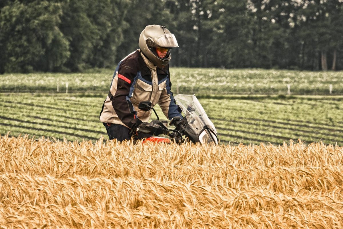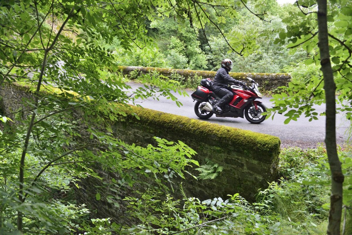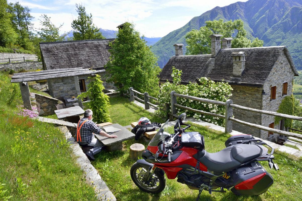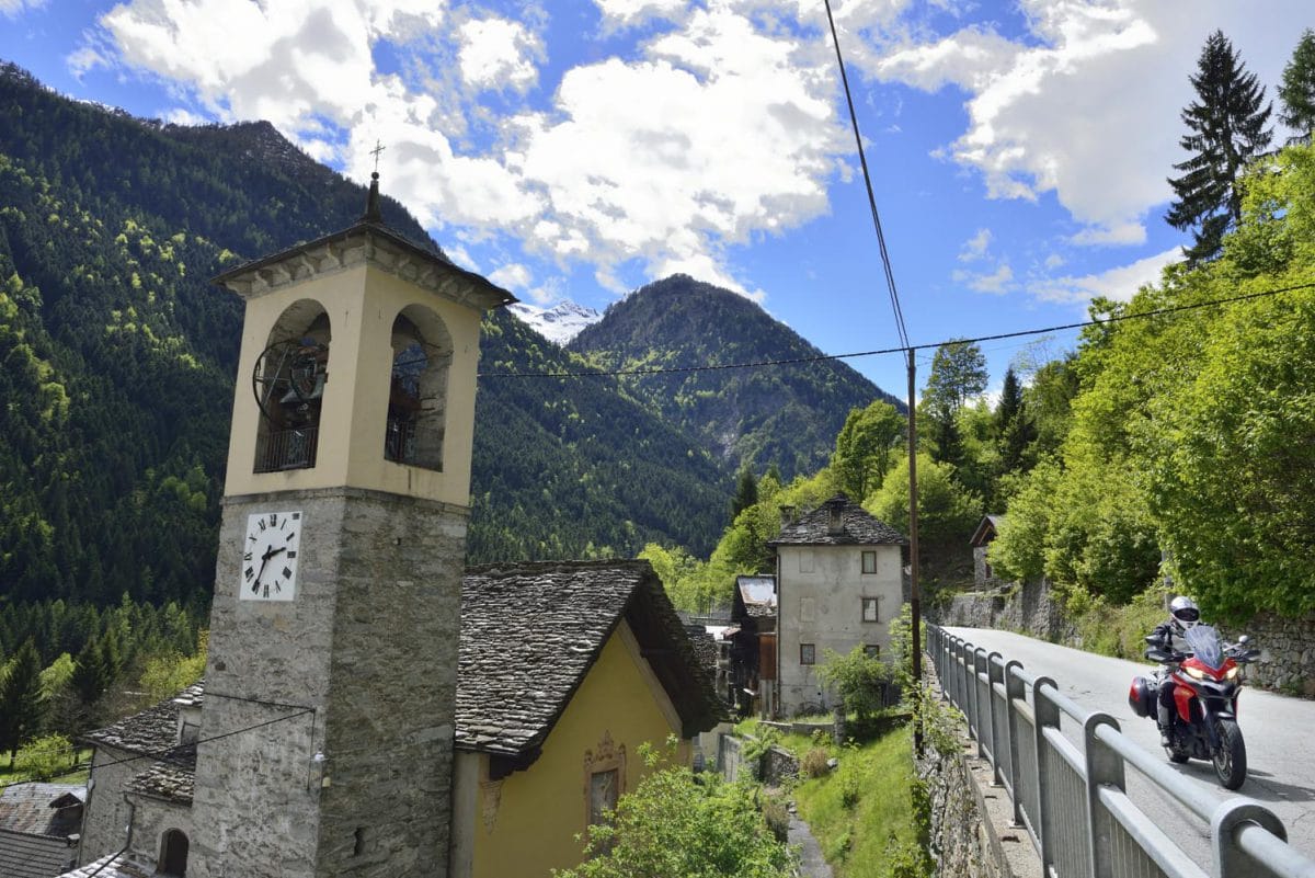 Naar de zijdalen in het noorden lopen twee verdere landweggetjes, die ten zuidwesten van Domodossola diep in de bergketen doordringen; tot onder een cirkelvormige, stekelige rotswand die er uitziet als een kettingwiel, bedekt met sneeuw als een laagje witte kettingspray. Bijzonder fraai is – afgezien natuurlijk van het landschap – dat je hier geen doorgaand verkeer aantreft! Zo halen we in Valle Anzasca alleen een keer een arbeider in die zijn Fiat Ducato de sporen geeft alsof deze zelfontbrander partij zou zijn voor de rode diva uit Bologna. De bergwand van de 4.634 meter hoge Monta Rosa aan het einde van het dal bij het skiresort Macugnaga kan wel concurreren, maar dan met de zich niet ver hier vandaan bevindende Matterhorn, die hij met 156 meter overtreft. Aan de andere kant: wat kunnen zulke getallen jou schelen als je lekker relaxed op het terras van herberg Mondo d’Oro in Ceppo Morelli zit, achtte een heftige broodmaaltijd, met daarnaast grappige figuurtjes op de suikerzakjes voor je cappuccino. Voor de afwisseling is het ditmaal niet de twin die het trommelvlies in de tunnel masseert met zijn prachtige timbre, maar de slagen van de klokken van de Chiesa di Croppoe. Ook in het volgende dal, de Val di Antrona, zijn de motorfietsen bijna alleen op een met louter chlorofyl doordrenkte bodem. Rijgenot in voorjaarsdecor. “Alles is zo mooi groen hier”, zou Nina Hagen misschien kwelen, om vervolgens niet te kunnen beslissen of ze aan het einde van het dal links naar het Lago d’Antrona en het Lago di Campliccioli of rechts naar het Lago Alpe del Cavalli zou gaan. Of dat ze de wandelschoenen onder zou binden en over de Antronapas naar het Zwitserse Saastal zou hiken.