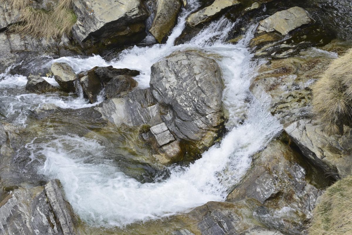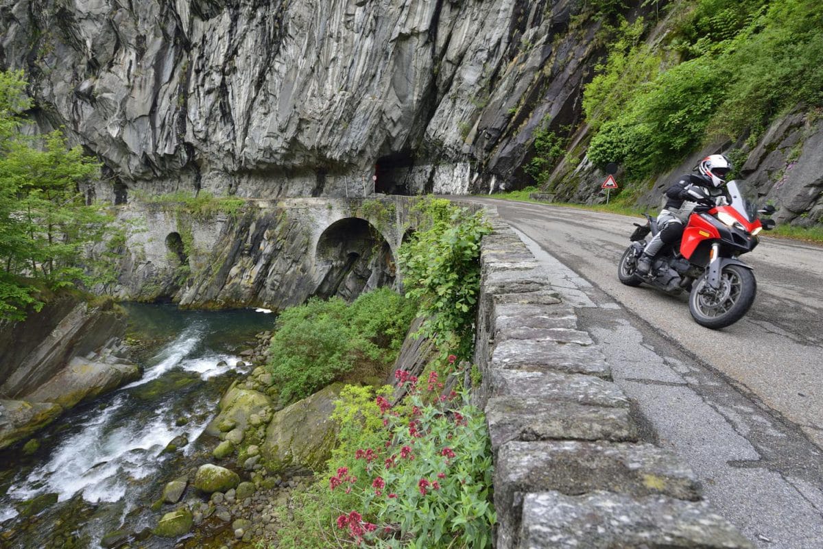 We besluiten echter om de karavaan niet helemaal naar Simplon te volgen. In plaats daarvan sturen we de Multistrada 950 naar het noordelijkste puntje van de Piemonte, die zich als een omgekeerde V in het rijk van de drieduizenders om de Passo di San Giacomo vleit. Die ligt alweer een flinke steenworp van de Nufen-pas. De geplande verbindingsroute met Tessin is nooit gebouwd, zodat de SS659 door Valle Antigorio en Val Formazza uiteindelijk als een cul de sac doodloopt achter het oeroude valleidorp Riale en kort voor San Giacomo aan het Lago di Toggia. Op het meer ligt nog een dun laagje ijs, maar dankzij verkeersluwe, bochtige weggetjes en een vriendelijk voorjaarszonnetje wordt het ons onderweg toch nog warm rond het hart. Terwijl een heftige slingercocktail bij Foppiano de Brembo’s kersrood laat kleuren en de botanische coulissen al in volle bloei staan, brengt de Cascate de Toce, met 143 meter één van de hoogste en voor de vele bewonderaars ook één van de mooiste watervallen in de Alpen, landschapsliefhebbers in vervoering. Dat doet hij echter alleen op bepaalde, voor toeristen relevante tijden, aangezien de fotogenieke watermassa doorgaans wordt omgeleid voor het opwekken van elektrische energie.