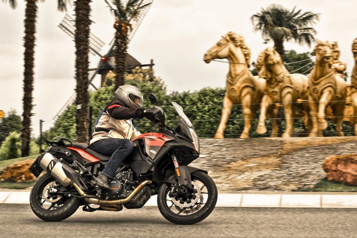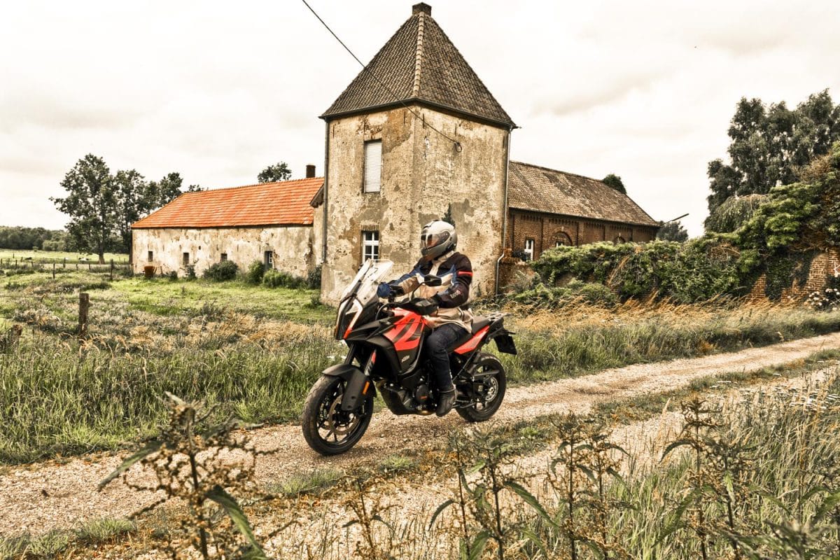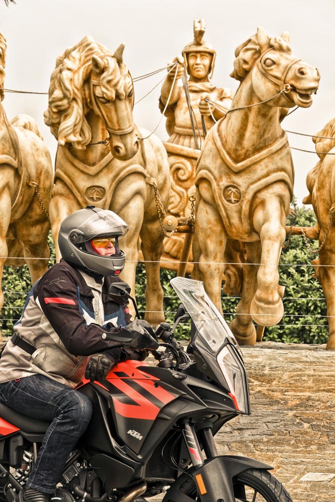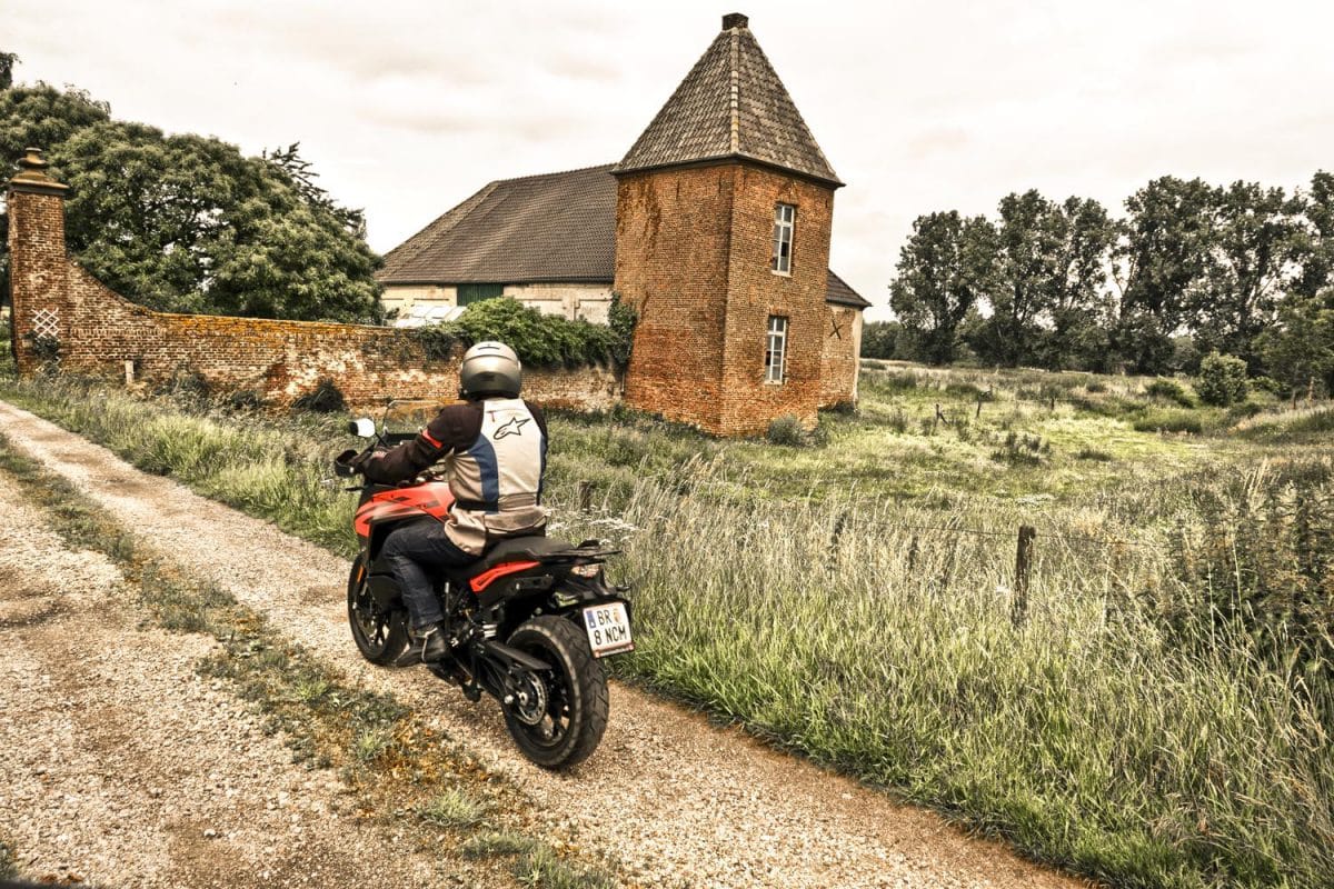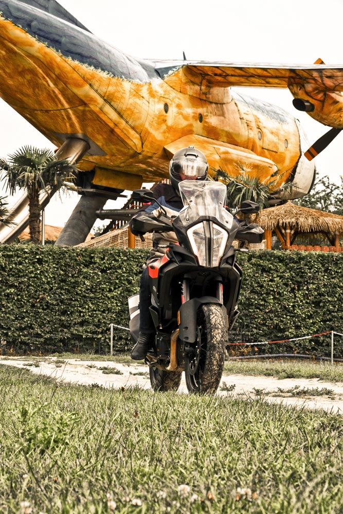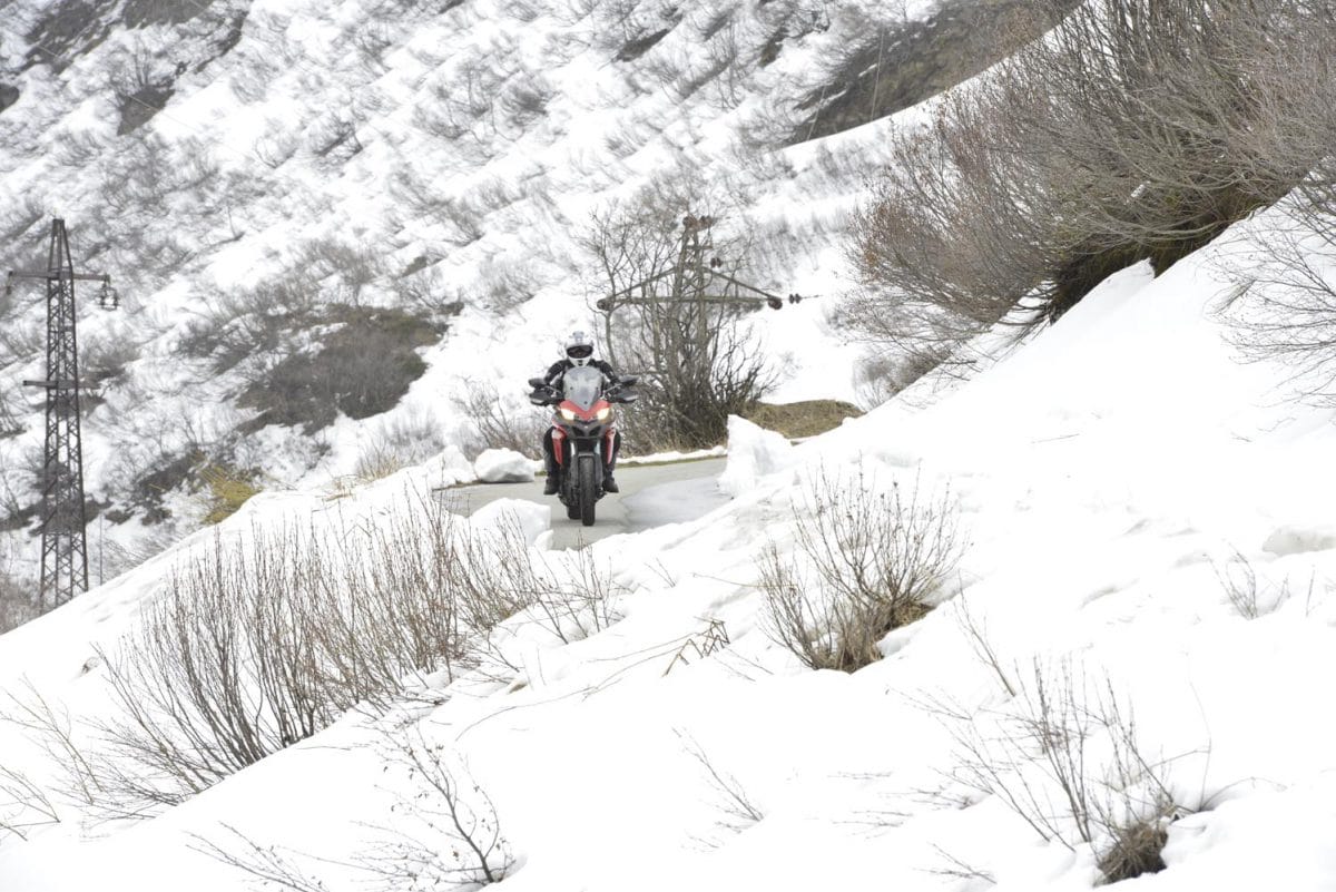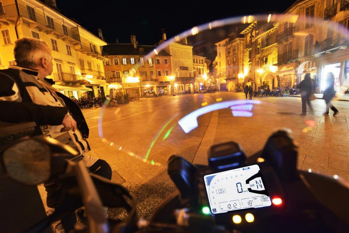 Voor het laatste breedbeeldspektakel van vandaag dalen we weer 1.700 meter af naar het nu verkeersvrije Piazzo Mercato. Het is een kring van grillige façades van winkeltjes, bars en cafés, ondergedompeld in een romantisch, geeloranje schijnsel van de lantaarns: een zeer geslaagd 360-graden-kunstwerk, dat scherp contrasteert met het hoogtechnologische tft-display van de Ducati. Wie niet verzadigd is van het fraaie beeld kan zich verzadigen met een heerlijke maaltijd in Ristorante Bistrot. Daarna moeten we in het donker terug naar ons huttendorp La Tensa, waarbij we op het laatste deel van de route worden getrakteerd op een offroadpassage, zodat de veerwegen van de vorkpoten nogmaals op de proef worden gesteld.