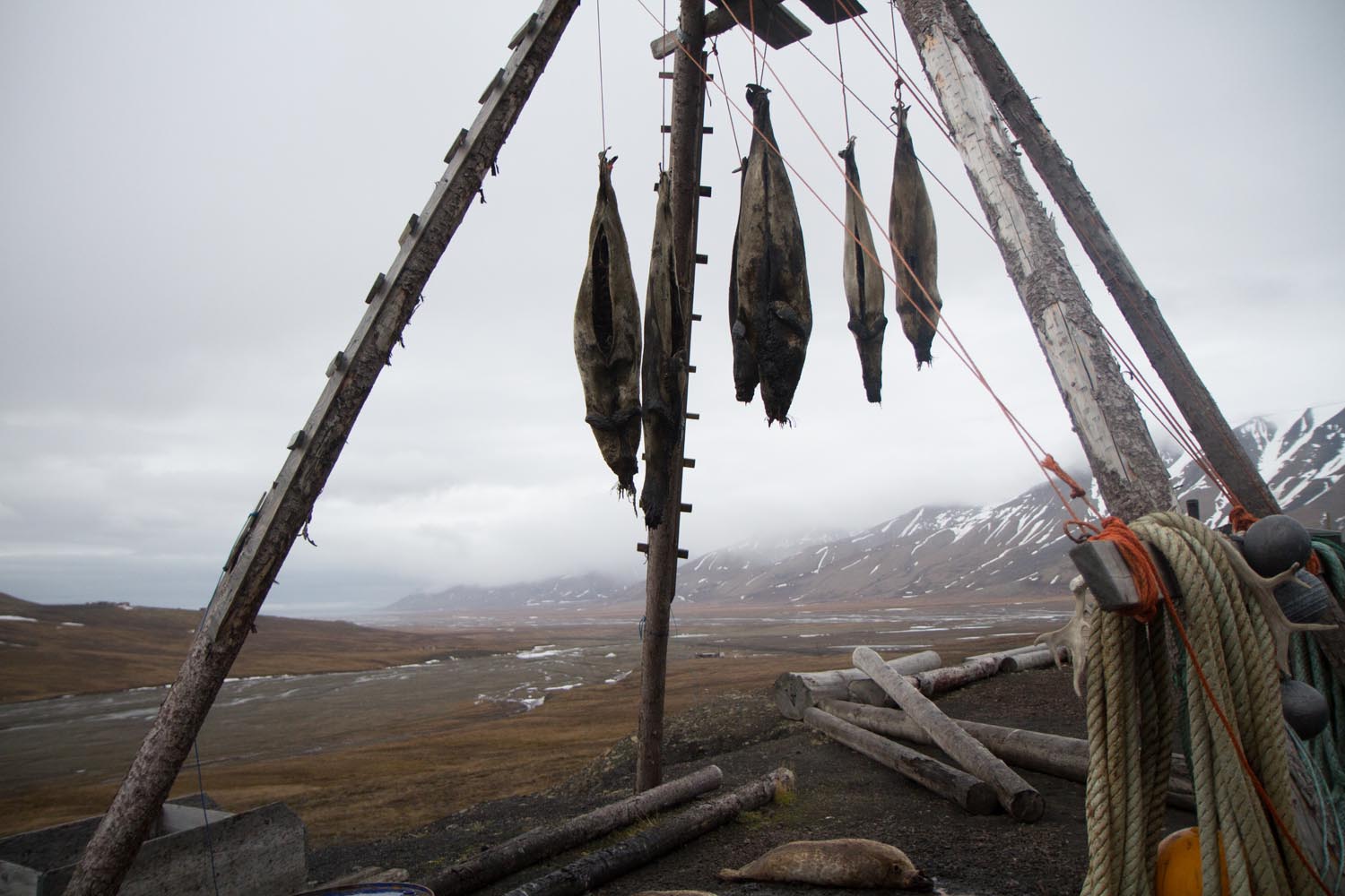 Aan het eind van het dal gaat de weg flink omhoog. Bij de eerste haarspeldbocht verstijf ik opnieuw. Vlak langs de weg bungelen zes dode zeehonden aan een touw. Ze zijn bedoeld om ijsberen af te leiden van de sledehondenkennel die erachter ligt.