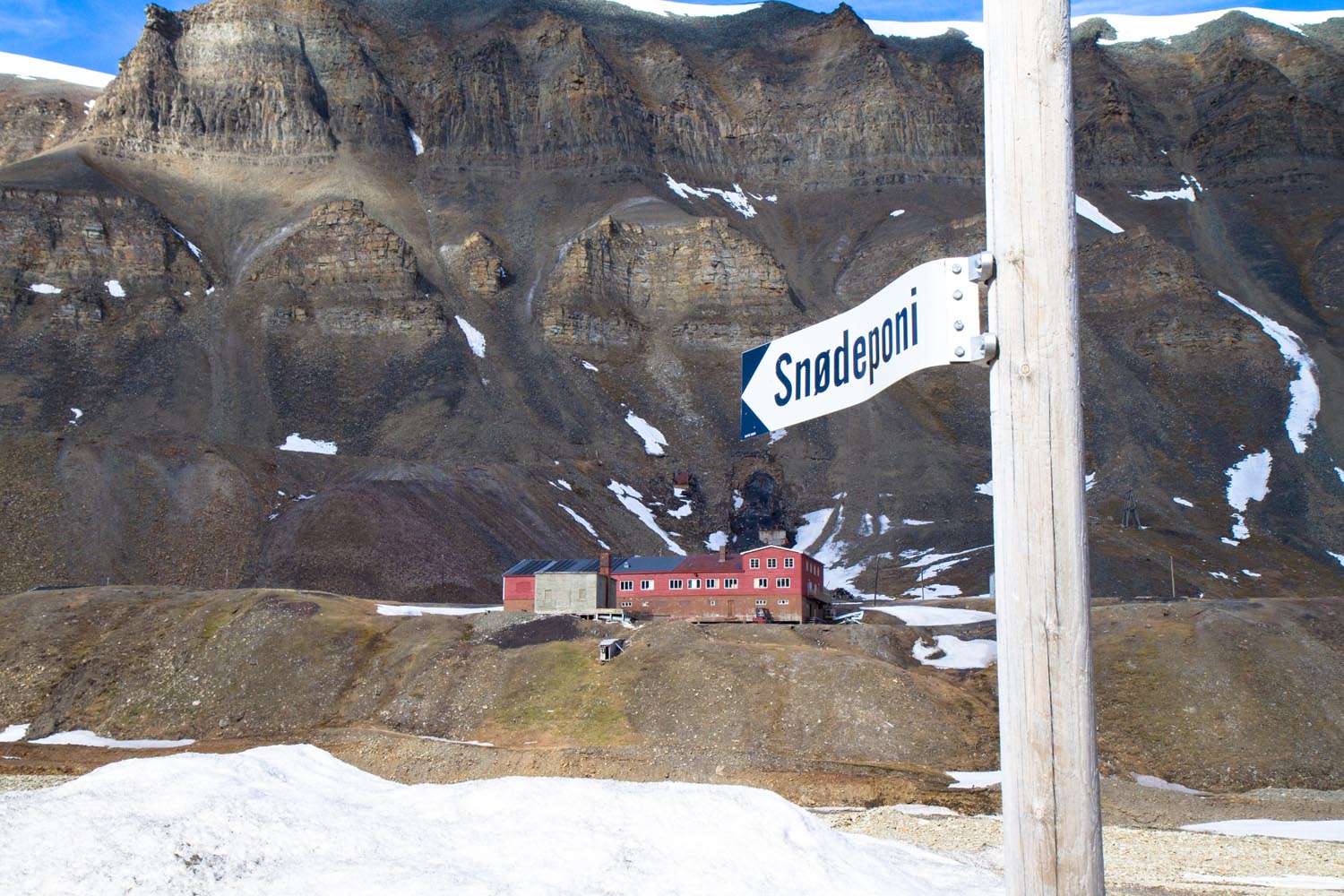 Een slagboom geeft aan dat de weg hier echt ophoudt. Voor me liggen alleen nog maar honderden kilometers sneeuw en ijs. In het felle zonlicht schittert en sprankelt alles hier. In de achtergrond ligt de blauwe Adventfjord, met zijn spitse blauwe bergen en gletsjers die tot zeeniveau komen. Het komt misschien omdat ijsberen mijn zintuigen wijd hebben opengezet, maar ik ervaar het als intens mooi.