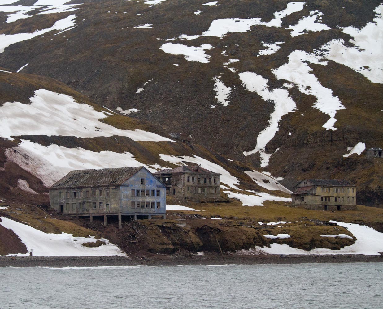 Na een kilometer of tien zie ik de Operafjellet. Een vliegtuig vloog hier in 1996 tegen de top van 900 meter. Niemand van de 141 inzittenden overleefde het. De passagiers waren Oekraïense mijnwerkers, die in de twee Russische plaatsjes van Spitsbergen werkten: Barentsburg en Pyramiden. Als gevolg van het ongeluk zou Pyramiden uiteindelijk een spookdorp worden.