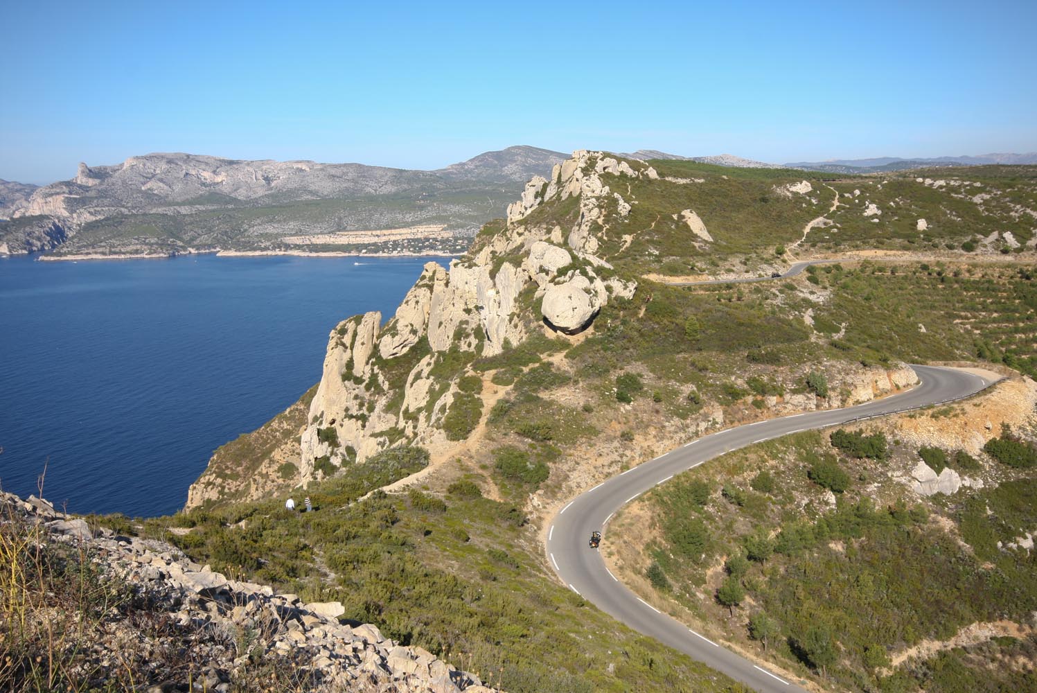Het heet – uiteraard – de Route de Crêtes en loopt van La Ciotat naar Cassis. Bij aankomst stormt het zo hevig dat de weg is afgesloten. Als de slagboom de volgende morgen weer omhoog gaat, ben ik de eerste die gretig naar boven gaat. Daar, op een kleine 400 meter hoogte, wachten uitzichten over duizelingwekkend steile kliffen waaraan de eerste bergbeklimmers hangen. Achter me ligt La Ciotat spierwit in de zon te schitteren en naast me zie ik wijngaarden met het Massif de Baume op de achtergrond. Voor me de onwaarschijnlijk blauwe Middellandse zee en geelrode bergpunten die door de wind achterover lijken te zijn geblazen. Over de haarspeldbochten in de verte komen de eerste motoren uit Cassis me al tegemoet, want dit is 12 km puur rij- en kijkplezier. En ook de climax en het einde van bijna 400 km Côte d’Azur.