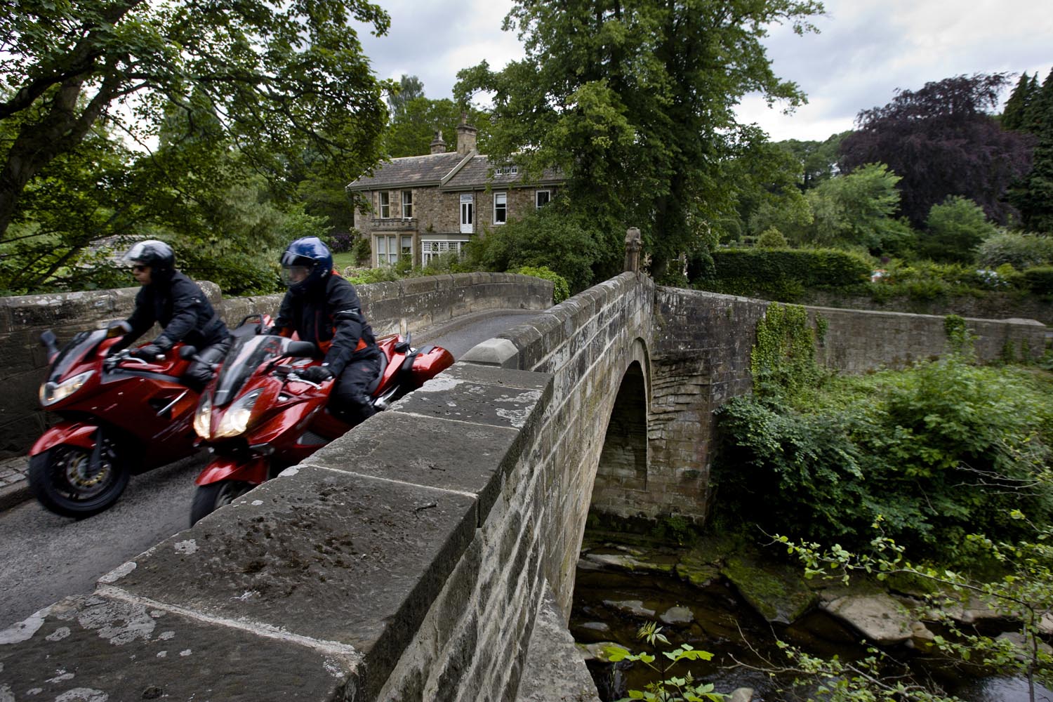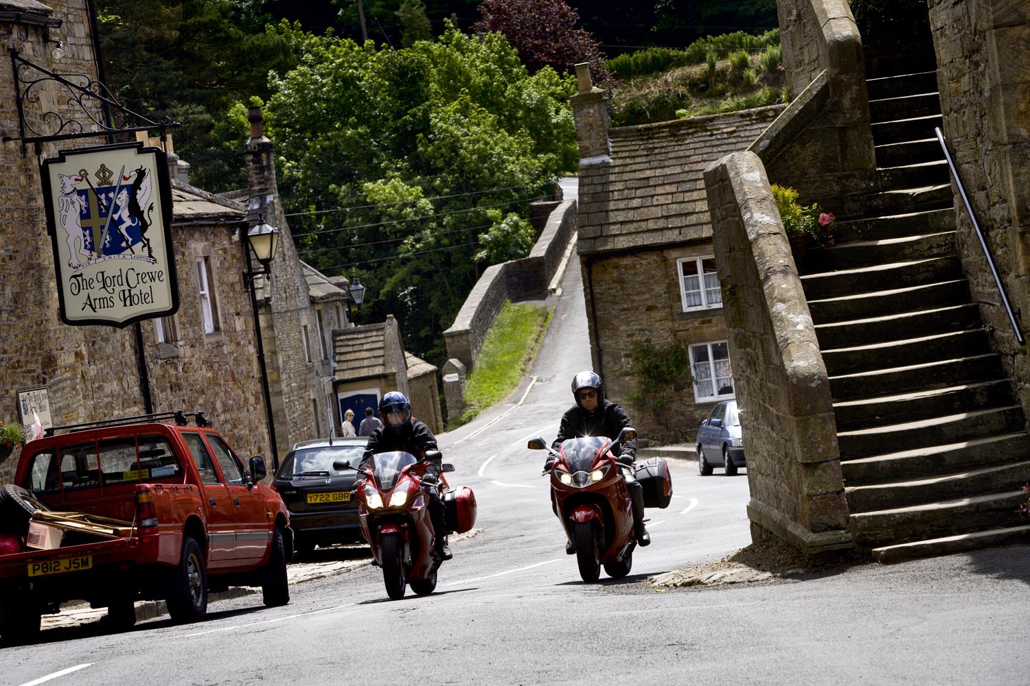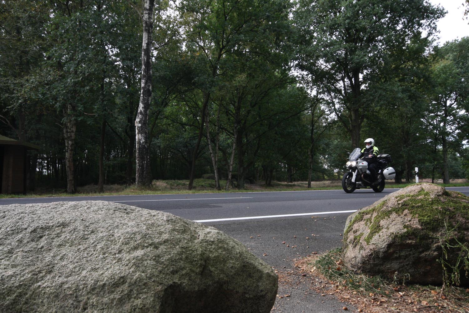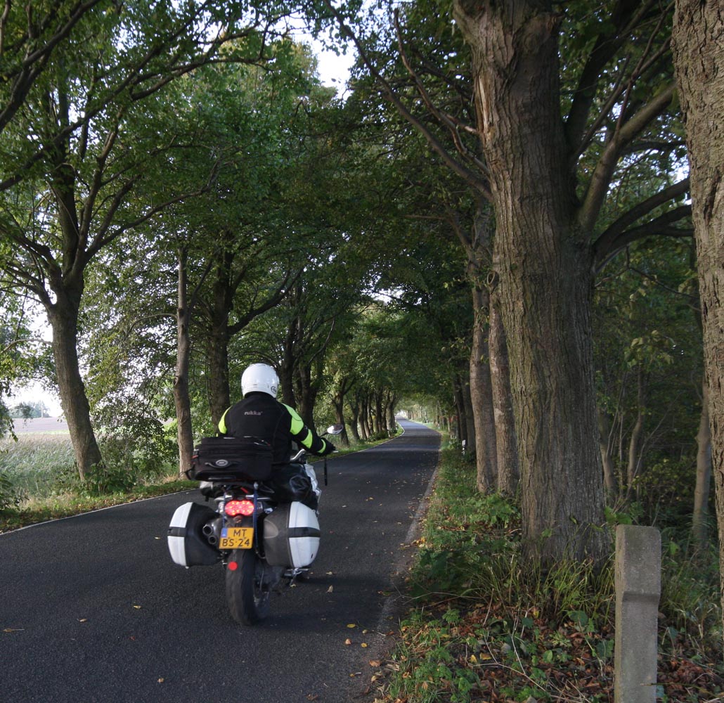 De Triumph vreet een helling, maakt scherp een bocht rechtsom naar beneden, duikt even in de vering, sprint een stukkie rechtuit en klimt meteen weer in een lange linkerbocht over een bult die ik in m’n buik voel. Mooie bochten en asfalt met goed grip, de wegen lijken aangelegd, louter en alleen om ervan te genieten: motorrijden in Engeland doe je met een grote smile. Weer of geen weer, het overtreft de beste kermisattractie. En zie je op de kaart een verboden-voor-caravans-symbool, dan is dat de weg die je moet hebben! Ik slinger mee met de Breamish rivier het Northumbria National Park in, totdat na een twintigtal geweldige kilometers de weg in de heuvels stopt. Niet erg, rij ik dat mooie stuk nog een keer! Er zijn weinig wegen die de Cheviot Hills kruisen, dus trek ik langs de voet van de heuvels zuidwaarts via de B6341 en de B6320, die helemaal tot het schilderachtige marktstadje Hexham loopt. Ik stop alleen om af en toe een hek open en dicht te doen en geniet van het landschap waarin uitgestrekte heidevelden, groene dalen, rivieren en bossen elkaar afwisselen. Voor Hexham buig ik af om nog een stukje B6318 te rijden, de weg die Hadrian’s Wall volgt: de met steenblokken gestapelde barrière, in 122 AD door de Romeinen gebouwd als buitengrens van het rijk om die lastige barbaarse Schotten buiten houden. De 117 kilometer lange muur loopt van de Ierse Zee tot de Noordzeekust door een glooiend coulisselandschap, dat in 2000 jaar maar weinig veranderde. Een rommelende maag stuurt me op een rondje zuidwaarts. In The Lord Crewe Arms (Blanchland) schuif ik achter een pot ‘afternoon tea’ en een ‘ploughman’s sandwich’. Het eeuwenoude uit natuursteen opgetrokken plaatsje is één van de meest authentieke dorpjes van Engeland. Hier heeft de tijd echt stilgestaan. Sommige oudere bewoners zijn nog altijd huiverig om het pleintje over te steken na zonsondergang: het schijnt er te spoken. Helaas, ik kan het niet checken, de zondagmiddag loopt op z’n eind. Binnendoor rij ik tot vlakbij Newcastle, laveer rond tientallen rotondes naar de haven waar de veerboot ligt te wachten, om me door de nacht terug naar IJmuiden te varen.