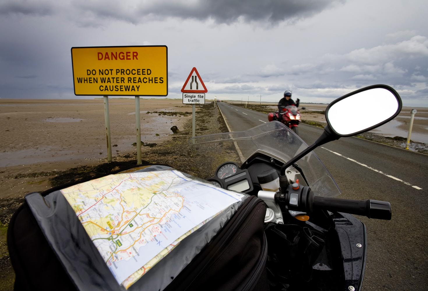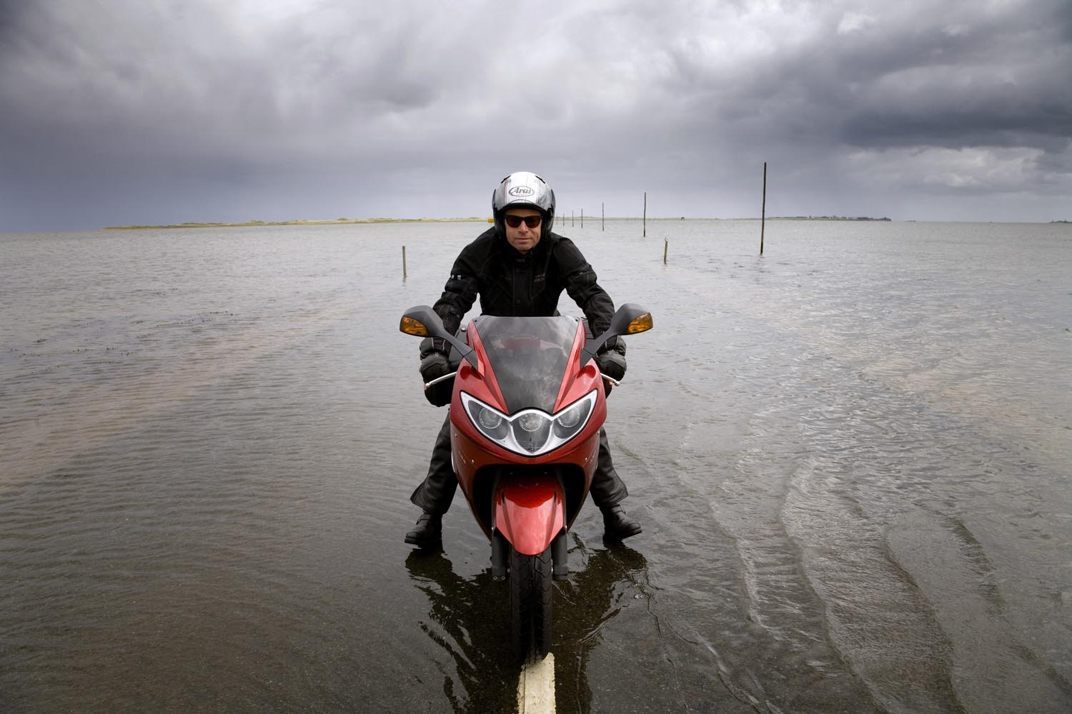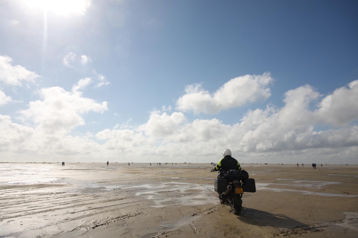 Tijdens een rondje om het kasteel heb ik de tijd goed in de gaten gehouden: mis je het juiste moment, dan zit je zeker zes uur vast op het kasteeleiland. Maar ik ben te vroeg. Voor me gaat de weg nog schuil onder een kabbelende golfslag. Kilometers water scheiden me van de kust. Het is fascinerend om te zien hoe de zee zich terugtrekt en hoe over de zanderige zeebodem een gave asfaltloper wordt uitgerold. Al gauw rij ik langs borden die waarschuwen voor het wassende water. Wie die raad in de wind slaat, zal in een noodgeval het vege lijf moeten redden in één van de schuilhutjes op palen. Tsja, en dan maar wachten, boven de klotsende golven, onder het hoongelach van door de lucht schietende kokmeeuwen.