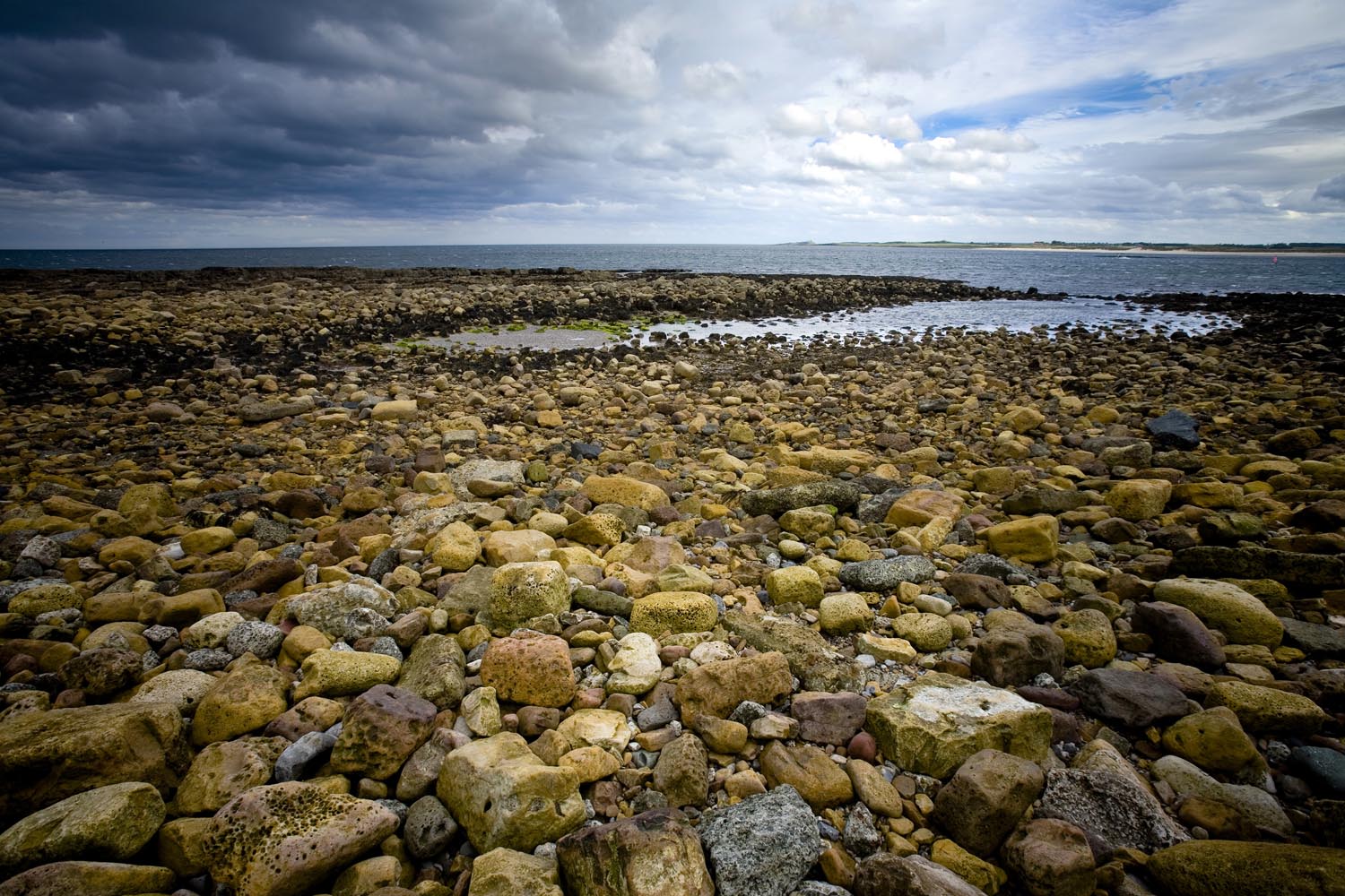 Teveel voor één bezoek en zeker nu, want ik wil vooral ook rijden. Zon en wolken strijden met elkaar als ik door de stadspoort Alnwick verlaat. Ik pak de B1340 naar het noorden, langs de kust die recent het predicaat Nationaal Erfgoed kreeg. Het is laagtij, op de hartslag van het heelal heeft de zee zich teruggetrokken. Brede stranden met wit zand liggen droog rondom Dunstanburgh Castle dat uitkijkt over Embleton Bay. De vette klei van de zeebodem glinstert, steltlopers zijn druk met het bij elkaar pikken van pieren en andere dingetjes.