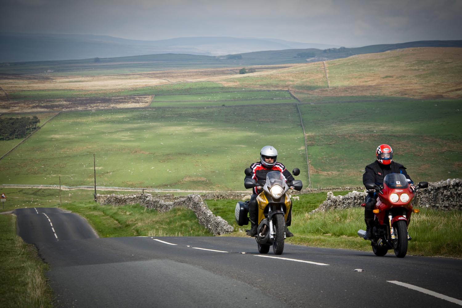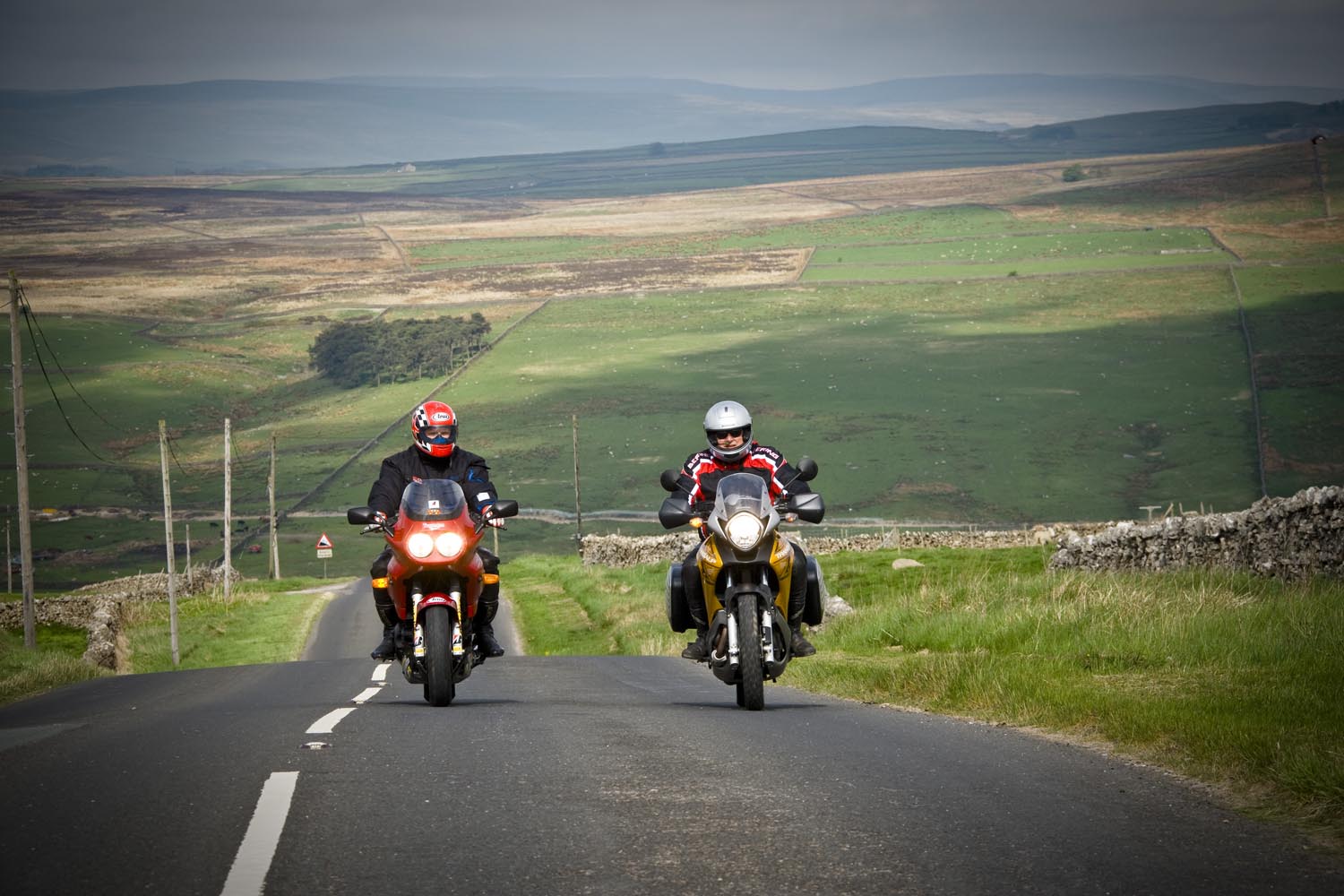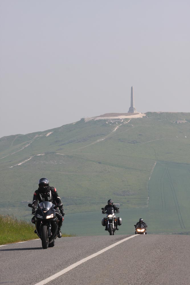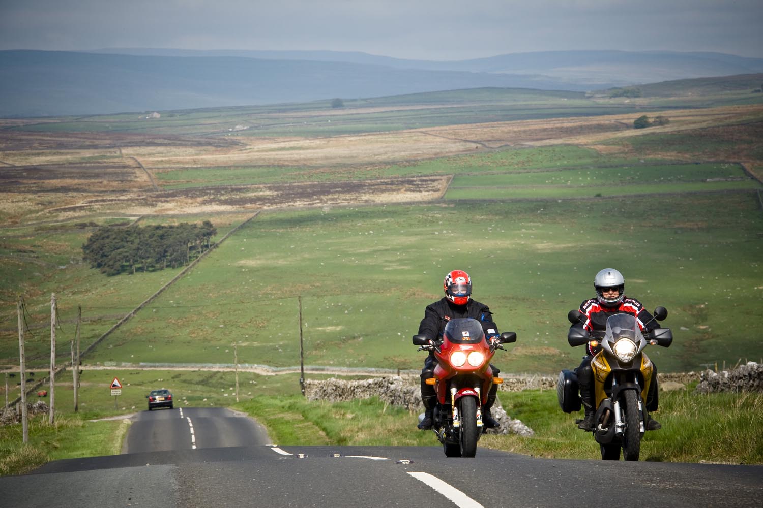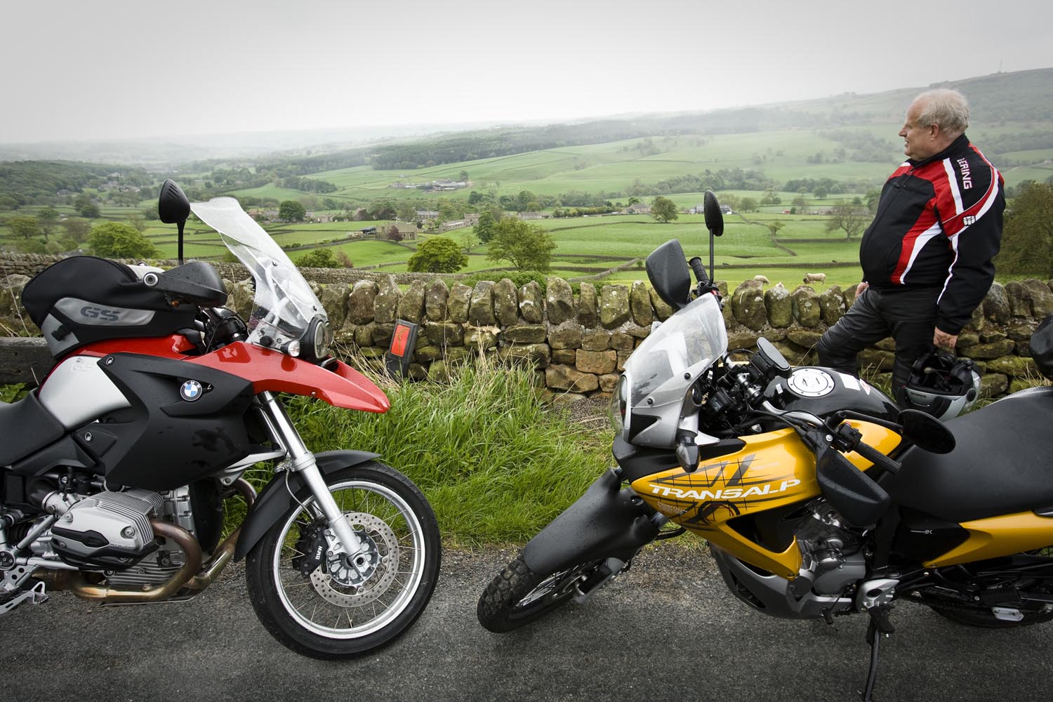 De volgende ochtend schuift Martin bij aan de ontbijttafel. Hoewel hij zelf van Newcastle komt, is hij onze gids voor de dag. Zijn heenreis per Triumph Sprint 900 duurde anderhalf uur, dus doorrijden kan hij in ieder geval. En hij kent de wegen, want die pakt hij regelmatig met zijn mates. Ik vermoed dat hij geen vriend is van onze National Trust-man, maar Martin blijkt prima gezelschap, een aardig mens, en hij kan echt rijden, heeft geraced tot hij op Donington door een langzamere rijder naar het asfalt werd verwezen. Ons gezelschap bestaat vandaag dus uit een wat oudere sporttoer, een dikke allroad en een dunne allroad, en dat vormt geen enkele belemmering voor toeristisch motorplezier.