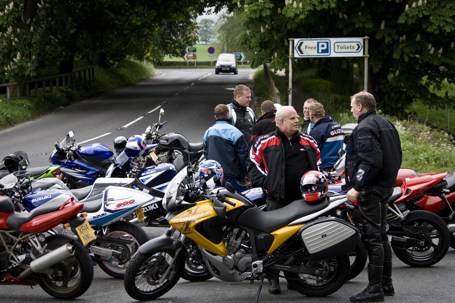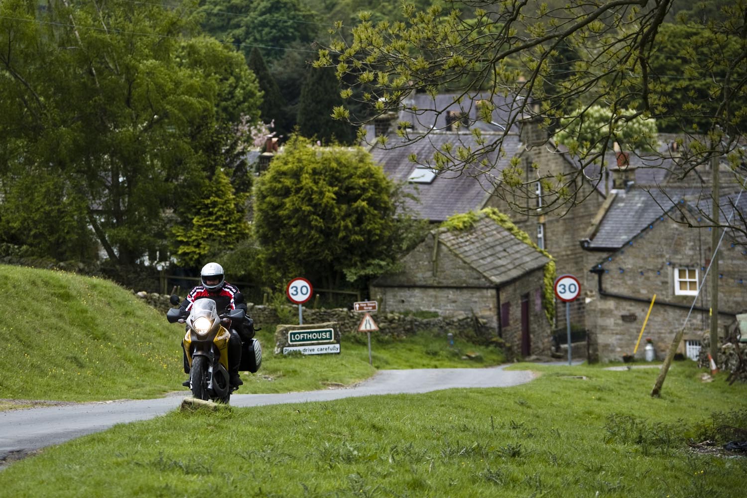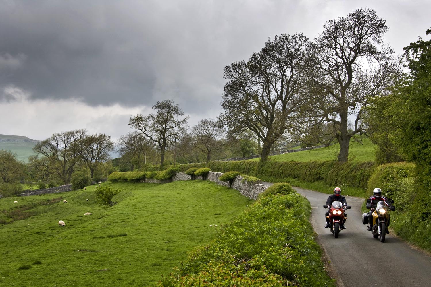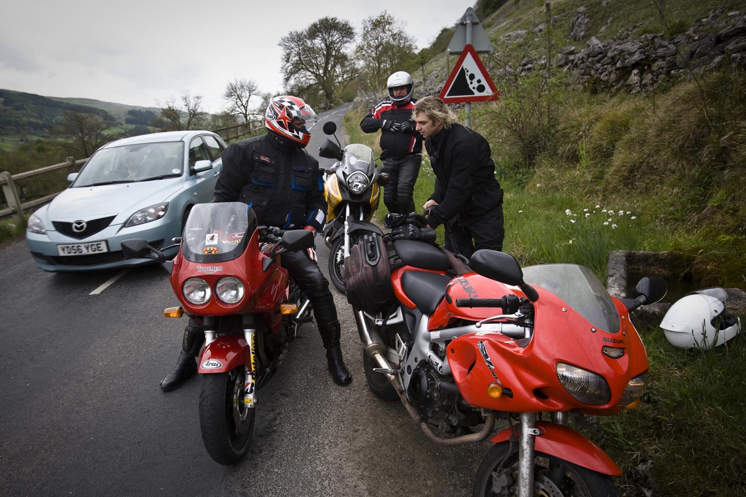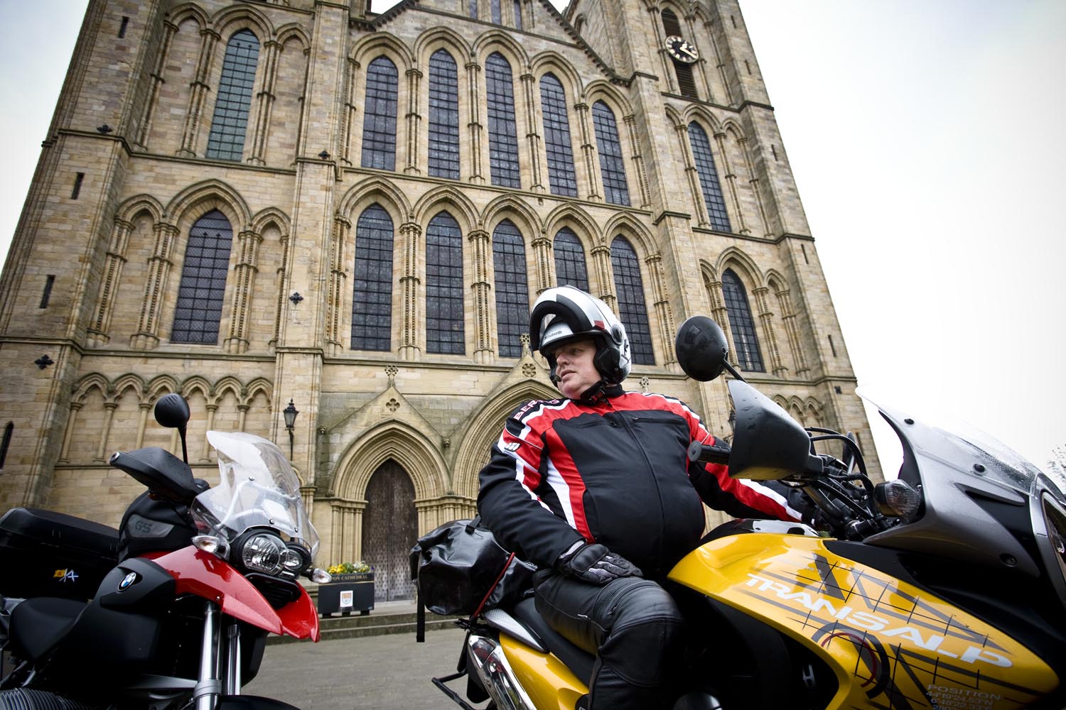 De volgende ochtend schuift Martin bij aan de ontbijttafel. Hoewel hij zelf van Newcastle komt, is hij onze gids voor de dag. Zijn heenreis per Triumph Sprint 900 duurde anderhalf uur, dus doorrijden kan hij in ieder geval. En hij kent de wegen, want die pakt hij regelmatig met zijn mates. Ik vermoed dat hij geen vriend is van onze National Trust-man, maar Martin blijkt prima gezelschap, een aardig mens, en hij kan echt rijden, heeft geraced tot hij op Donington door een langzamere rijder naar het asfalt werd verwezen. Ons gezelschap bestaat vandaag dus uit een wat oudere sporttoer, een dikke allroad en een dunne allroad, en dat vormt geen enkele belemmering voor toeristisch motorplezier.