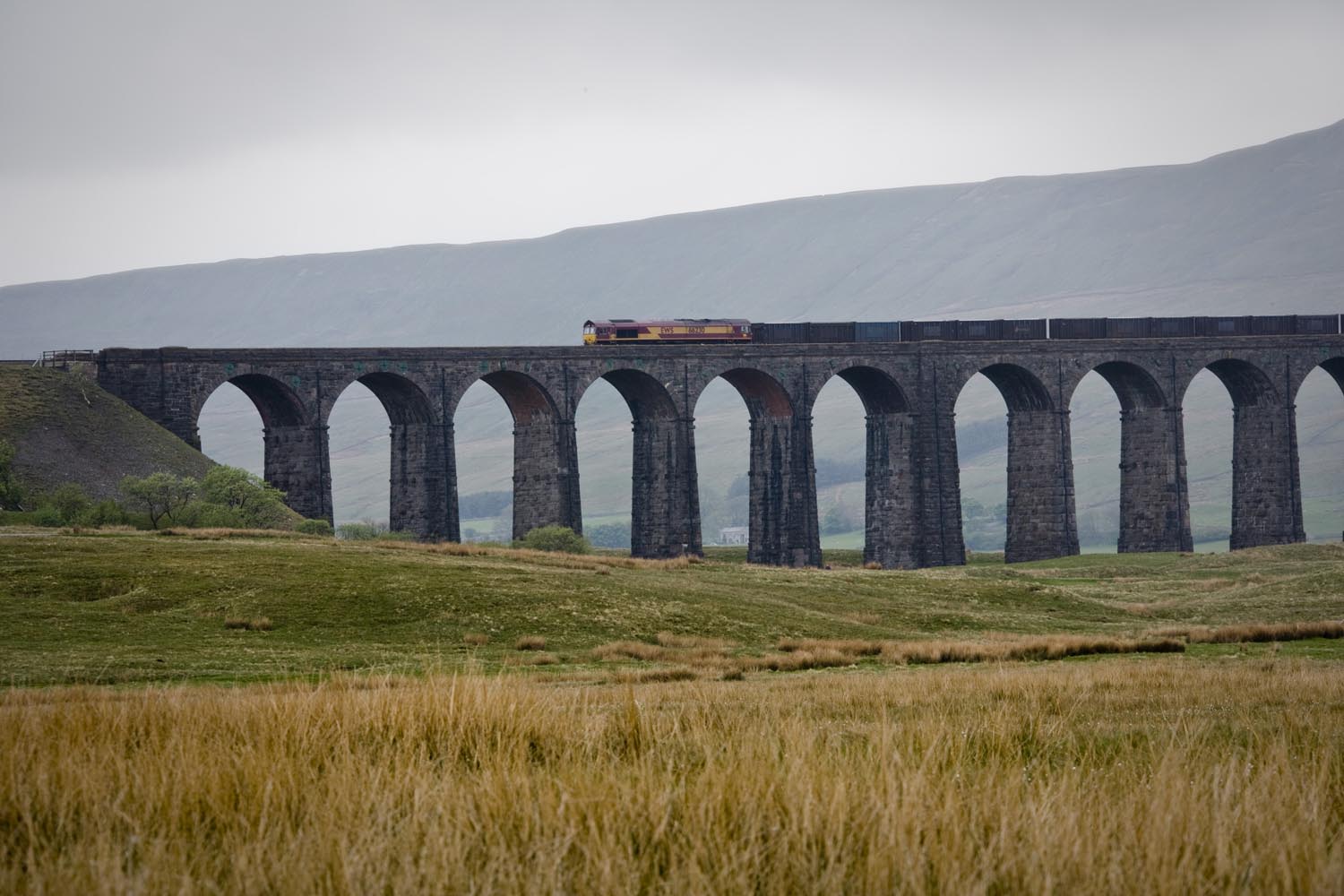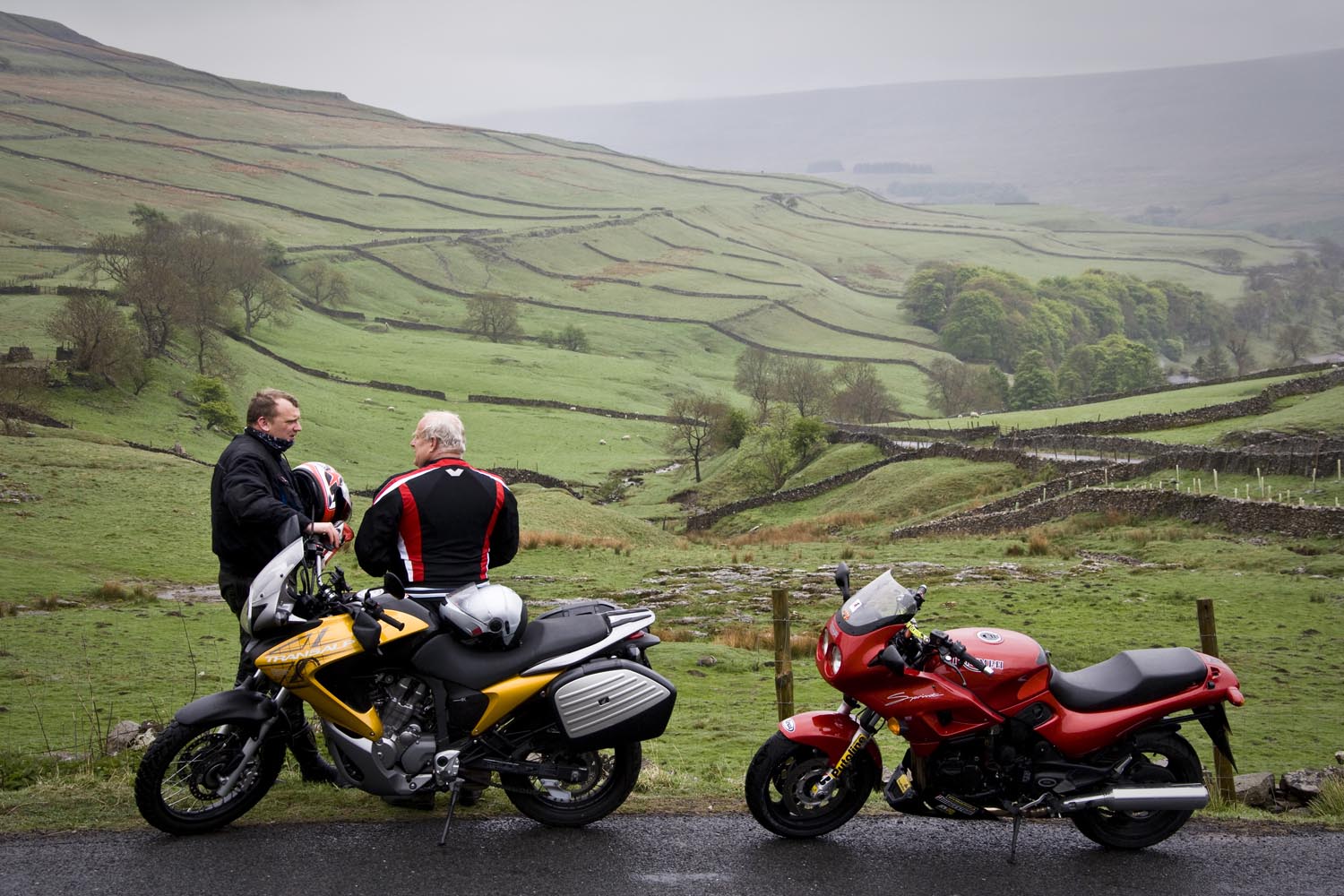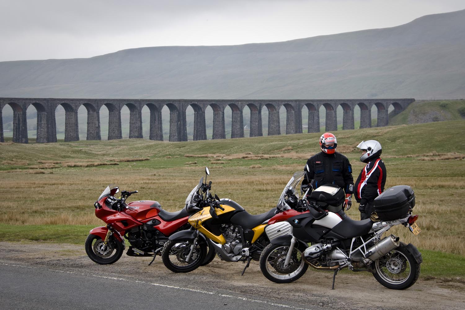 De noordelijkste punt van onze tocht ligt in Hawes, in het Wensleydale. We barsten van de honger, dus we schuiven naar binnen in een cafetaria waar veel motoren voor staan: Penny’s Caf. Als ik al even sta te wachten voor de toog, hoor ik van een andere motorrijder dat de baas even een half uurtje geen bestellingen aanneemt. Terwijl zijn tent vol zit! We besluiten stante pede naar de buurman te gaan. Waar we een smakelijke ploughman’s lunch als sneeuw voor de zon laten verdwijnen. Terwijl het buiten giet van de regen. Diezelfde regen doet Martin besluiten ons niet langs het allermooiste weggetje naar Devil’s Bridge te leiden. Met zoveel nattigheid wordt dat gewoon te gevaarlijk, maar zijn second best levert nog steeds een prachtige rit op. We stoppen onderweg voor het Ribble Head Viaduct, een onderdeel van de Settle and Carlisle Railway. Dit lijntje – gebouwd in de jaren ’70 van de negentiende eeuw ten koste van veel mensenlevens – geldt als het landschappelijk meest interessante spoor van Engeland. Het viaduct telt 24 bogen, en de navvies die het bouwden, moesten door acht meter veen graven om een solide fundering te kunnen leggen. Eind vorige eeuw werd het spoor in ere hersteld, en vandaag de dag is het best druk met vooral vrachtverkeer. Om ons een plezier te doen, passeert er net een lange vrachttrein het kunstwerk als wij aan het fotograferen zijn. Het natte weer draagt op de een of andere manier bij aan onze beleving van de dales, alsof het landschap zich niet extra mooi wil maken voor een paar motortoeristen. Nou, dat hoeft ook niet, het is mooi genoeg.