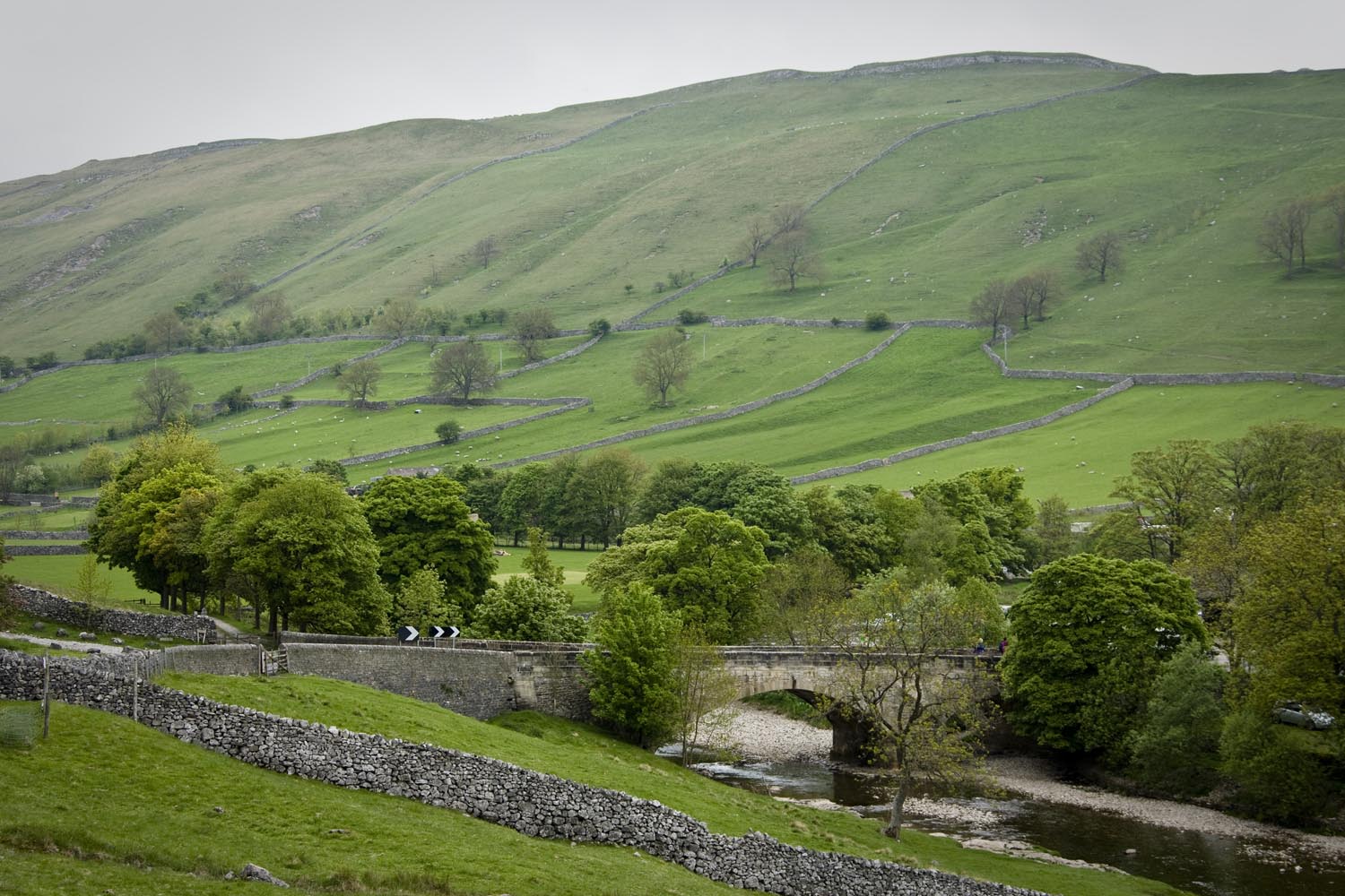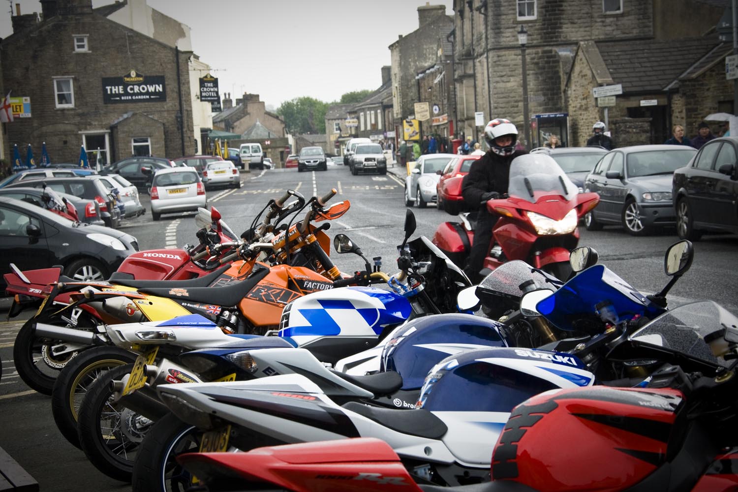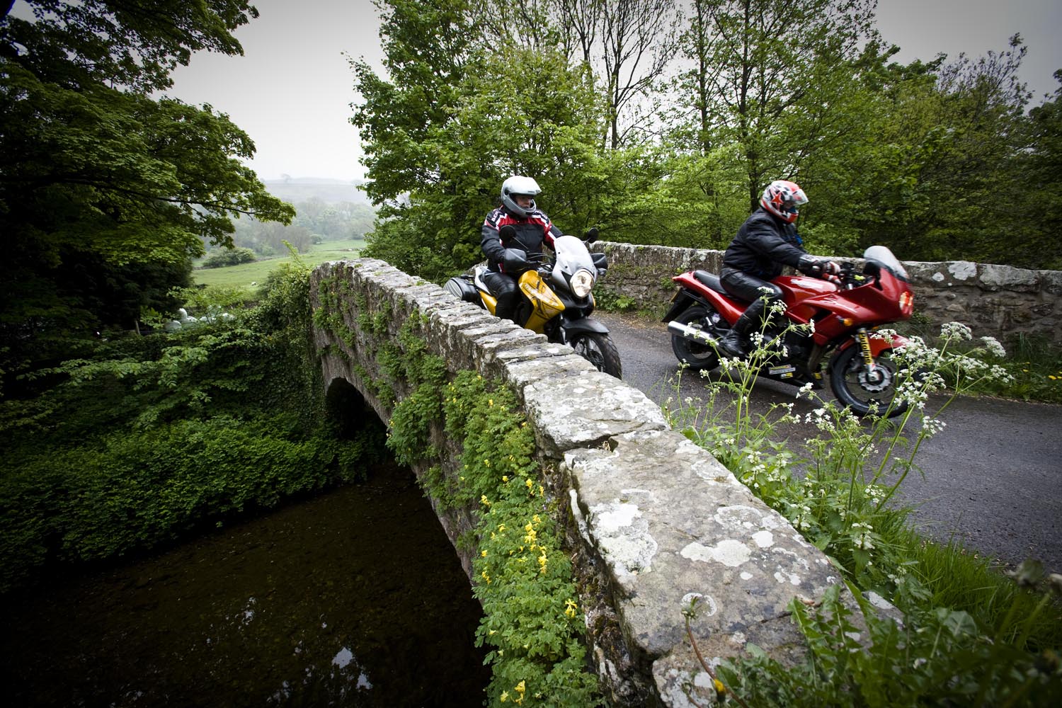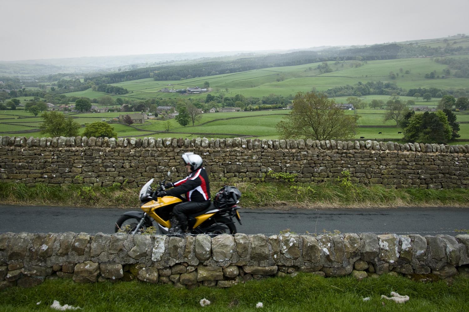 De noordelijkste punt van onze tocht ligt in Hawes, in het Wensleydale. We barsten van de honger, dus we schuiven naar binnen in een cafetaria waar veel motoren voor staan: Penny’s Caf. Als ik al even sta te wachten voor de toog, hoor ik van een andere motorrijder dat de baas even een half uurtje geen bestellingen aanneemt. Terwijl zijn tent vol zit! We besluiten stante pede naar de buurman te gaan. Waar we een smakelijke ploughman’s lunch als sneeuw voor de zon laten verdwijnen. Terwijl het buiten giet van de regen. Diezelfde regen doet Martin besluiten ons niet langs het allermooiste weggetje naar Devil’s Bridge te leiden. Met zoveel nattigheid wordt dat gewoon te gevaarlijk, maar zijn second best levert nog steeds een prachtige rit op. We stoppen onderweg voor het Ribble Head Viaduct, een onderdeel van de Settle and Carlisle Railway. Dit lijntje – gebouwd in de jaren ’70 van de negentiende eeuw ten koste van veel mensenlevens – geldt als het landschappelijk meest interessante spoor van Engeland. Het viaduct telt 24 bogen, en de navvies die het bouwden, moesten door acht meter veen graven om een solide fundering te kunnen leggen. Eind vorige eeuw werd het spoor in ere hersteld, en vandaag de dag is het best druk met vooral vrachtverkeer. Om ons een plezier te doen, passeert er net een lange vrachttrein het kunstwerk als wij aan het fotograferen zijn. Het natte weer draagt op de een of andere manier bij aan onze beleving van de dales, alsof het landschap zich niet extra mooi wil maken voor een paar motortoeristen. Nou, dat hoeft ook niet, het is mooi genoeg.