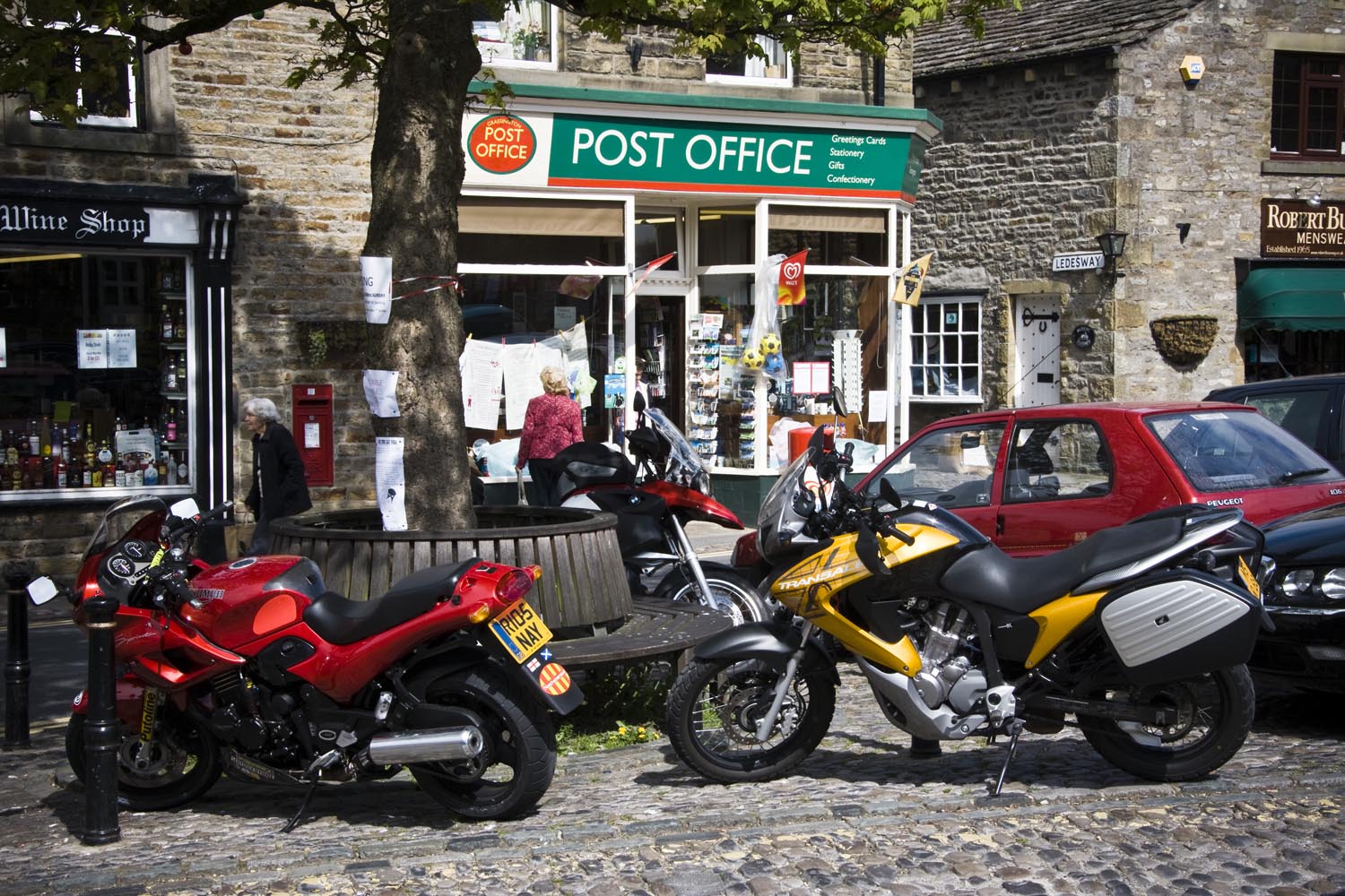 Martin rijdt veilige lijnen, en wacht even als ik het niet bij kan houden. Chris zit daar tussen. Het valt ons op dat de wegen zo lekker rustig zijn voor een zaterdag. Dat is niet altijd zo, hartje zomer kom je overal motorrijders tegen in de weekends, en dan controleert de politie op volle sterkte, vertelt hij als we een smakelijke koffie (alweer) verorberen op het terras van het Cobblestones Café in het rustieke Grassington.