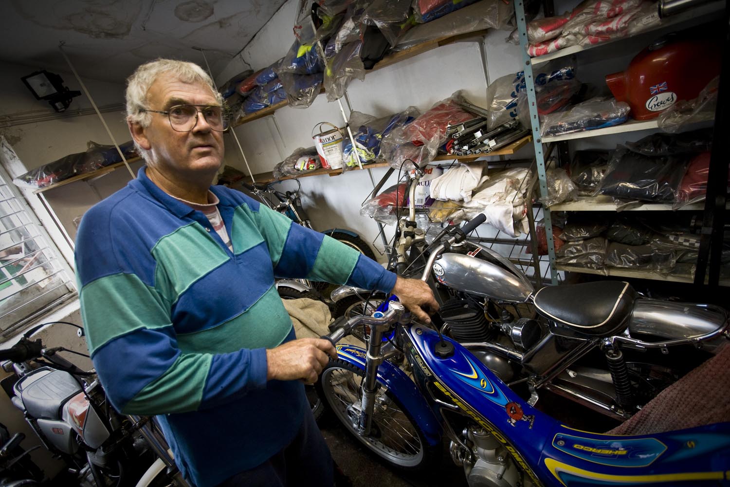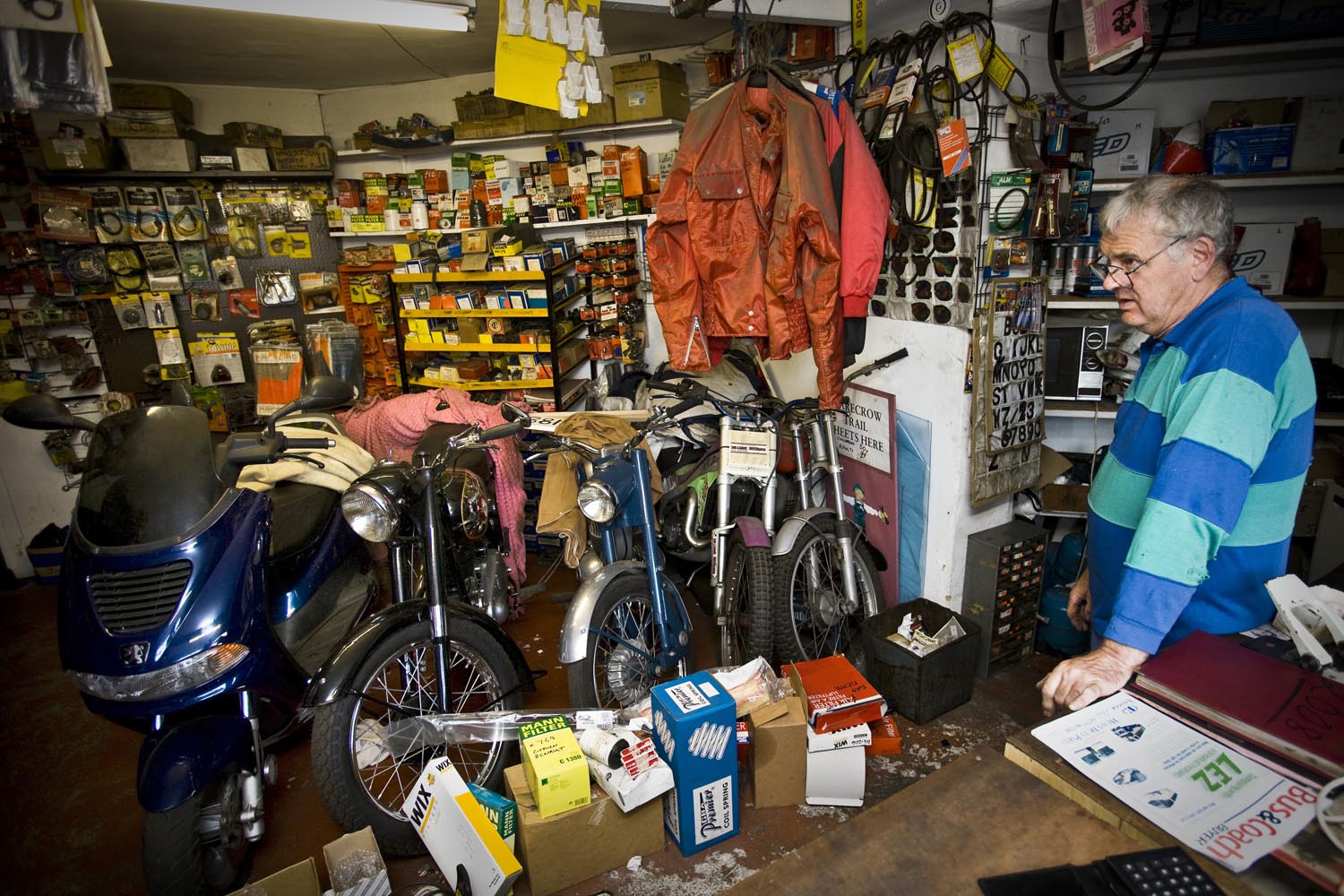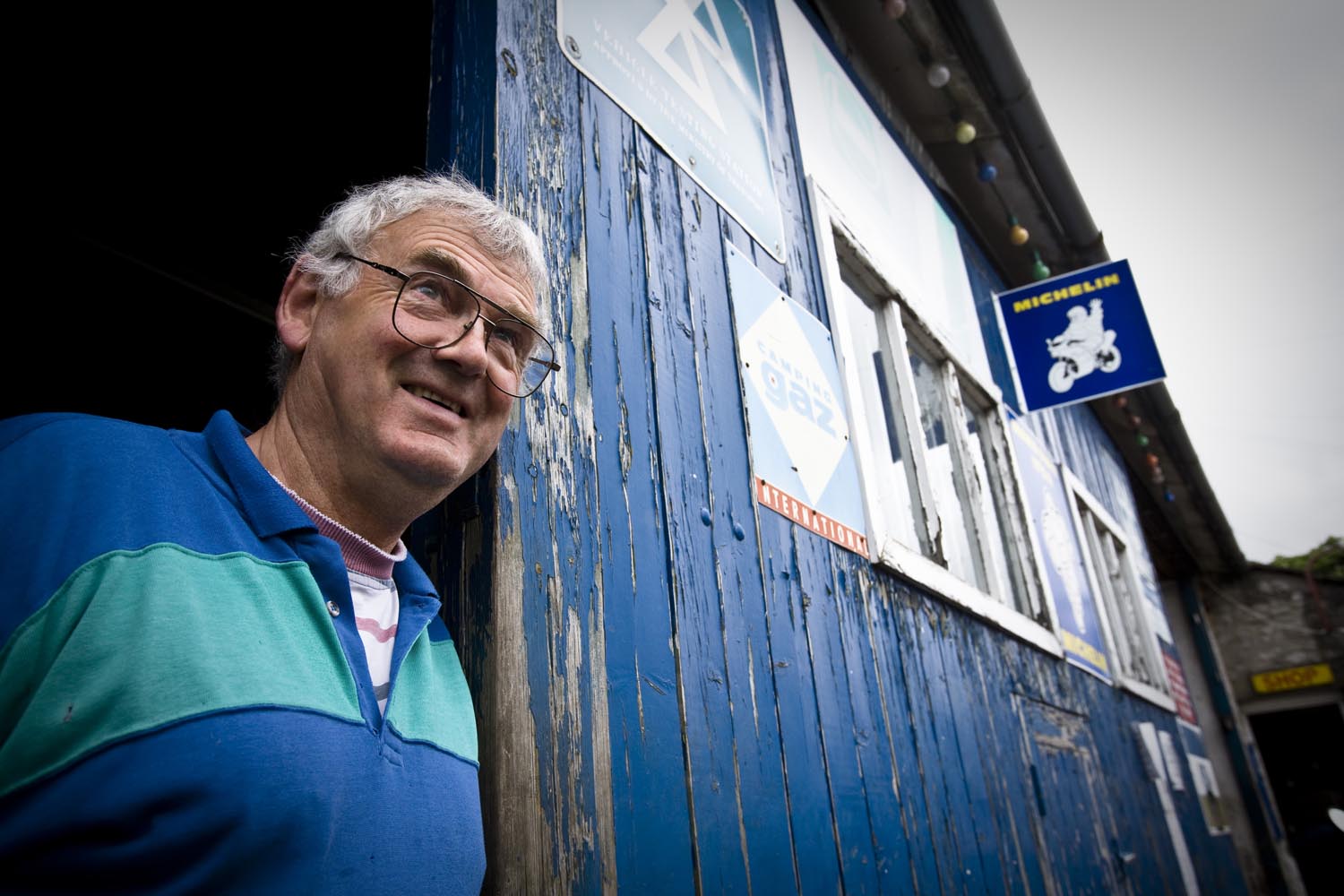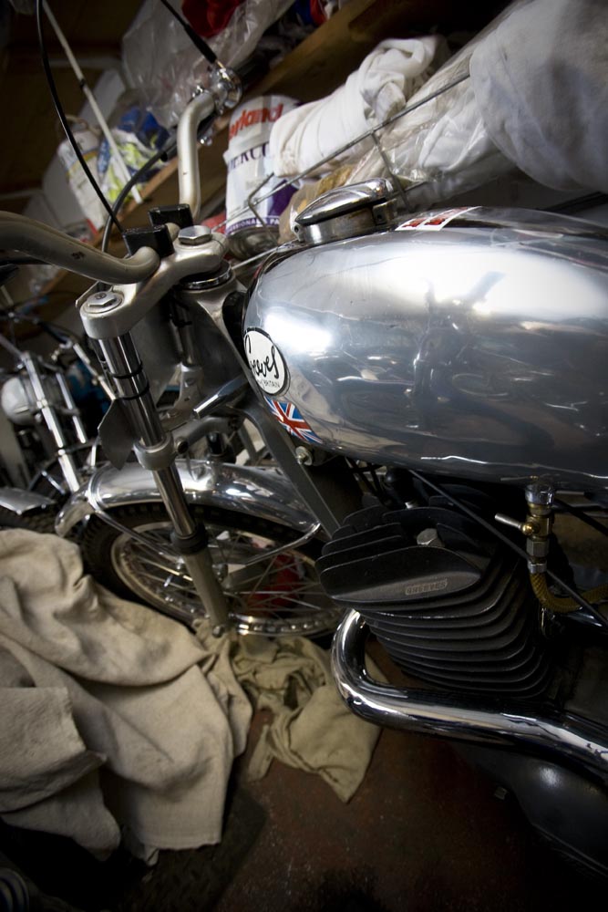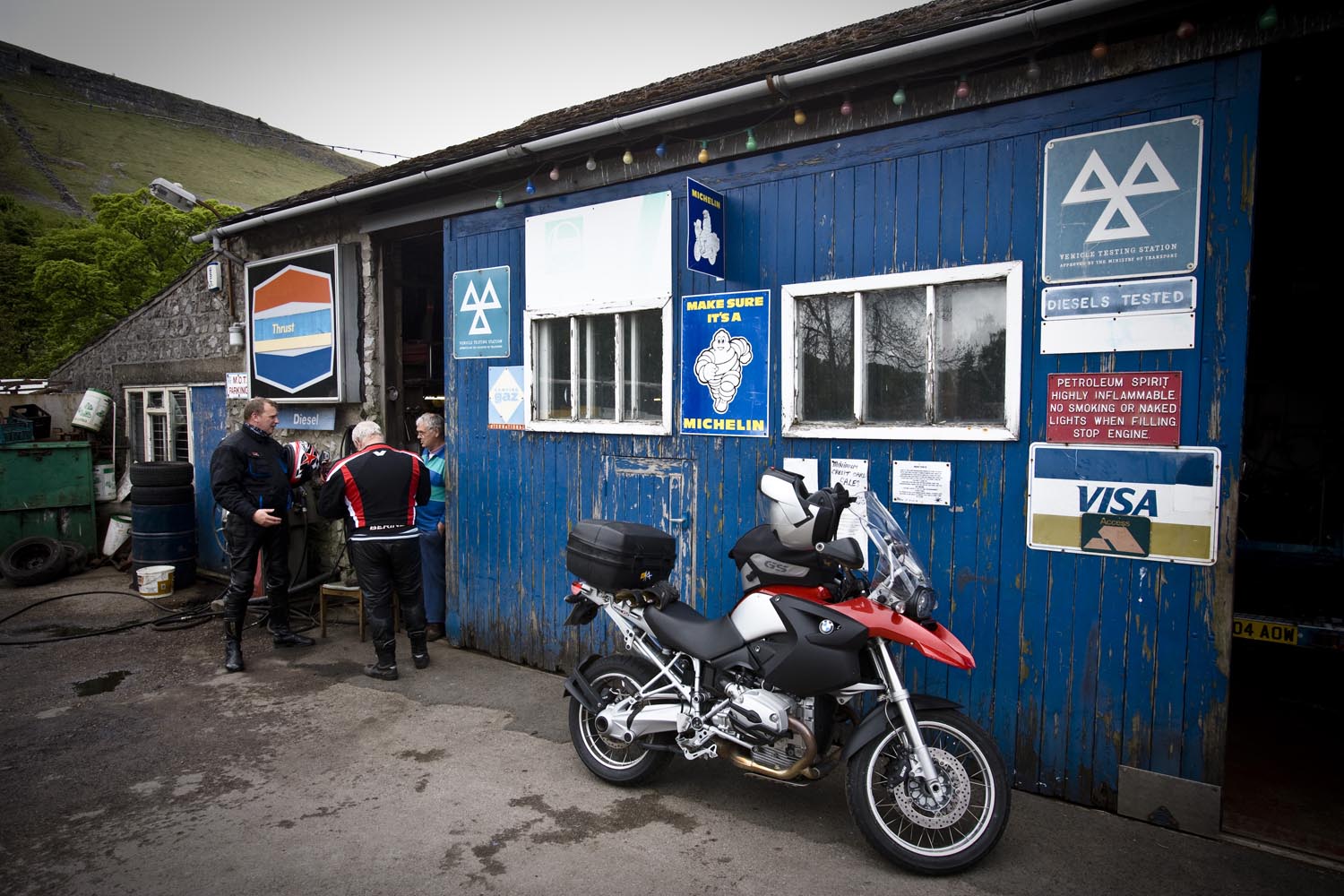 We dansen nog steeds, naar Kettlewell dit keer. Waar we stoppen bij een garage/benzinestation uit de fifties, dat me bekend voorkomt. Klopt, het deed mee in de film Calendar Girls. De eigenaar is Bill Wilkinson, en dat blijkt een fameus trialrijder te zijn geweest. ‘Beter dan Sammy Miller?’ plaag ik. ‘Zeker!’ geeft hij terug, en dan dist hij wat omschrijvingen van deze triallegende op, die ik niet van hem op mag schrijven. En hij laat ons zijn werkplaats en winkel zien, die vol staat met historische motoren, waaronder twee als gloednieuwe Greeves, het merk waarop hij zijn successen vierde. Hoewel er ook een Bultaco glimt. Hij heeft ook nog een Greeves straatmotor, en je kunt bij hem nog nieuwe Belstaff vetpakken kopen, en dan bedoel ik niet dat ze recent uit de fabriek zijn gekomen. Veel nostalgie dus, maar Bill ziet er uit alsof hij ons op het dichtstbijzijnde rotspad nog een aardig poepie kan laten ruiken. En Sammie Miller ook…