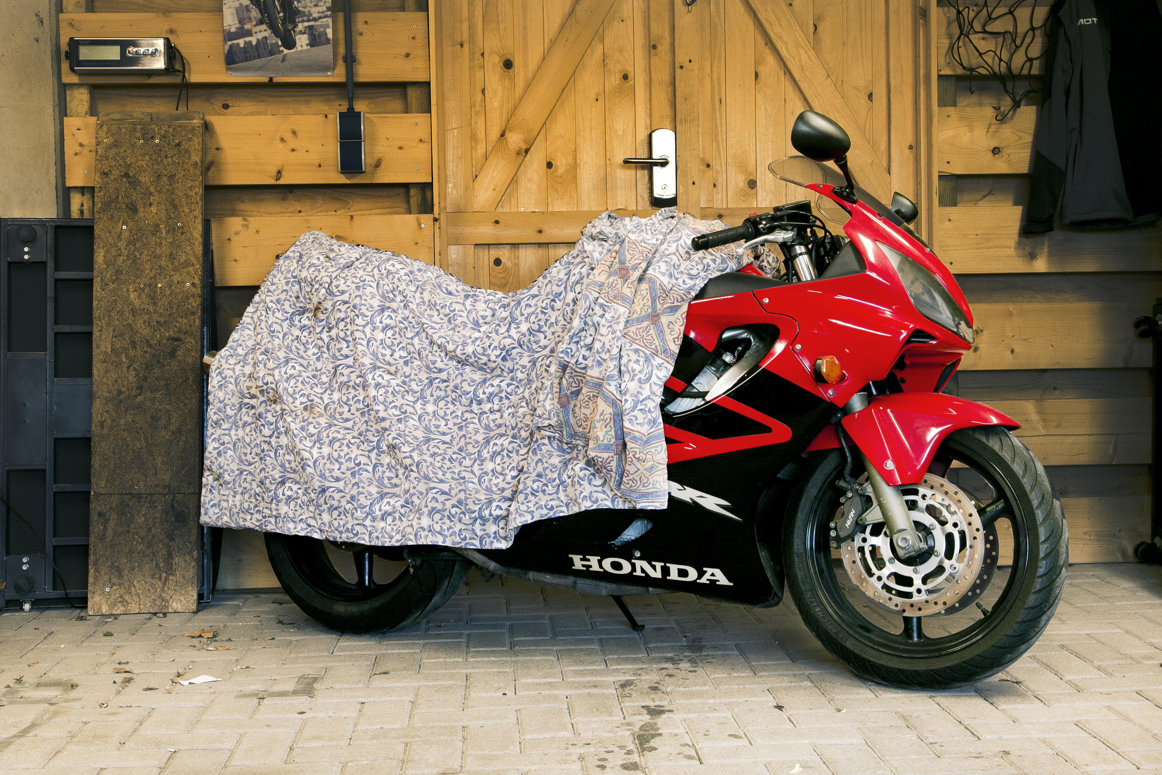 ‘Om makkelijker te sleutelen had ons vader een ijzeren steun gelast waar hij het blok in kon zetten. Dat maakte hij gewoon. Bijna al zijn gereedschap bouwde hij zelf, hoezo kopen? Een kit om een voorvork uit mekaar te halen, die soldeerde en laste hij zelf. Een bandenlichtermachine was natuurlijk te kostbaar, dus had hij zelf een voet gemaakt met een hele constructie om de band op te wippen. Lagers vervangen en balanceren gebeurde ook in de schuur. Alleen als hij er echt niet meer uitkwam, ging hij naar een professional, maar dat deed ‘ie heel, heel zelden. Al die zelfgemaakte gereedschappen gebruiken we nog steeds voor onze motoren.’