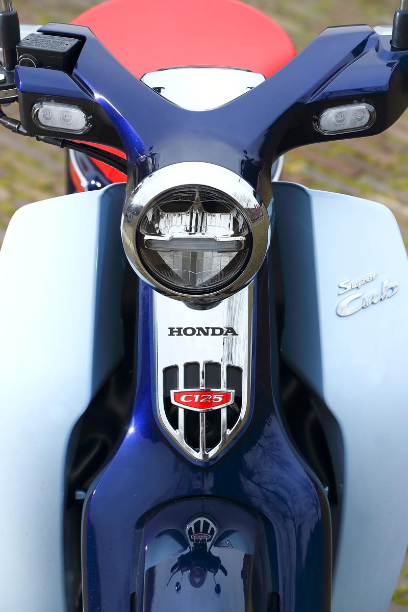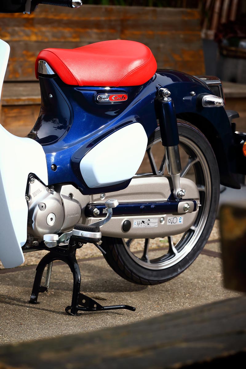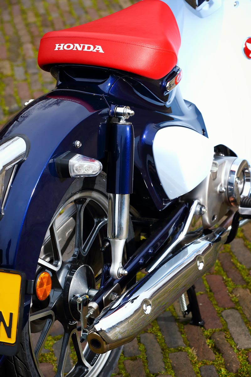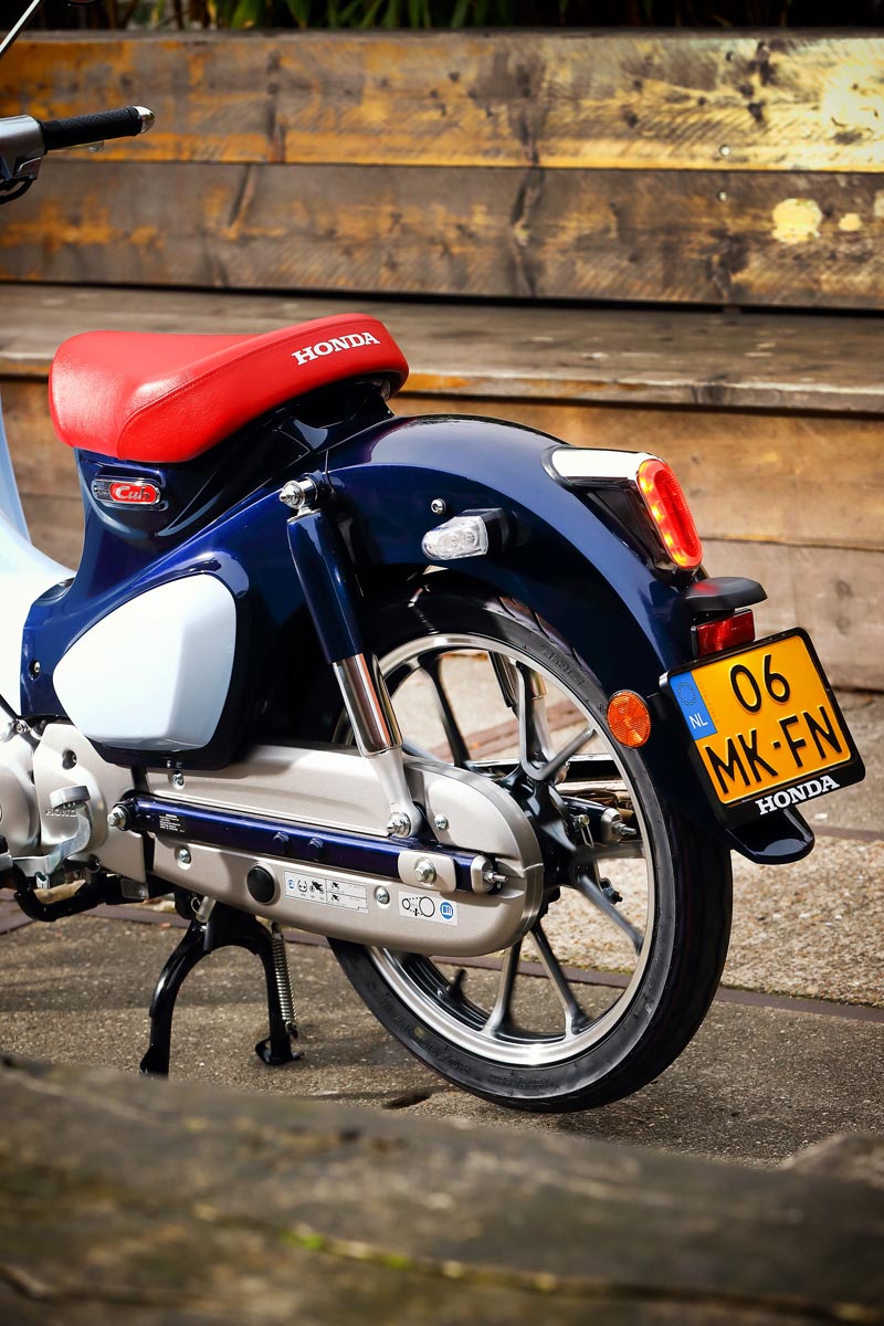 Het enkele zadeltje, stereodempers aan de achterzijde, de ronde, diepe spatborden, het frame opgebouwd uit geperst stalen plaatwerk, alle kabels keurig weggewerkt, ieder detail is geïnspireerd op die iconische, eerste generatie Super Cubs. En waar de onwetende toeschouwer per abuis nog wel eens zou kunnen denken dat we hier te maken hebben met een scooter; dat was vroeger ook al zo. Maar dat ontwerp met lage instap had én heeft alles te maken met de bruikbaarheid als pakezel: volgehangen met bagage kun je langs het zadel natuurlijk veel gemakkelijker opstappen.