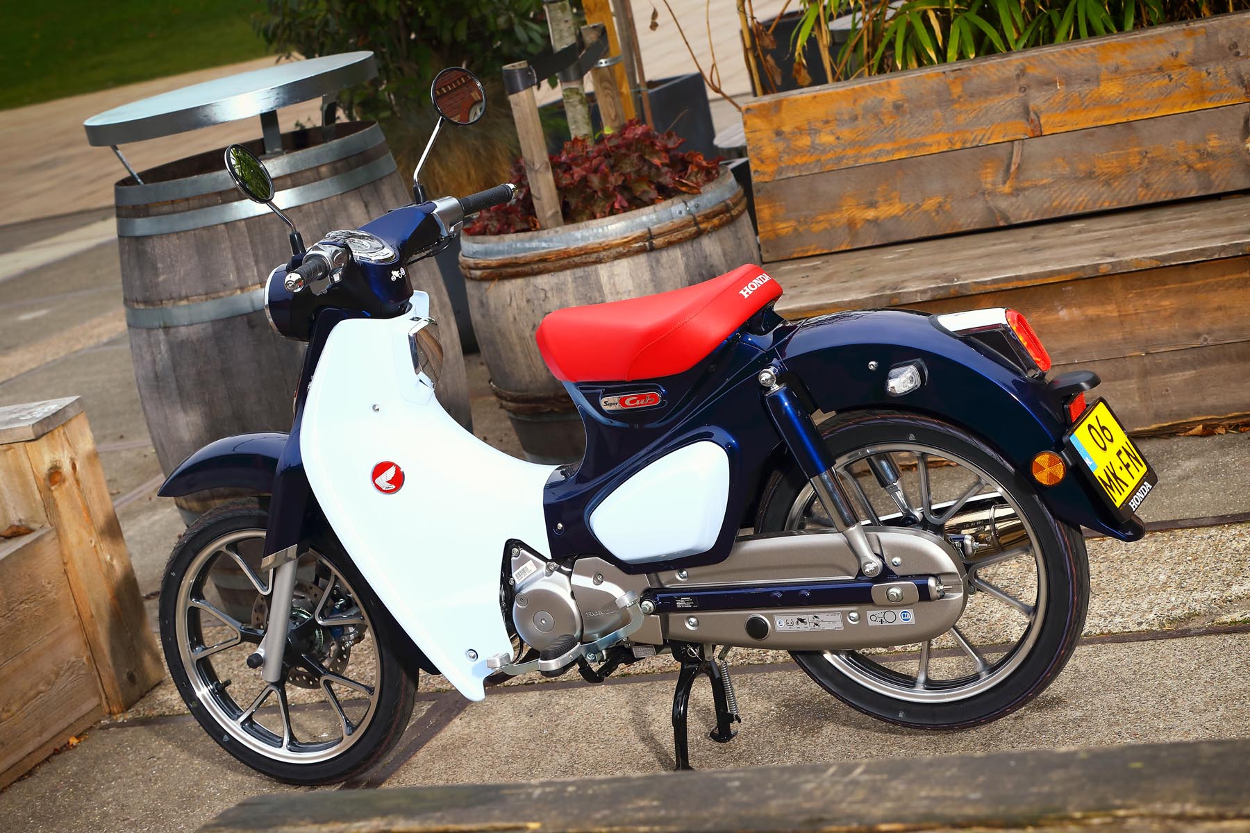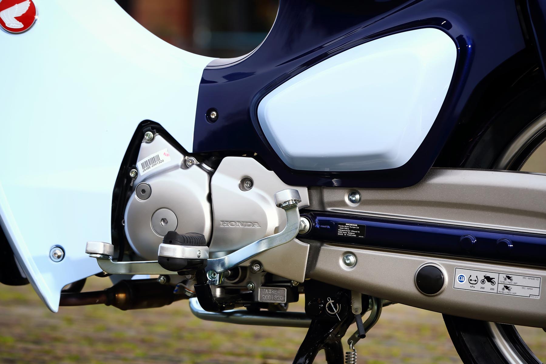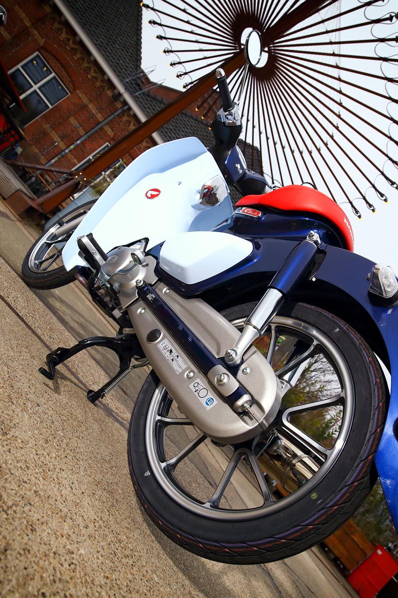 Het enkele zadeltje, stereodempers aan de achterzijde, de ronde, diepe spatborden, het frame opgebouwd uit geperst stalen plaatwerk, alle kabels keurig weggewerkt, ieder detail is geïnspireerd op die iconische, eerste generatie Super Cubs. En waar de onwetende toeschouwer per abuis nog wel eens zou kunnen denken dat we hier te maken hebben met een scooter; dat was vroeger ook al zo. Maar dat ontwerp met lage instap had én heeft alles te maken met de bruikbaarheid als pakezel: volgehangen met bagage kun je langs het zadel natuurlijk veel gemakkelijker opstappen.
