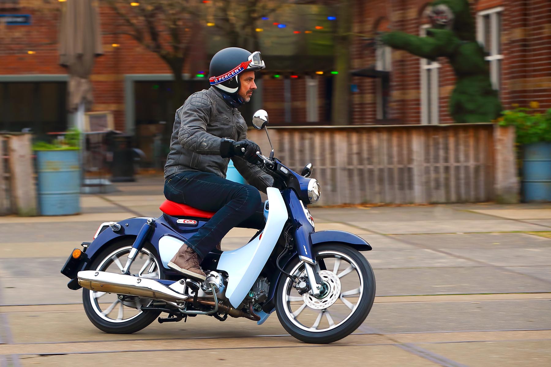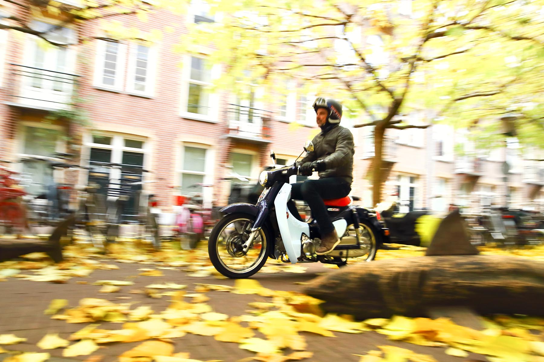 De Super Cub mag dan veruit de meest verkochte motorfiets ter wereld zijn; in Nederland is de kleine Honda altijd een beetje een witte raaf gebleken. Hoewel Honda de inspiratie halverwege de jaren ’50 wel degelijk haalde uit de grote populariteit van brommertjes op het oude continent, gaven ze er van meet af aan een heel eigen draai aan. Zo ging het hier zo populaire tweetaktconcept in Japan meteen de prullenmand in en werd er een betrouwbare en zuinige 50cc viertaktmotor ontwikkeld in combinatie met een halfautomatische versnellingsbak zodat, zo leert de historie, bezorgers altijd één hand vrij hielden om een bak noedels vast te houden. Altijd handig.