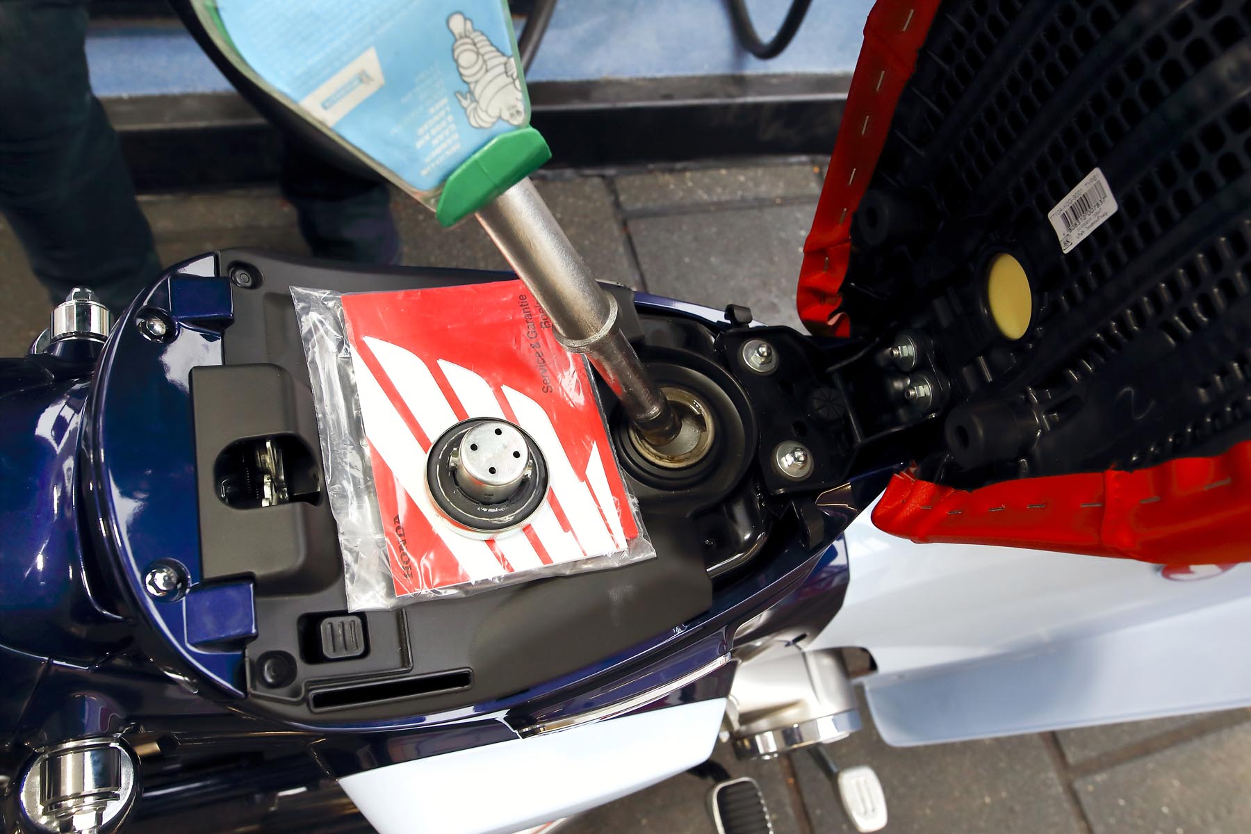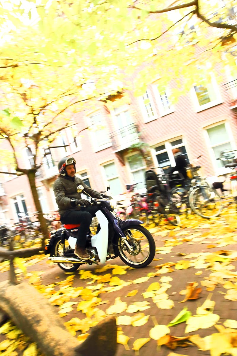 We duiken het altijd hectische verkeer van Amsterdam in, maar niet voor we eerst even de snelwegkwaliteiten van de Super Cub te hebben getest. We nemen plaats op een heerlijk dik zadel, schuiven de Cub eenvoudig van het middenbokje en met een druk op de knop slaat de eenpitter moeiteloos aan. Zonder koppeling trap je hem in de versnelling; net als zijn voorgangers is-ie voorzien van een centrifugaalkoppeling die ontkoppelt als je het schakelpedaal beroert. Ook dat pedaal werkt overigens niet zoals je gewend bent: aan de teenzijde schakel je óp door het pedaal naar beneden te duwen. Het pedaal loopt overigens onder de voetsteun door naar de achterzijde, alwaar je de hiel kunt gebruiken om waar nodig terug te schakelen. Maar het wordt nog eigenwijzer: je kunt de bak ook dóórtrappen. Van z’n vier dus opschakelen naar neutraal, waarna je na nog een keer trappen weer in de eerste gang staat. Het duurt even voor je gewend bent, maar daarna is het vooral heerlijk dat je bij het verkeerslicht niet helemaal door alle versnellingen heen hoeft om weer bij één te eindigen.