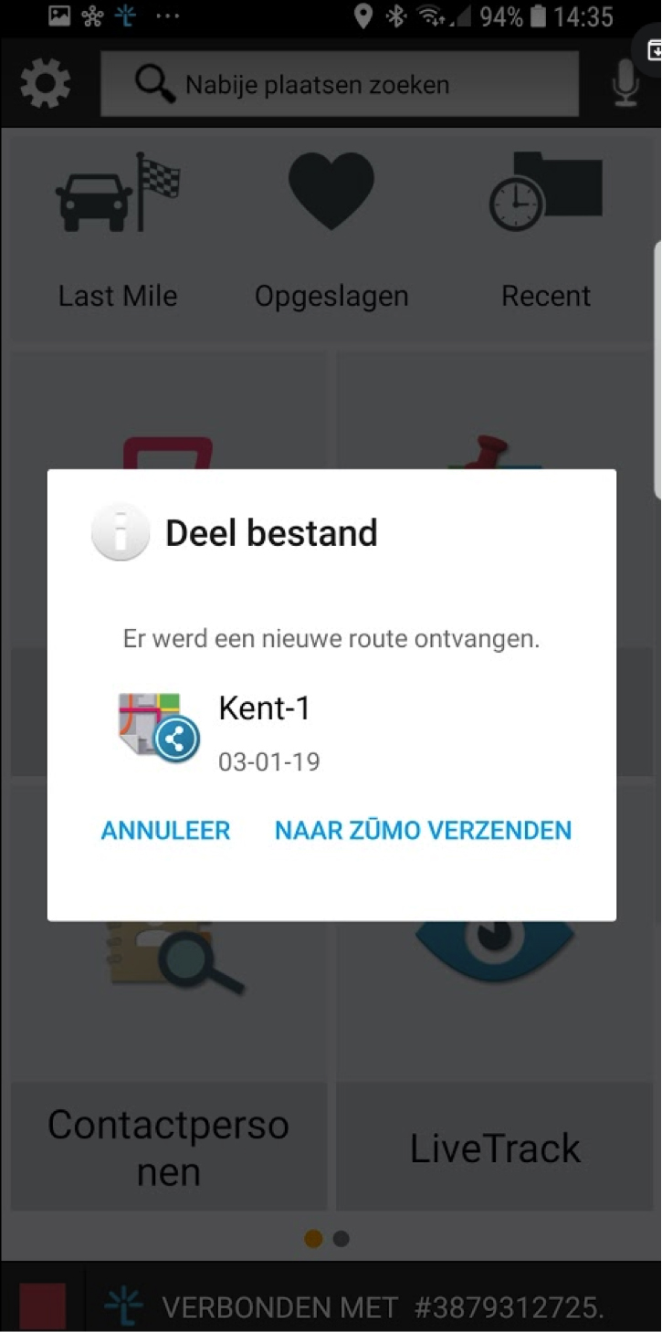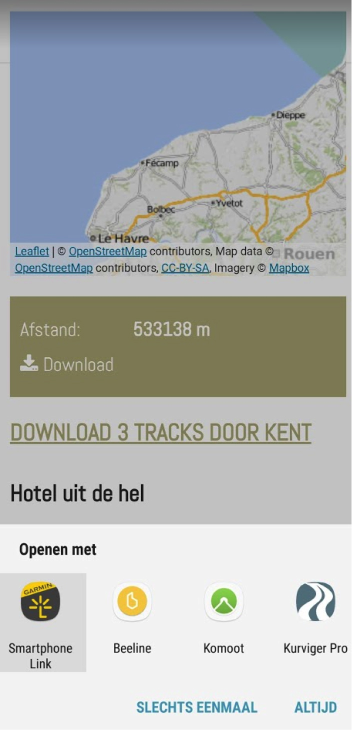 Maar nu kun je, net als bij TomTom al langer mogelijk is, je routes ook plannen op je telefoon of tablet. Ook Android of Apple dus. De laptop en USB-kabel kunnen thuisblijven! Kwestie van in de ‘browser’ de route opslaan als gpx, dat bestand openen in Smartlink en een paar seconden later staat ie in je Zumo! Dat geldt overigens ook voor kant en klare routes die je downloadt, bijvoorbeeld van de Promotorsite. Ook dat kan nu ‘gewoon’ via je telefoon!