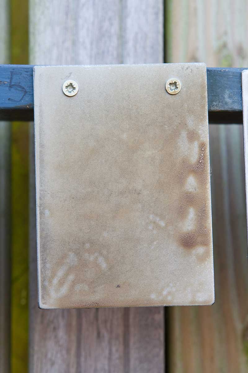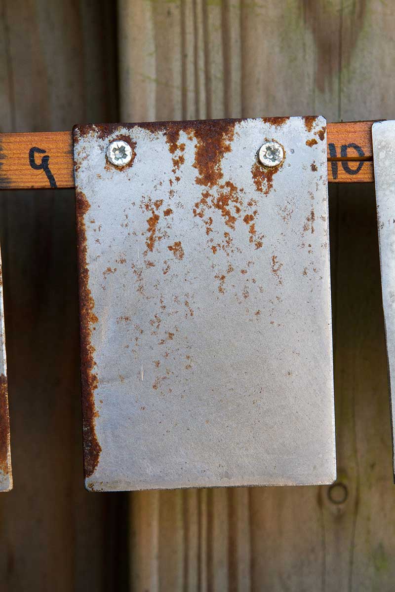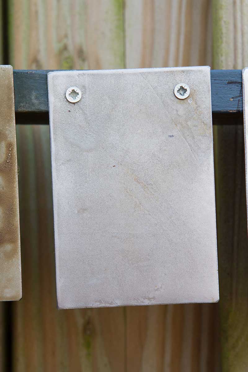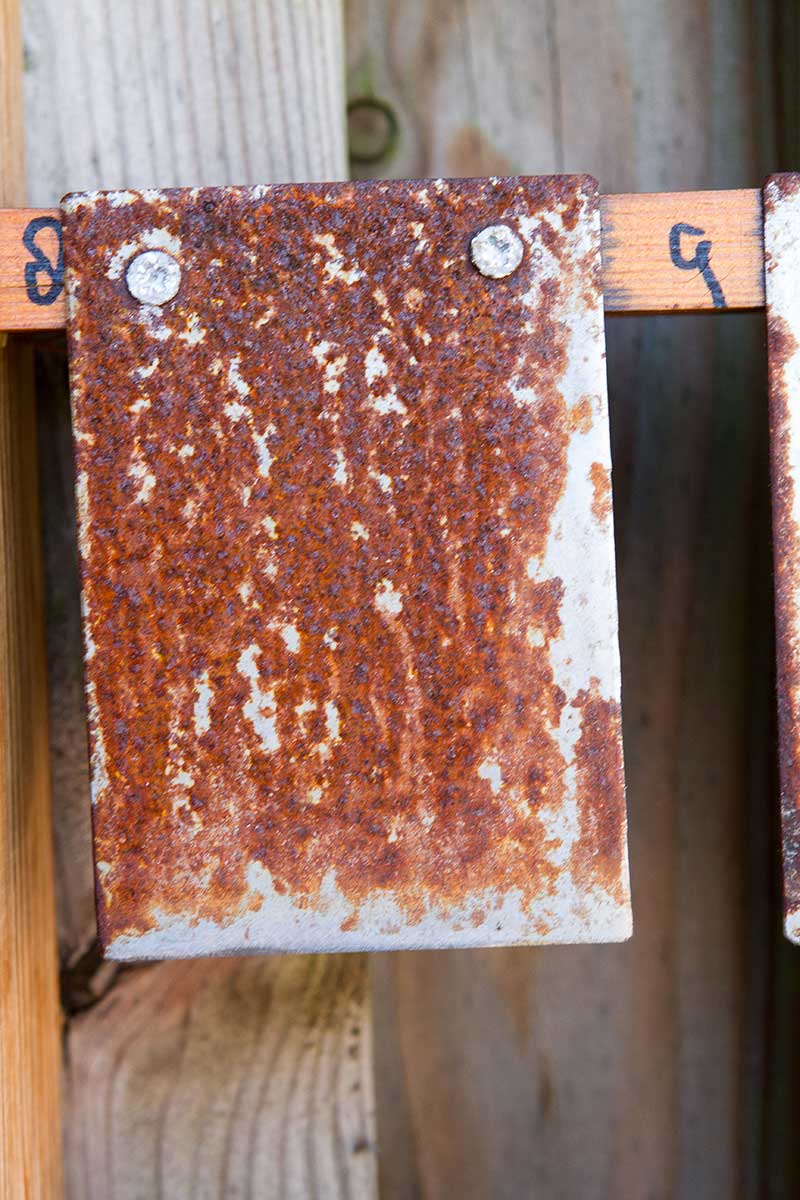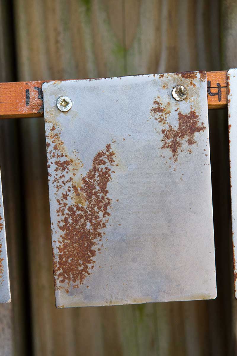 Voor de test heb je natuurlijk om te beginnen een roestvrije staalplaat nodig. De voorhanden zijnde pisbakkenijzeren plaat (ST37-2 of FE360) had lichte vliegroest, maar daar is een prachtige oplossing voor. Na opschuren werd de ijzerplaat ingesmeerd met een dikke laag Rustico. Een paar uur later werd de plaat schoongespoeld en was hij zo blank als sneeuwwitje na haar ochtendbad. Goed spul dus, dat Rustico! Vervolgens werd de plaat in plaatjes geknipt, ontbraamd, ontvet en ingespoten met de diverse corrosiewerende spuitproducten. Dan werden ze – samen met een kale, onbehandelde referentieplaat – op een speciaal daarvoor vervaardigd frame geschroefd, dat vlak naast de garage van ondergetekende tegen de tuinschutting werd geschroefd, bloot gesteld aan weer, wind en elektrische gitaarmuziek. En de plaatjes bleven zo onaangetast, want er miste nog één ingrediënt: pekel. Gewapend met strooizout en een plantenspuit aan de slag dus. Binnen enkele dagen verschenen de eerste corrosieculturen.