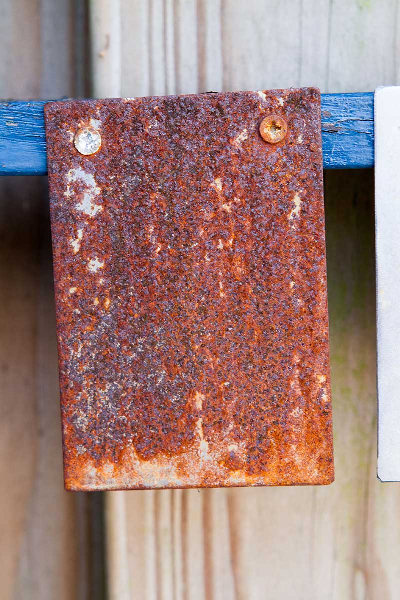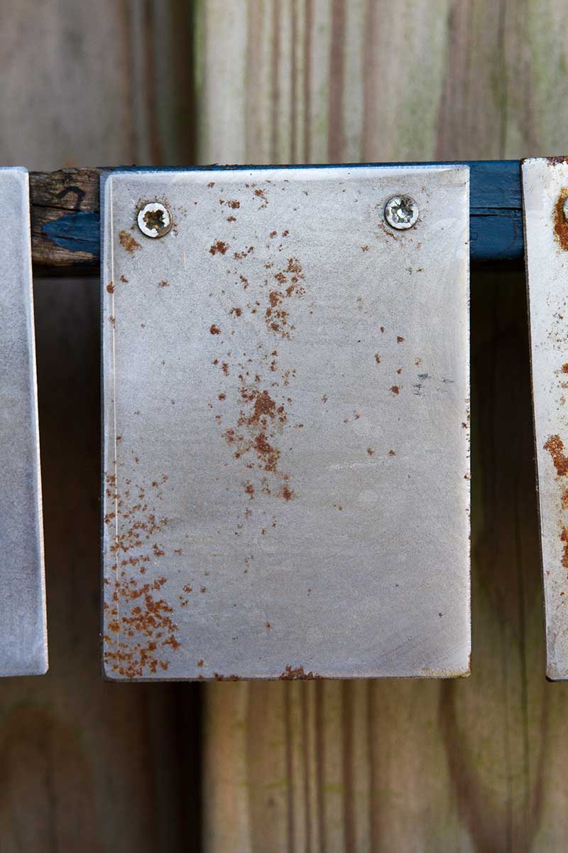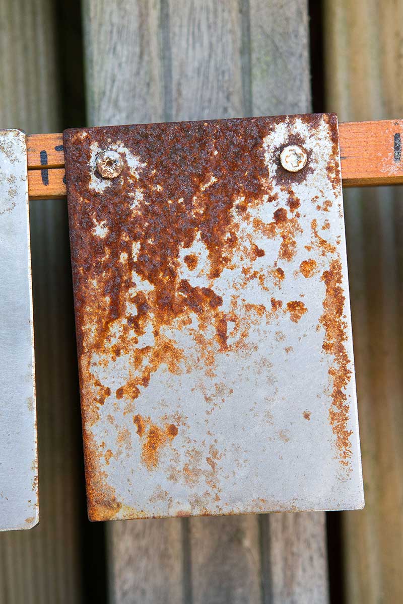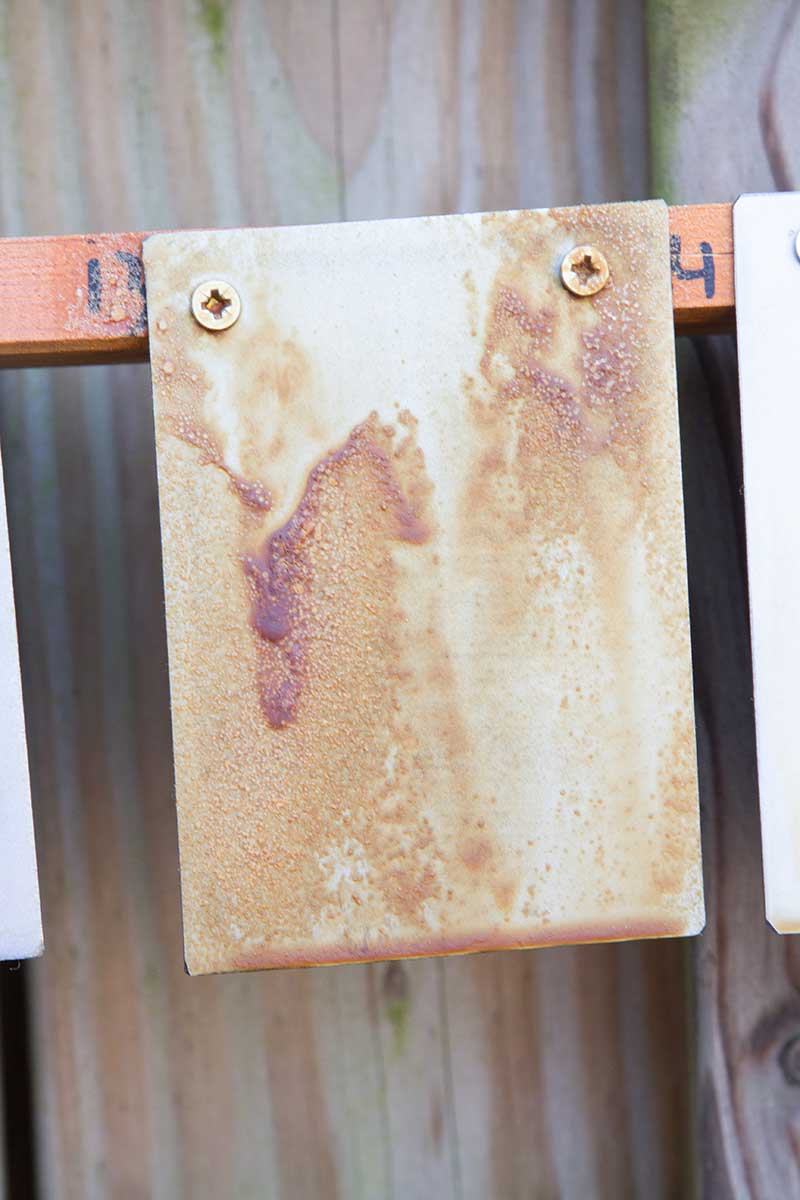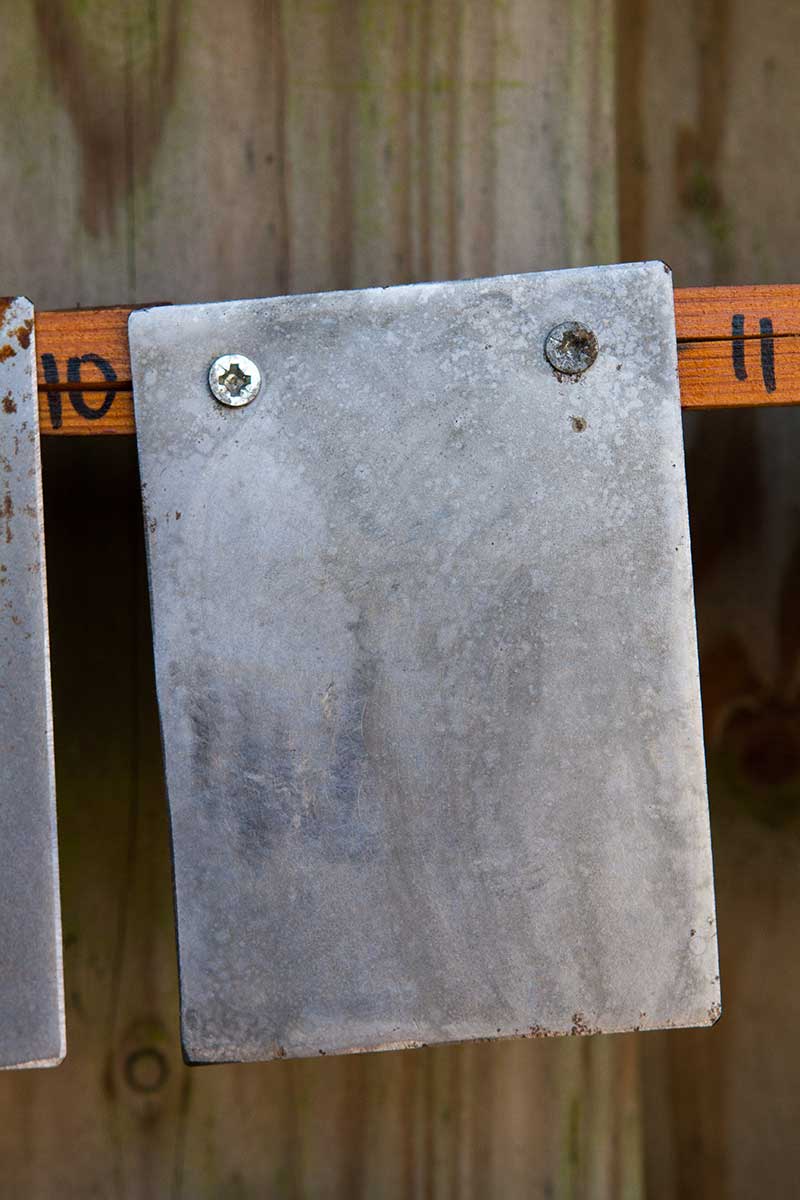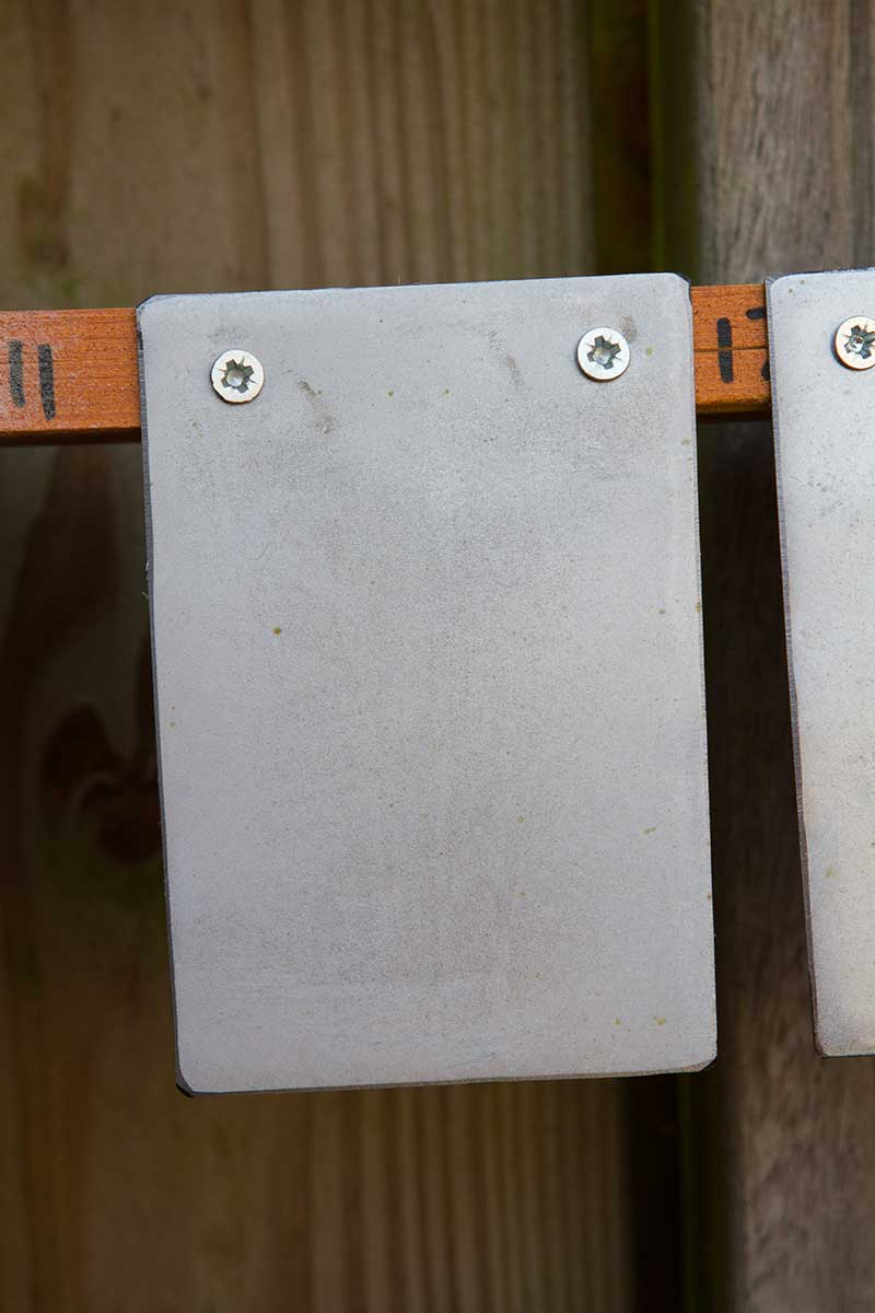 Voor de test heb je natuurlijk om te beginnen een roestvrije staalplaat nodig. De voorhanden zijnde pisbakkenijzeren plaat (ST37-2 of FE360) had lichte vliegroest, maar daar is een prachtige oplossing voor. Na opschuren werd de ijzerplaat ingesmeerd met een dikke laag Rustico. Een paar uur later werd de plaat schoongespoeld en was hij zo blank als sneeuwwitje na haar ochtendbad. Goed spul dus, dat Rustico! Vervolgens werd de plaat in plaatjes geknipt, ontbraamd, ontvet en ingespoten met de diverse corrosiewerende spuitproducten. Dan werden ze – samen met een kale, onbehandelde referentieplaat – op een speciaal daarvoor vervaardigd frame geschroefd, dat vlak naast de garage van ondergetekende tegen de tuinschutting werd geschroefd, bloot gesteld aan weer, wind en elektrische gitaarmuziek. En de plaatjes bleven zo onaangetast, want er miste nog één ingrediënt: pekel. Gewapend met strooizout en een plantenspuit aan de slag dus. Binnen enkele dagen verschenen de eerste corrosieculturen.