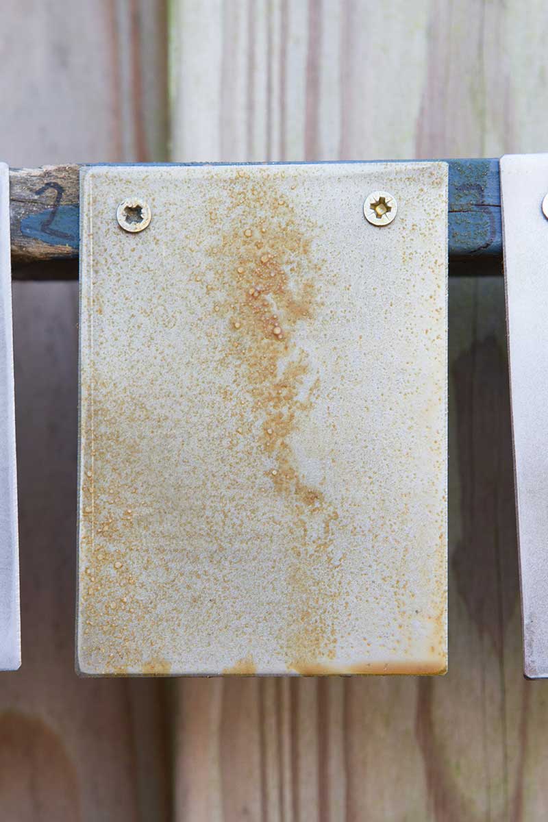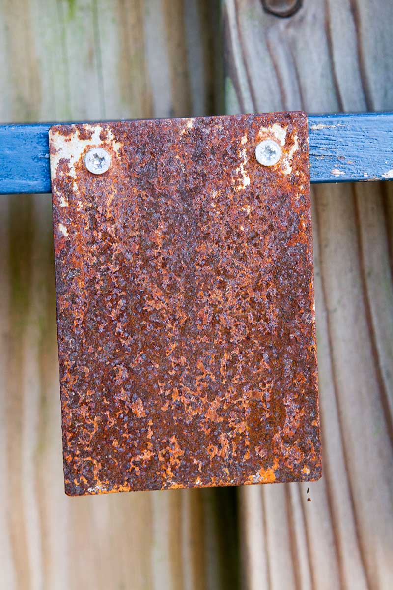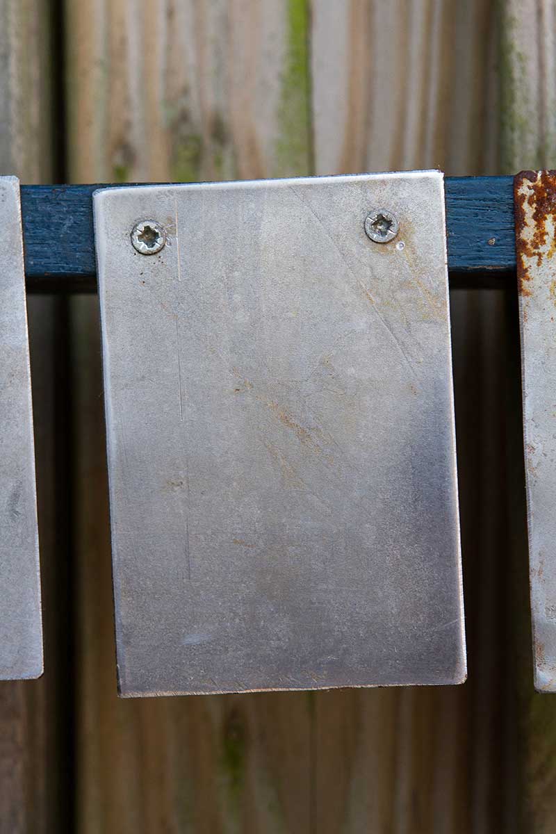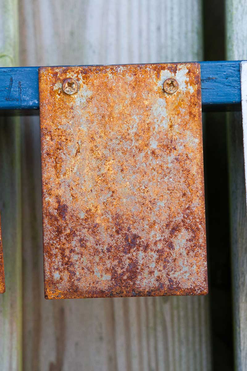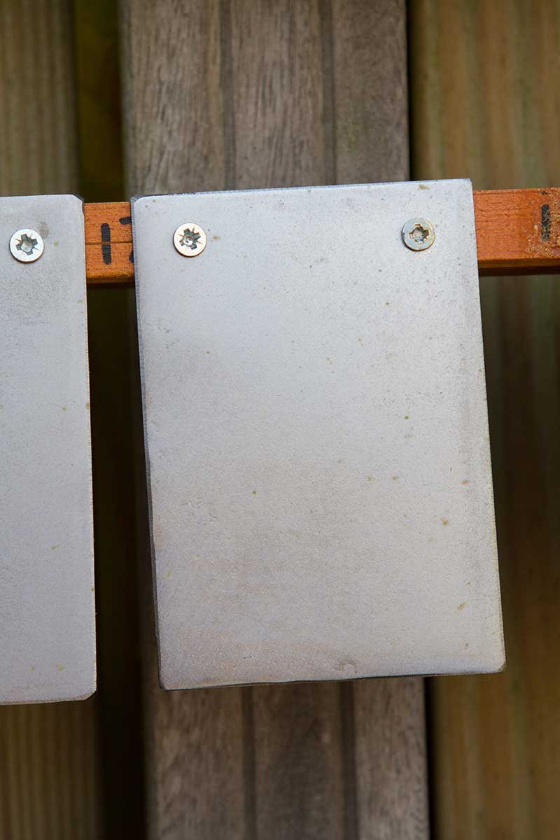 Voor de test heb je natuurlijk om te beginnen een roestvrije staalplaat nodig. De voorhanden zijnde pisbakkenijzeren plaat (ST37-2 of FE360) had lichte vliegroest, maar daar is een prachtige oplossing voor. Na opschuren werd de ijzerplaat ingesmeerd met een dikke laag Rustico. Een paar uur later werd de plaat schoongespoeld en was hij zo blank als sneeuwwitje na haar ochtendbad. Goed spul dus, dat Rustico! Vervolgens werd de plaat in plaatjes geknipt, ontbraamd, ontvet en ingespoten met de diverse corrosiewerende spuitproducten. Dan werden ze – samen met een kale, onbehandelde referentieplaat – op een speciaal daarvoor vervaardigd frame geschroefd, dat vlak naast de garage van ondergetekende tegen de tuinschutting werd geschroefd, bloot gesteld aan weer, wind en elektrische gitaarmuziek. En de plaatjes bleven zo onaangetast, want er miste nog één ingrediënt: pekel. Gewapend met strooizout en een plantenspuit aan de slag dus. Binnen enkele dagen verschenen de eerste corrosieculturen.