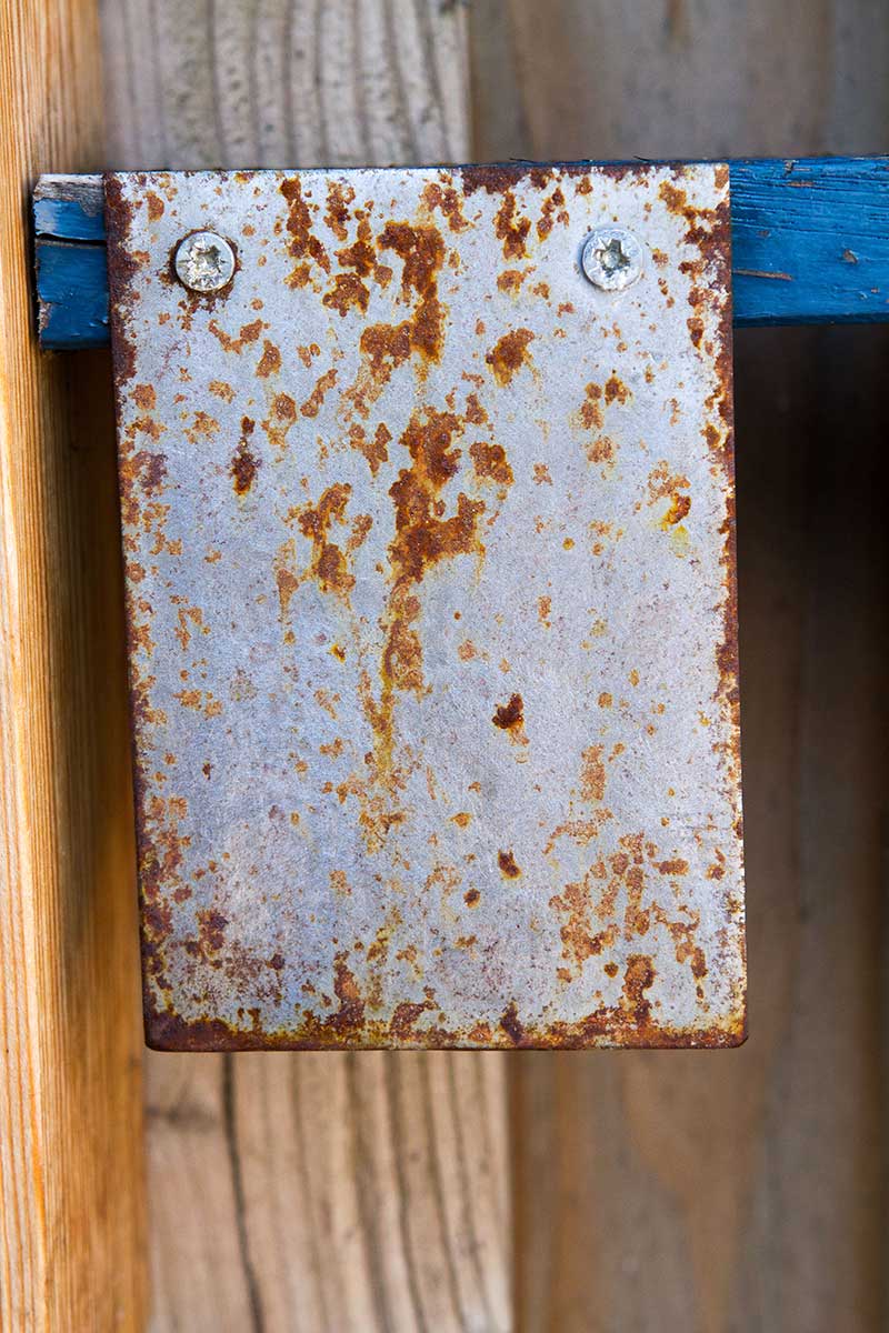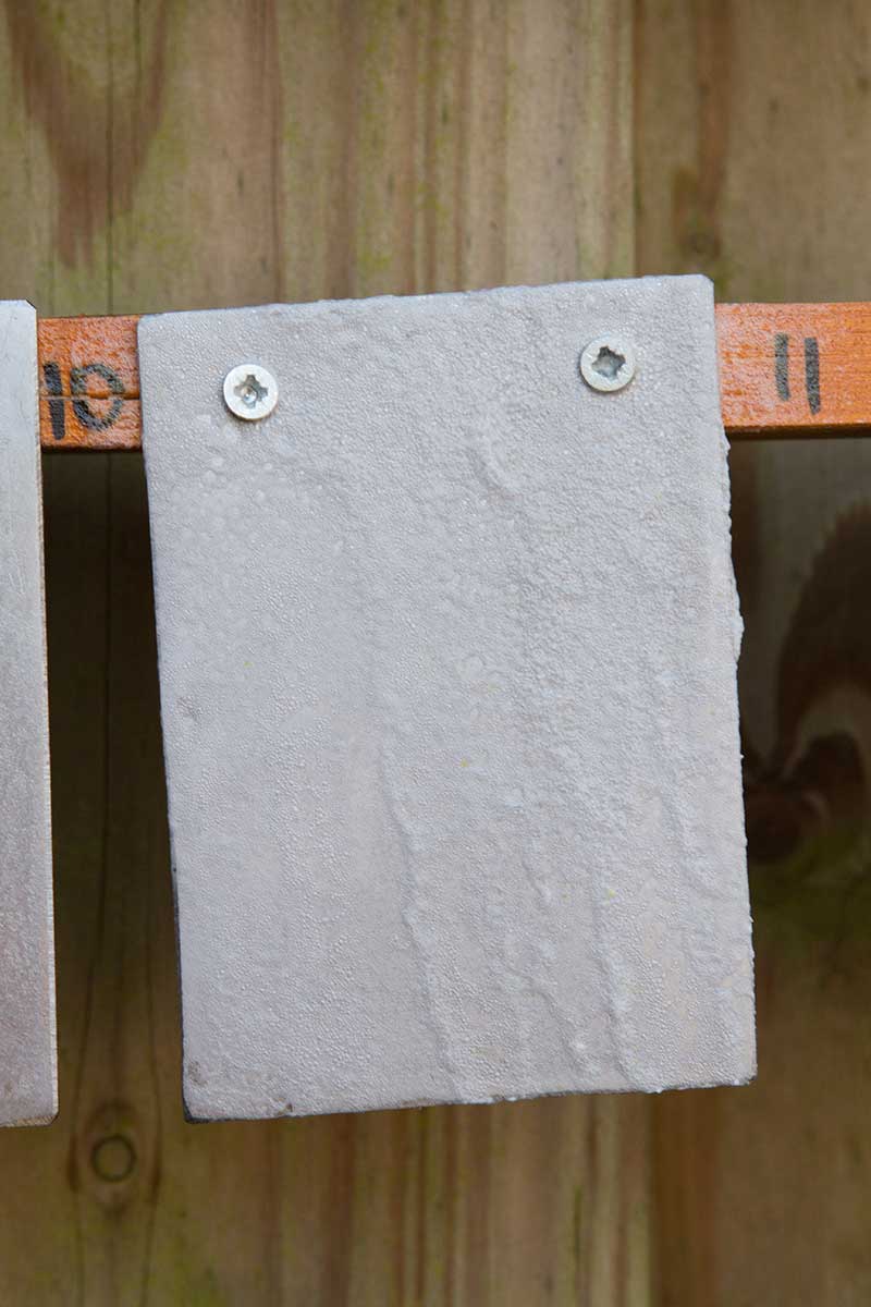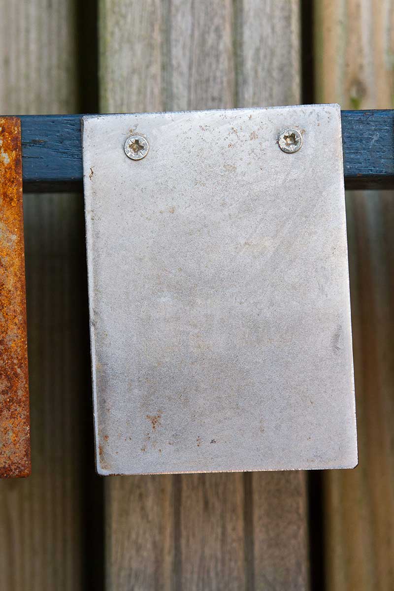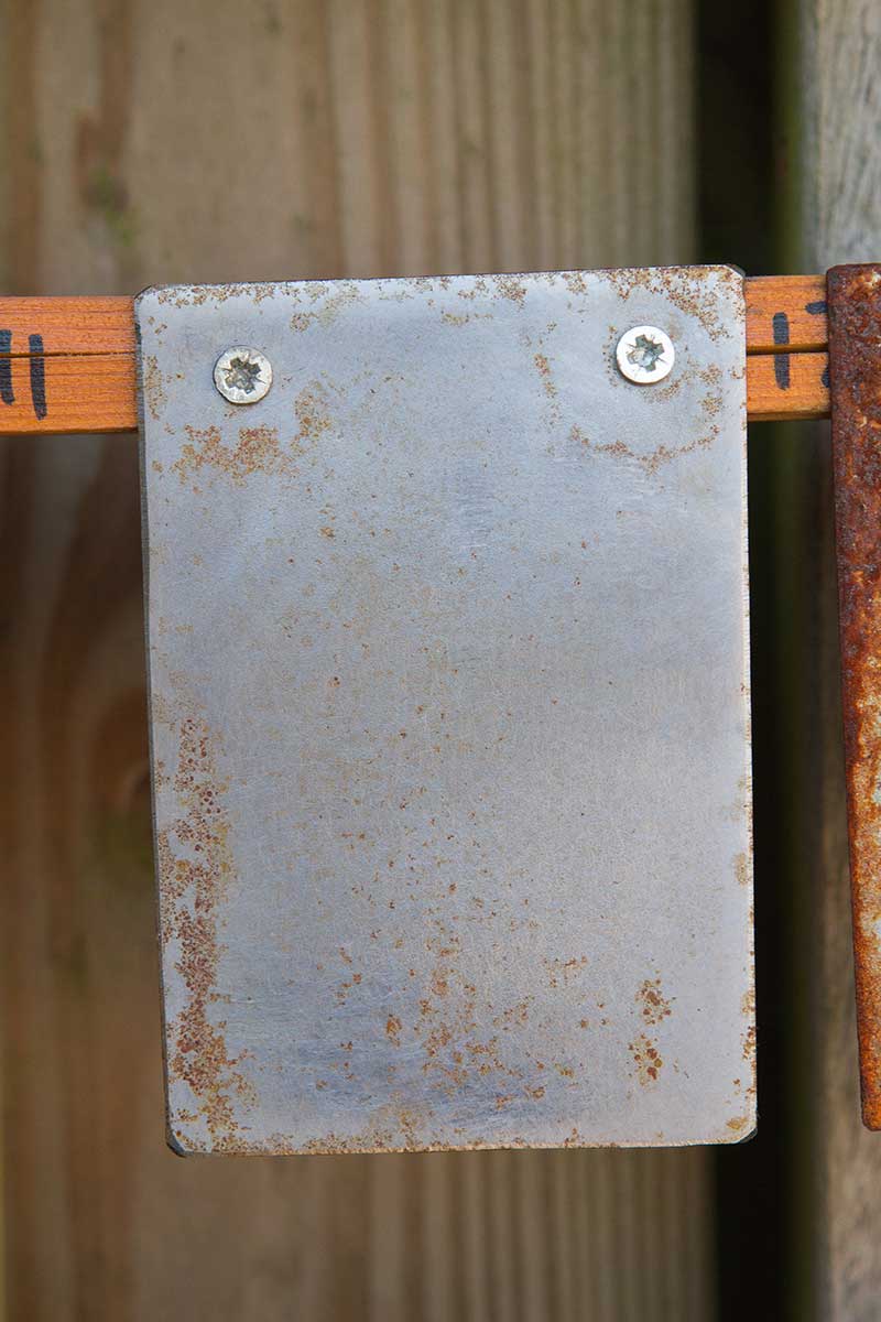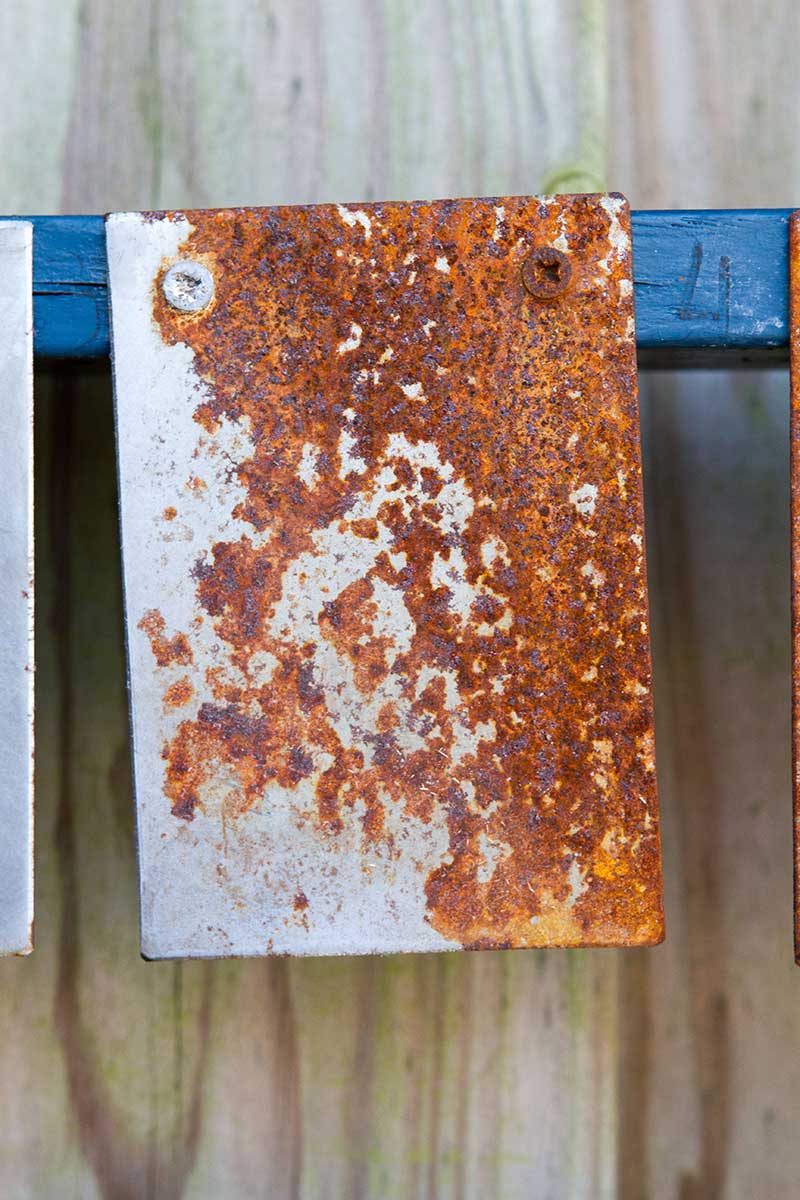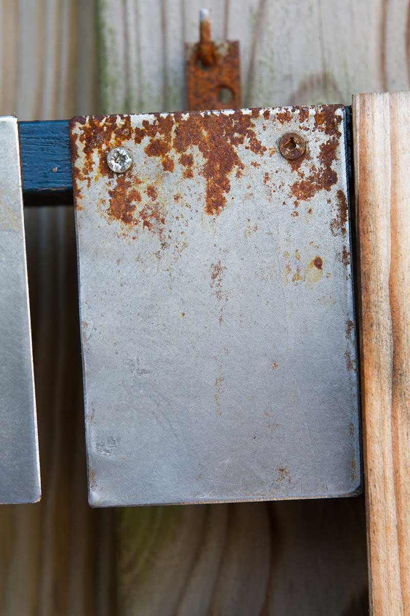 Voor de test heb je natuurlijk om te beginnen een roestvrije staalplaat nodig. De voorhanden zijnde pisbakkenijzeren plaat (ST37-2 of FE360) had lichte vliegroest, maar daar is een prachtige oplossing voor. Na opschuren werd de ijzerplaat ingesmeerd met een dikke laag Rustico. Een paar uur later werd de plaat schoongespoeld en was hij zo blank als sneeuwwitje na haar ochtendbad. Goed spul dus, dat Rustico! Vervolgens werd de plaat in plaatjes geknipt, ontbraamd, ontvet en ingespoten met de diverse corrosiewerende spuitproducten. Dan werden ze – samen met een kale, onbehandelde referentieplaat – op een speciaal daarvoor vervaardigd frame geschroefd, dat vlak naast de garage van ondergetekende tegen de tuinschutting werd geschroefd, bloot gesteld aan weer, wind en elektrische gitaarmuziek. En de plaatjes bleven zo onaangetast, want er miste nog één ingrediënt: pekel. Gewapend met strooizout en een plantenspuit aan de slag dus. Binnen enkele dagen verschenen de eerste corrosieculturen.