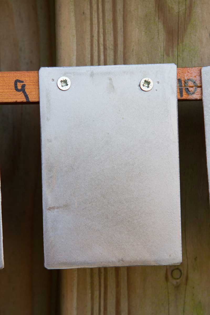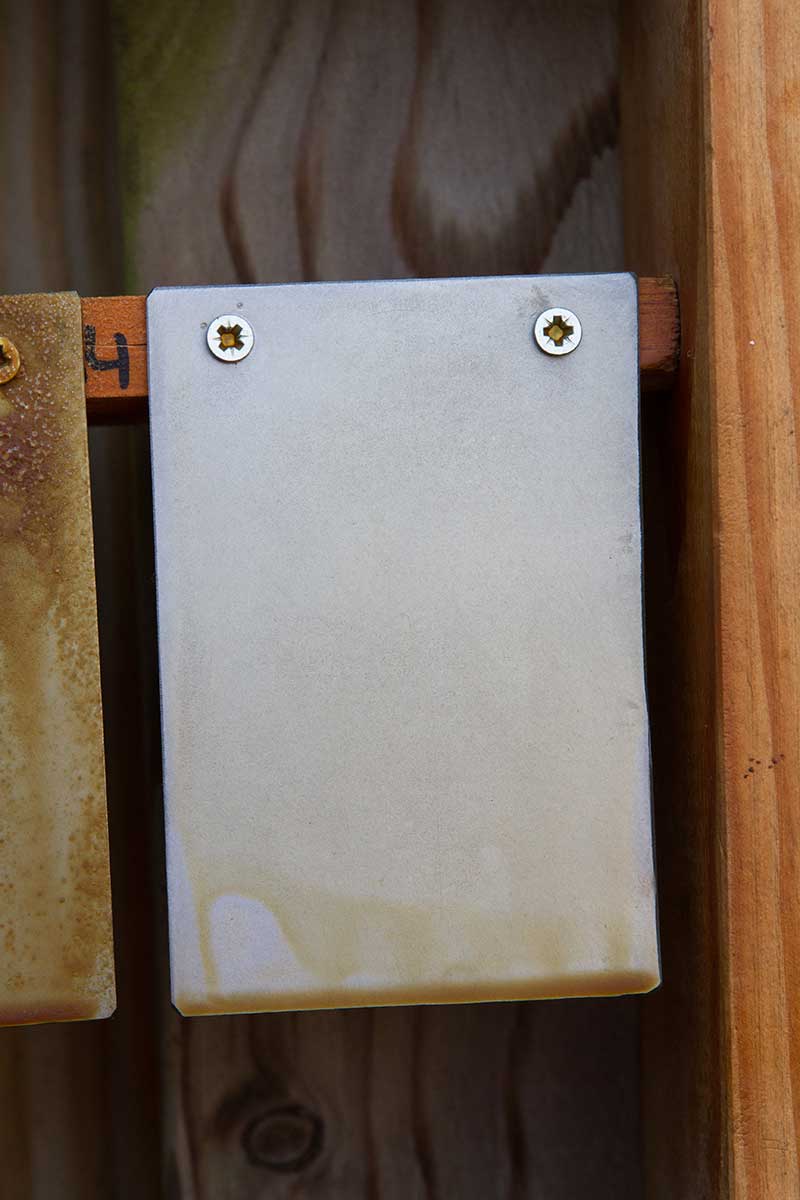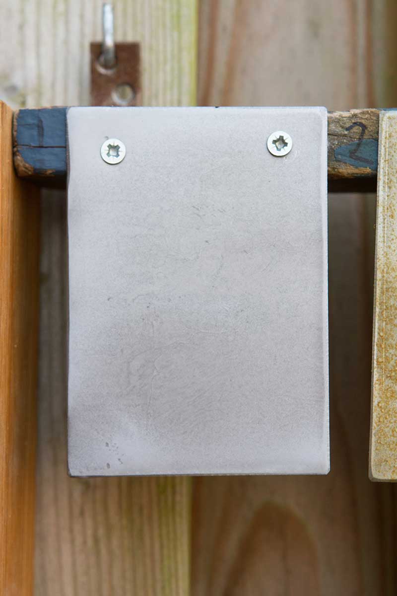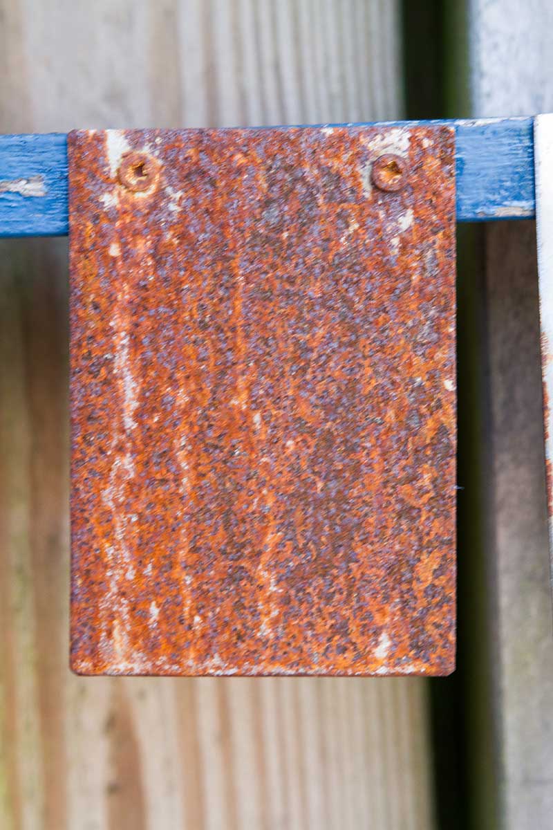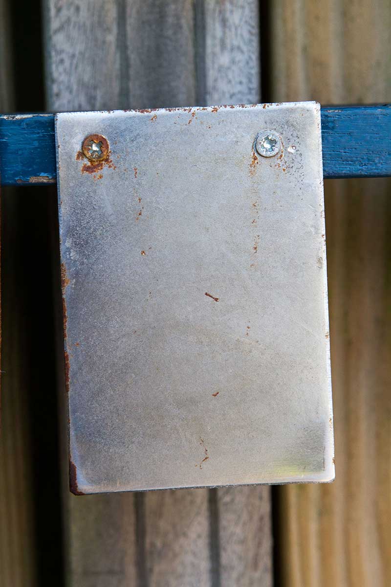 Voor de test heb je natuurlijk om te beginnen een roestvrije staalplaat nodig. De voorhanden zijnde pisbakkenijzeren plaat (ST37-2 of FE360) had lichte vliegroest, maar daar is een prachtige oplossing voor. Na opschuren werd de ijzerplaat ingesmeerd met een dikke laag Rustico. Een paar uur later werd de plaat schoongespoeld en was hij zo blank als sneeuwwitje na haar ochtendbad. Goed spul dus, dat Rustico! Vervolgens werd de plaat in plaatjes geknipt, ontbraamd, ontvet en ingespoten met de diverse corrosiewerende spuitproducten. Dan werden ze – samen met een kale, onbehandelde referentieplaat – op een speciaal daarvoor vervaardigd frame geschroefd, dat vlak naast de garage van ondergetekende tegen de tuinschutting werd geschroefd, bloot gesteld aan weer, wind en elektrische gitaarmuziek. En de plaatjes bleven zo onaangetast, want er miste nog één ingrediënt: pekel. Gewapend met strooizout en een plantenspuit aan de slag dus. Binnen enkele dagen verschenen de eerste corrosieculturen.