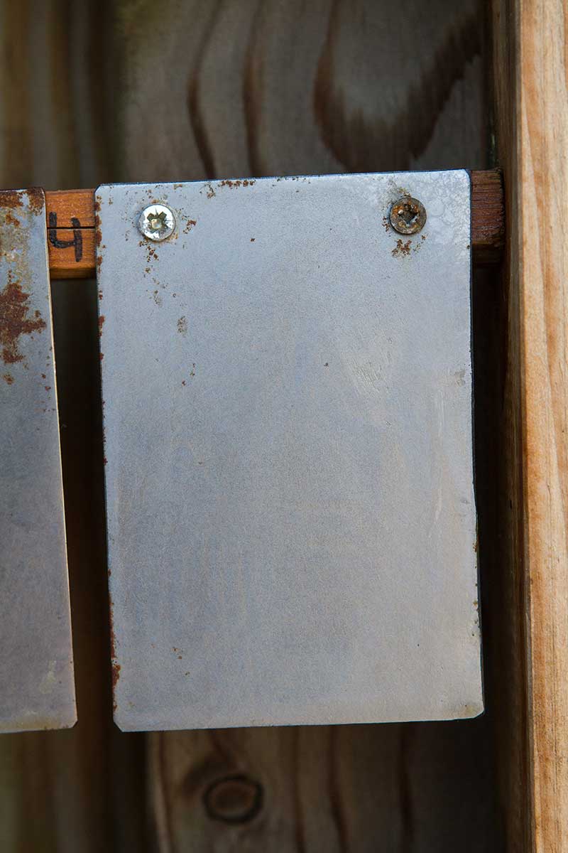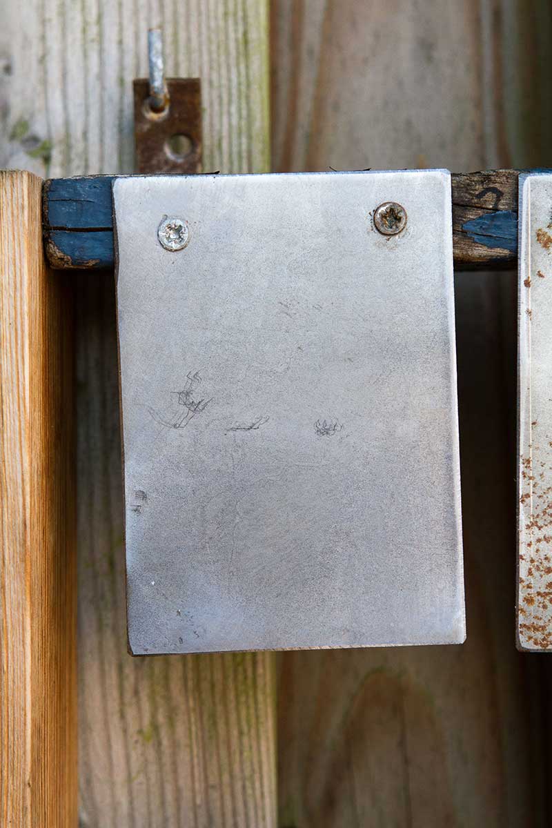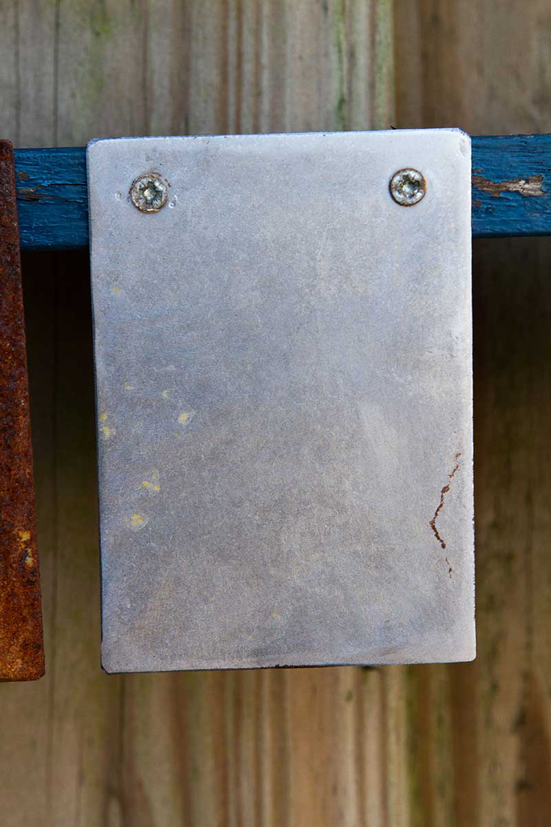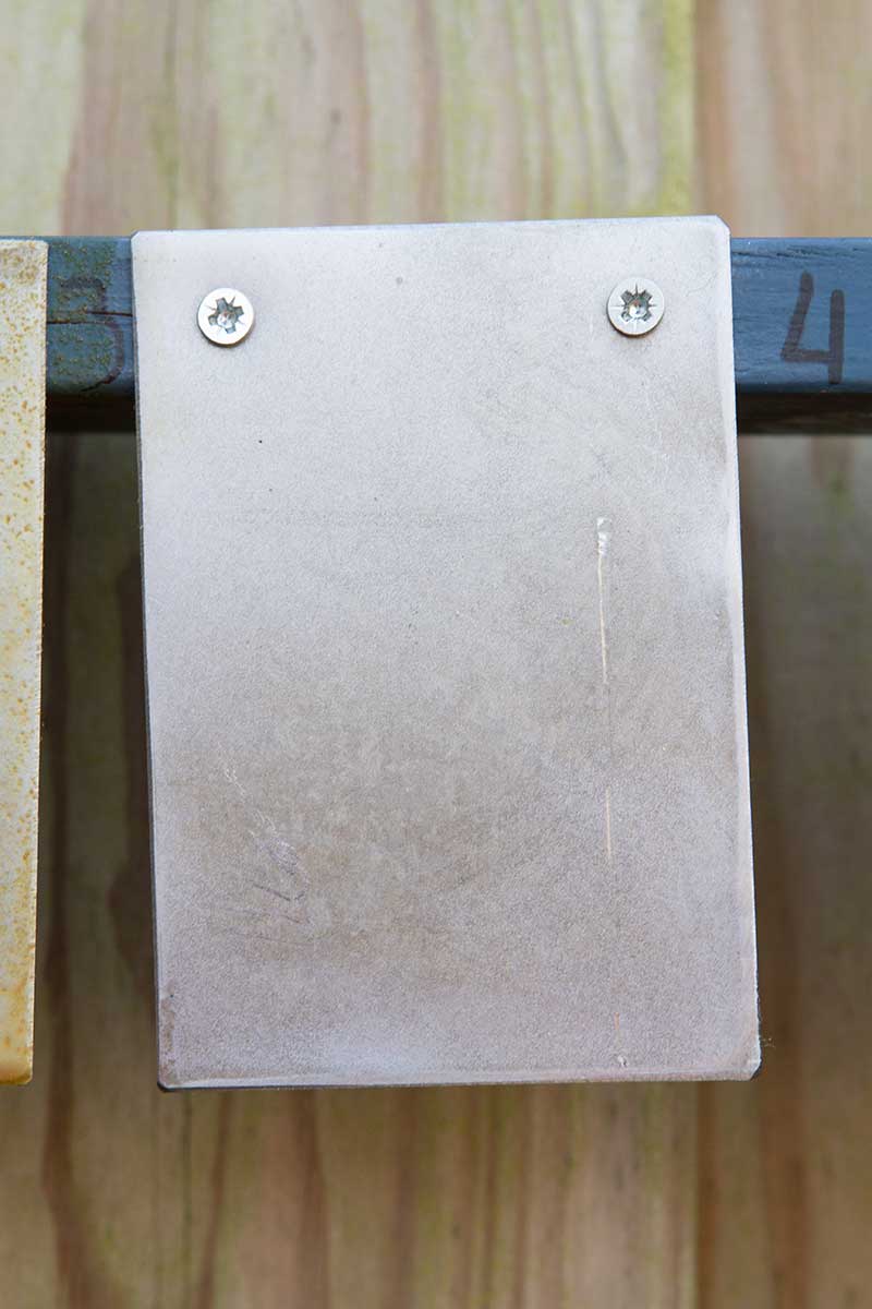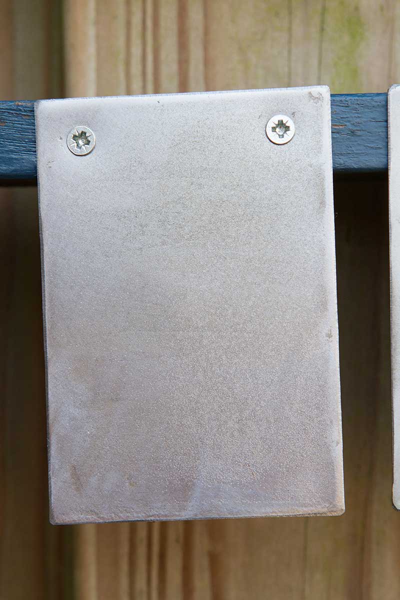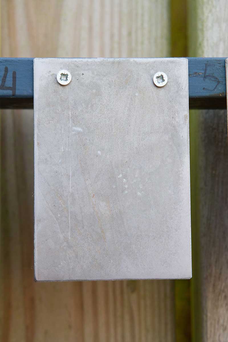 Voor de test heb je natuurlijk om te beginnen een roestvrije staalplaat nodig. De voorhanden zijnde pisbakkenijzeren plaat (ST37-2 of FE360) had lichte vliegroest, maar daar is een prachtige oplossing voor. Na opschuren werd de ijzerplaat ingesmeerd met een dikke laag Rustico. Een paar uur later werd de plaat schoongespoeld en was hij zo blank als sneeuwwitje na haar ochtendbad. Goed spul dus, dat Rustico! Vervolgens werd de plaat in plaatjes geknipt, ontbraamd, ontvet en ingespoten met de diverse corrosiewerende spuitproducten. Dan werden ze – samen met een kale, onbehandelde referentieplaat – op een speciaal daarvoor vervaardigd frame geschroefd, dat vlak naast de garage van ondergetekende tegen de tuinschutting werd geschroefd, bloot gesteld aan weer, wind en elektrische gitaarmuziek. En de plaatjes bleven zo onaangetast, want er miste nog één ingrediënt: pekel. Gewapend met strooizout en een plantenspuit aan de slag dus. Binnen enkele dagen verschenen de eerste corrosieculturen.