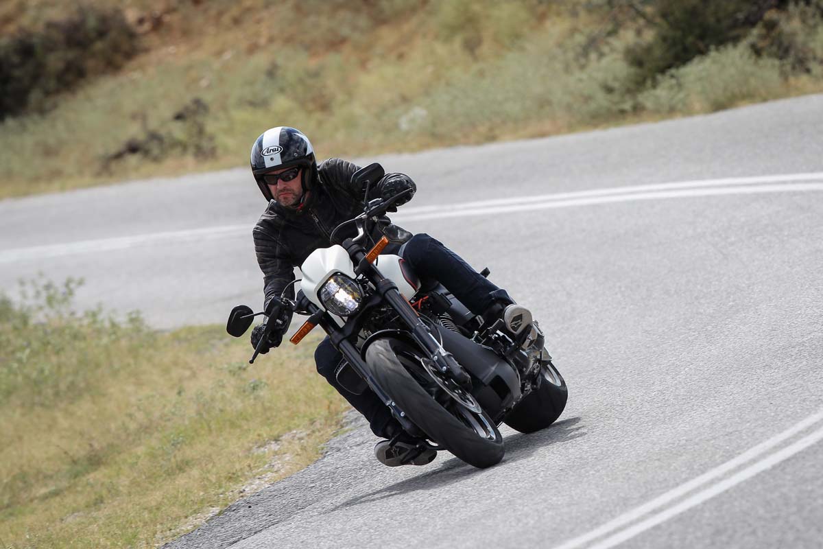 De FXDR 114 mag dan in vergelijking met echt sportieve motorfietsen natuurlijke bochtenvreter zijn, maar er ver naast ziet. Ie ook niet. Voor Harley-Davidson begrippen zitten de steps aan de hoge kant en is de motor enorm makkelijk de bocht in te sturen. Zelfs snel opeenvolgende links-rechts combinaties neemt de FXDR met gemak, ook door de eerder genoemde aluminium wielen en het feit dat deze Harley standaard vrij hard is afgeveerd. Iets wat tijdens snel bochtenwerk heel leuk is, maar op de slechte wegen die we in Griekenland te verstouwen kregen, vroeg ik me regelmatig af of ik geen hardtail onder mijn gat had. Waar is de niergordel als je hem nodig hebt?