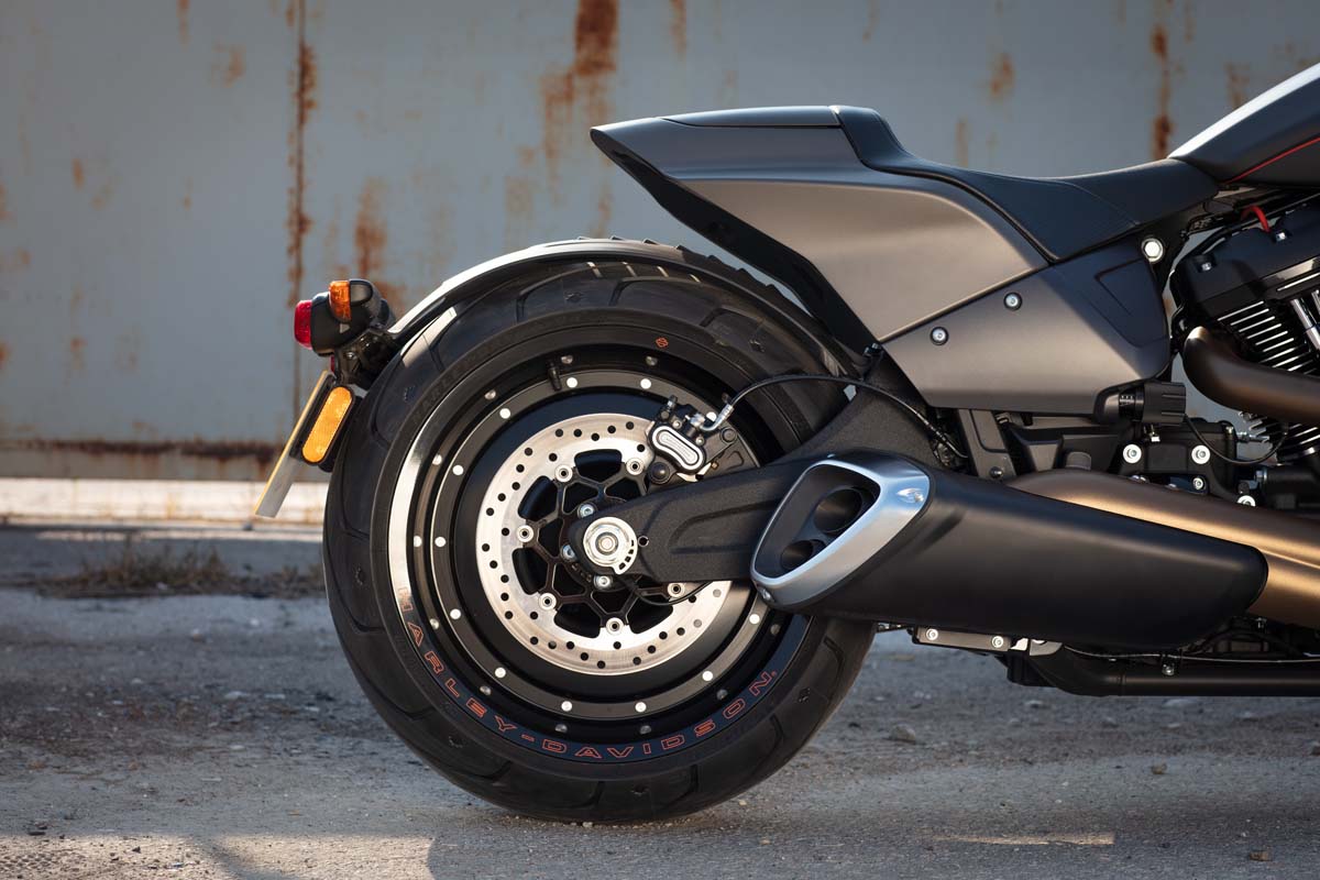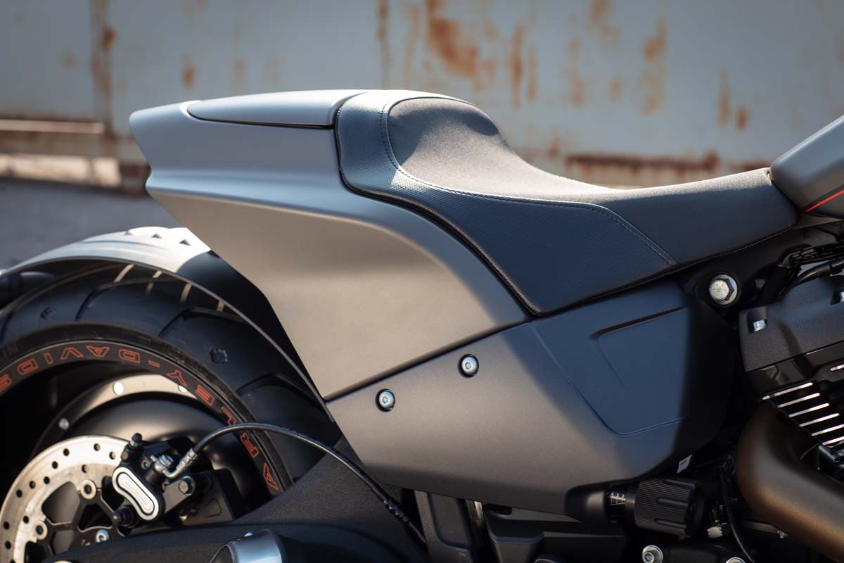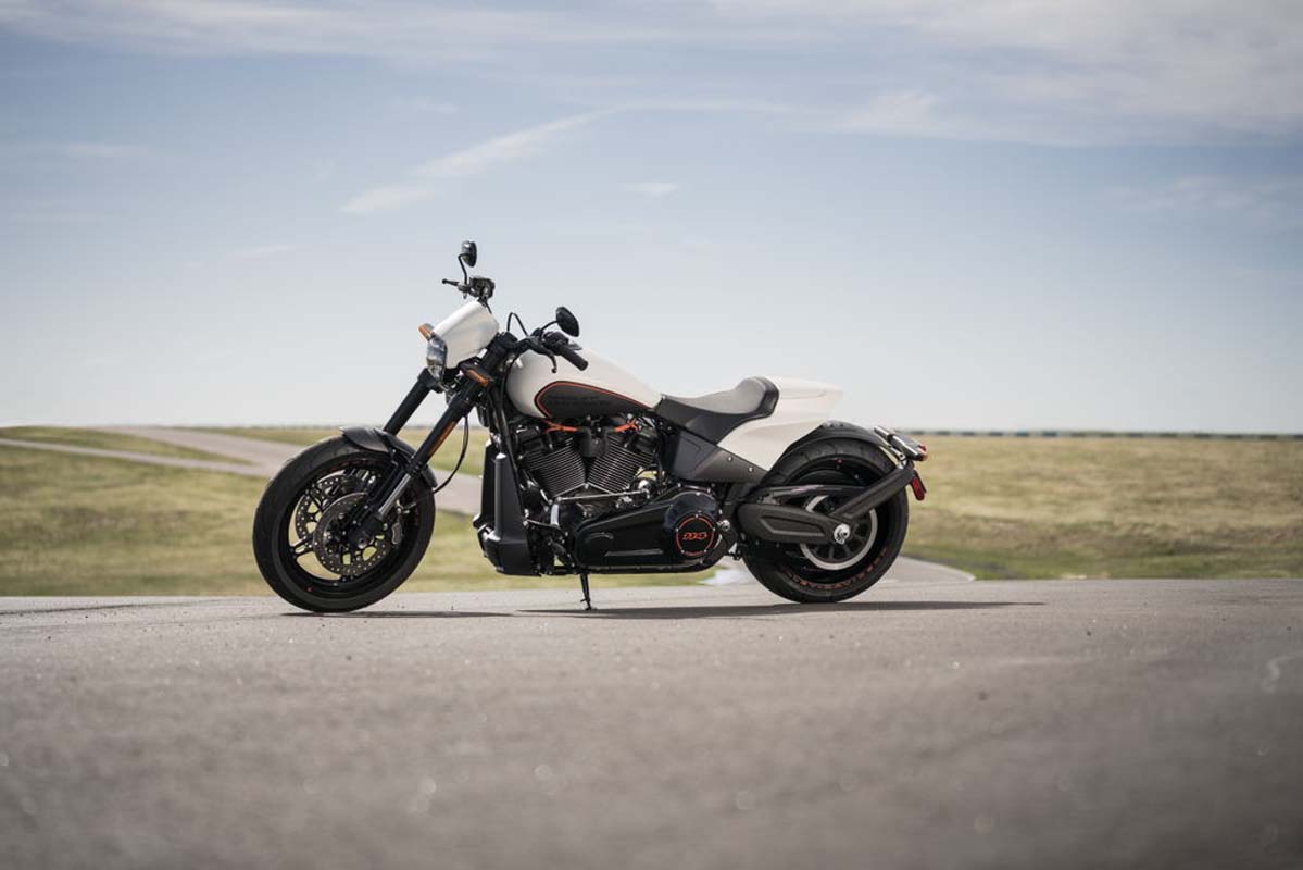 De FXDR is met zijn lange, lage voorkomen en 240mm achterband ook een dragster om te zien. Wat dat nog verder benadrukt wordt door de iets vooruit geplaatste voorvork, mono-seat en zeer korte achterpartij.