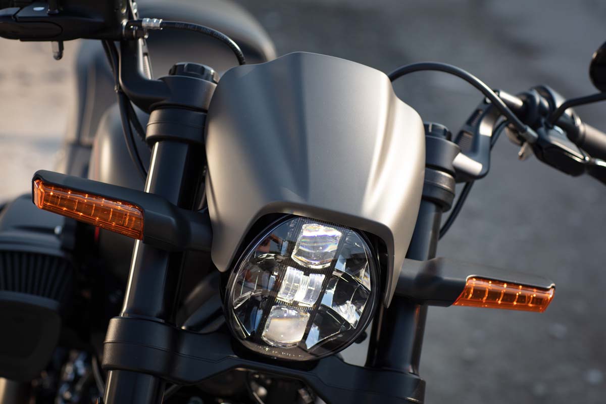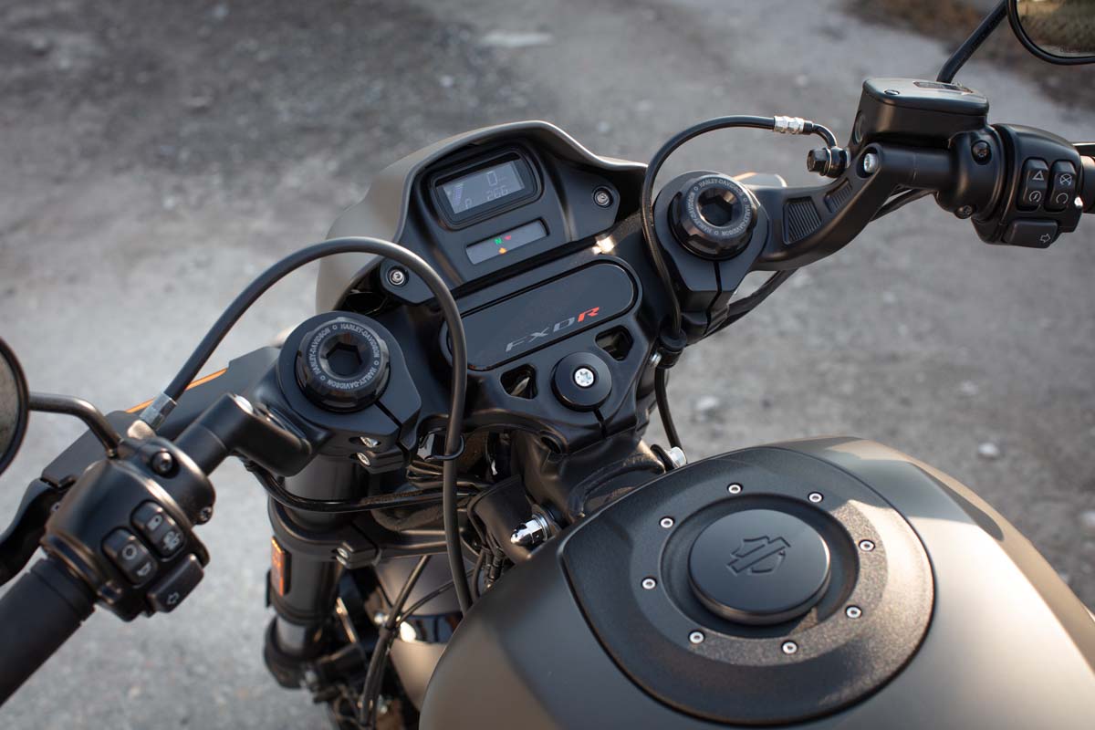 Opvallend is de afwerking. Naar draden en stekkertjes moet je echt goed zoeken. Op het stuur is het daardoor opvallend rustig. De motor heeft clip-ons, iets dat je af-fabriek niet vaak ziet bij het Amerikaanse merk, maar die in dit geval het sportieve uiterlijk van deze krachtpatser wel af maken. Beide helften staan genoeg naar binnen gebogen waardoor het stuur ook goed in de hand ligt. Tussen de stuurhelften zit het instrumentenpaneel, mooi weggewerkt achter een klein bikini-topje. Het is een redelijk klein display, maar duidelijk afleesbaar zijn de standaard voorgeschotelde digitale snelheidsmeter en de versnellingsindicatie. Voor de rest zie je slechts twee remleidingen, alle overige draden zijn allemaal weggewerkt in de stuurhelften.