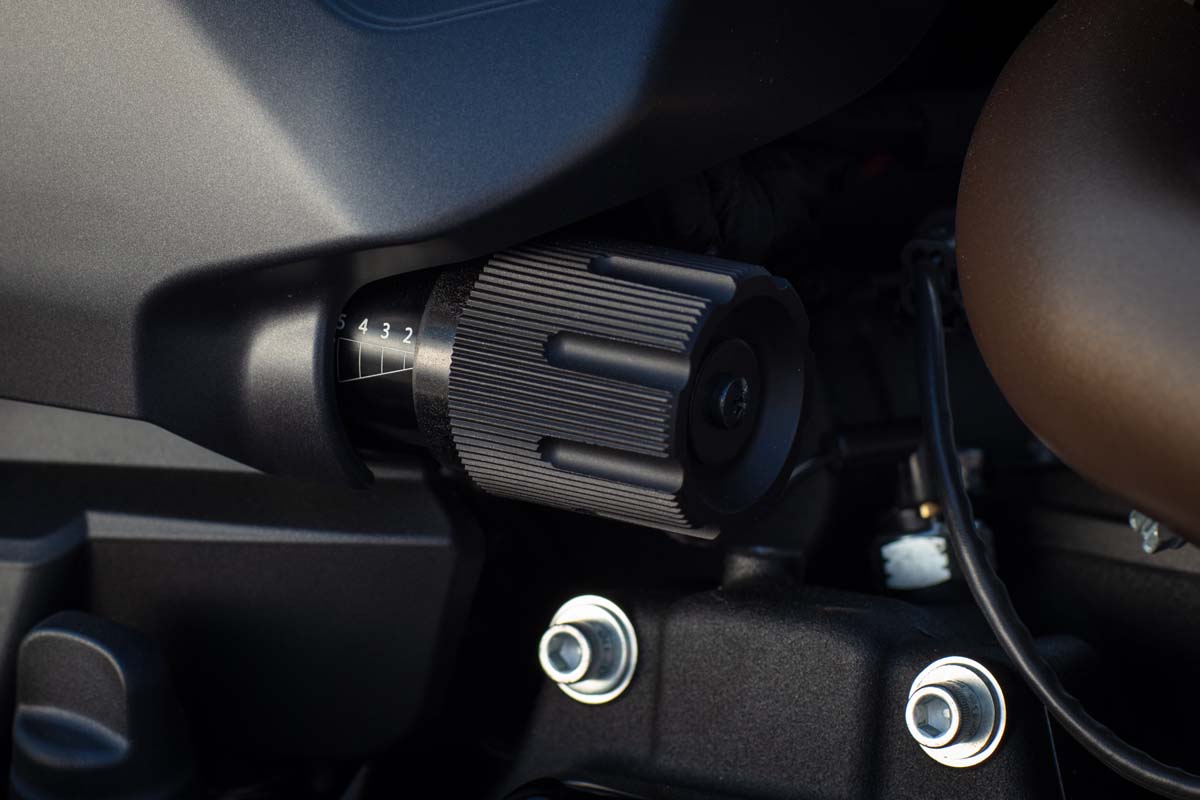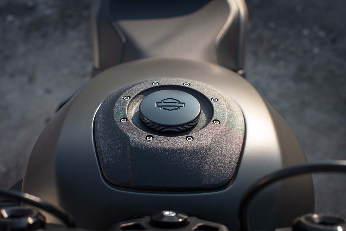 Mooi vind ik zelf ook de langgerekte tank, met een nogal opvallende vulopening. Een onderdeel dat bij Harley normaal gesproken zoveel mogelijk in de stroomlijn van de tank is weggewerkt, maar dat gelet op het sportieve karakter dit keer wel in het oog mag springen.