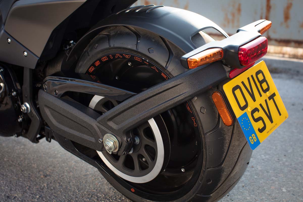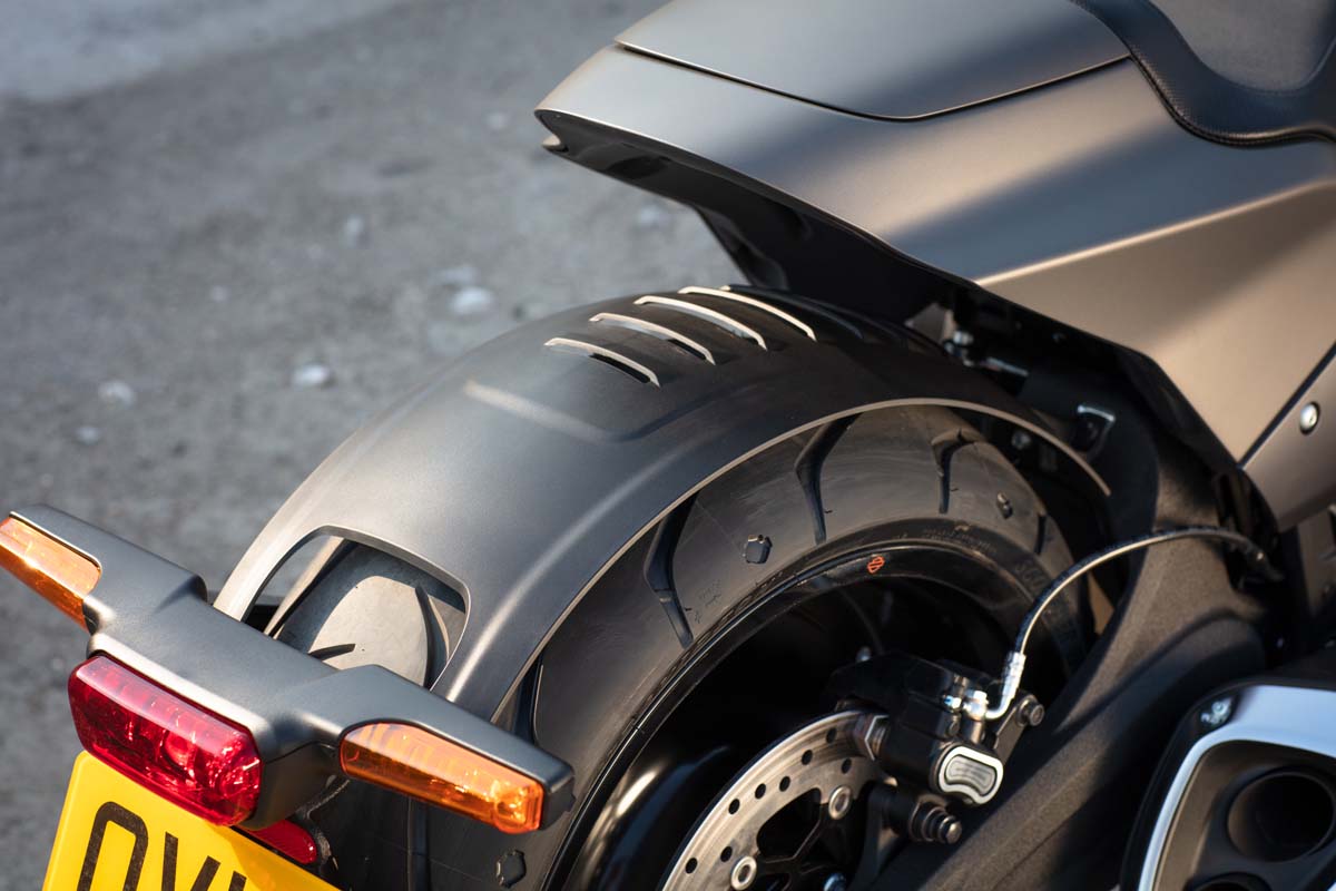 Wel zijn er wat zaken die ik persoonlijk onmiddellijk aan zou passen. Als eerste natuurlijk de 2-in-1 uitlaat. Die is naar mijn mening niet lelijk, maar hij kan vooral veel beter klinken. Nu schiet er af en toe door je hoofd dat je ergens achter je een oude Kever hoort rijden. Dus direct een Screamin’ Eagle monteren. Dat zet geluidstechnisch de puntjes echt op de i. Daarnaast staat ook de kentekenplaathouder op de verwijderlijst. De achterkant is echt het mooiste deel van de FXDR en als de verplichte aflevering met deze kentekenplaathouder achter de rug is, wordt de Harley met een zijplaathouder nog veel indrukwekkender. Al moet ik wel even de ontwerpers complimenteren met de uitvoering van het spatbord. Het loopt zo mooi mee met de lijn van de band en is zo gitzwart uitgevoerd, dat je ‘m bijna over het hoofd zou zien.