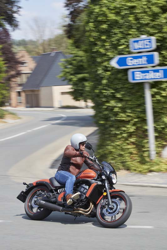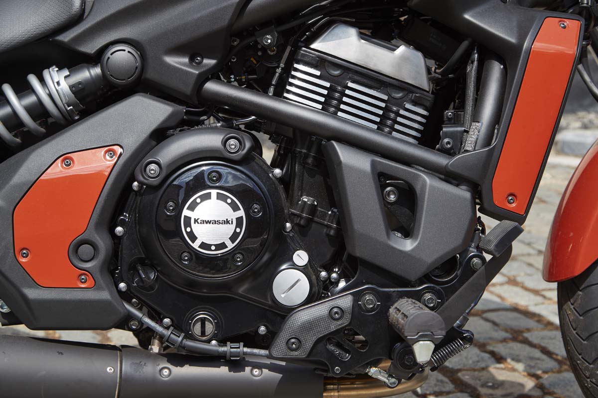 Maar wat krijg je nou voor de overige €9.049,- die je voor een S en €9.249,- die je voor een SE (tweekleuren lak en sierstrepen op de velg) betalen moet? Om met het uiterlijk te beginnen: een netjes afgewerkte motor die qua uitvoering weliswaar vrij basaal is en waarvan toch wel veel delen van plastic zijn, maar die er in het matzwart stoer en er in het two-tone chique uit ziet. Oké, de prijs is er ook naar, maar het basisbeginselen van een cruiser zijn dat het een lust voor het oog moet zijn en dat hij er best duur uit mag zien. Dat hebben ze bij Kawasaki goed begrepen. Een aantal zaken die in het oog springen zijn de vorm van de gegoten wielen, de weggewerkte kabeltjes en slangetjes en een keurig strak blok. Dat blok wordt dan wel door vloeistof gekoeld, maar de cilinders hebben optische koeling van de koelribben en de radiator zit mooi opgesloten in een designtechnisch verantwoord omhulsel.