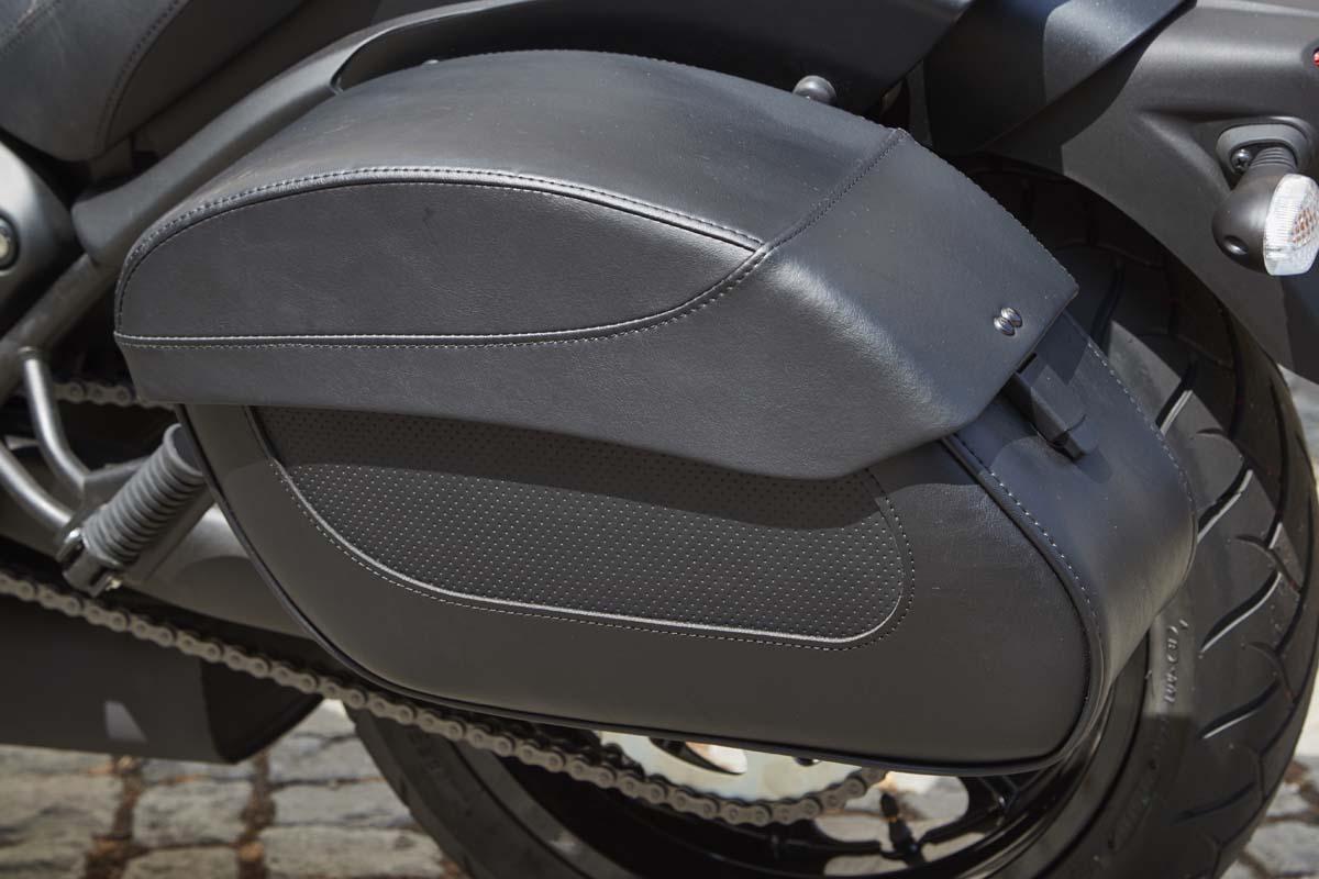 Wat losse spullen in de (niet afsluitbare) leren koffers en gáán. Rijdend verdwijnt dat gevoel niet. De zithouding in standaard trim lijkt comfortabel genoeg om de snode plannen uit te voeren. Er is ruimte genoeg, geen enkele moment heb je het idee opgevouwen te zitten in een foetus houding of dat het zadel in je gat priemt zoals zo vaak op cruisers. En het scherm neemt genoeg winddruk weg, zodat de zonnebril alleen op hoeft omdat de zon zo uitbundig schijnt. Het produceert ook weinig turbulenties en herrie rond je helm zodat het niet erg is als je je oordopen vergeten bent.