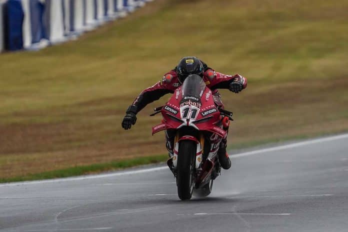 Nicolò Bulega ging zwemmend over de finish na zijn zege in de natte tweede race.